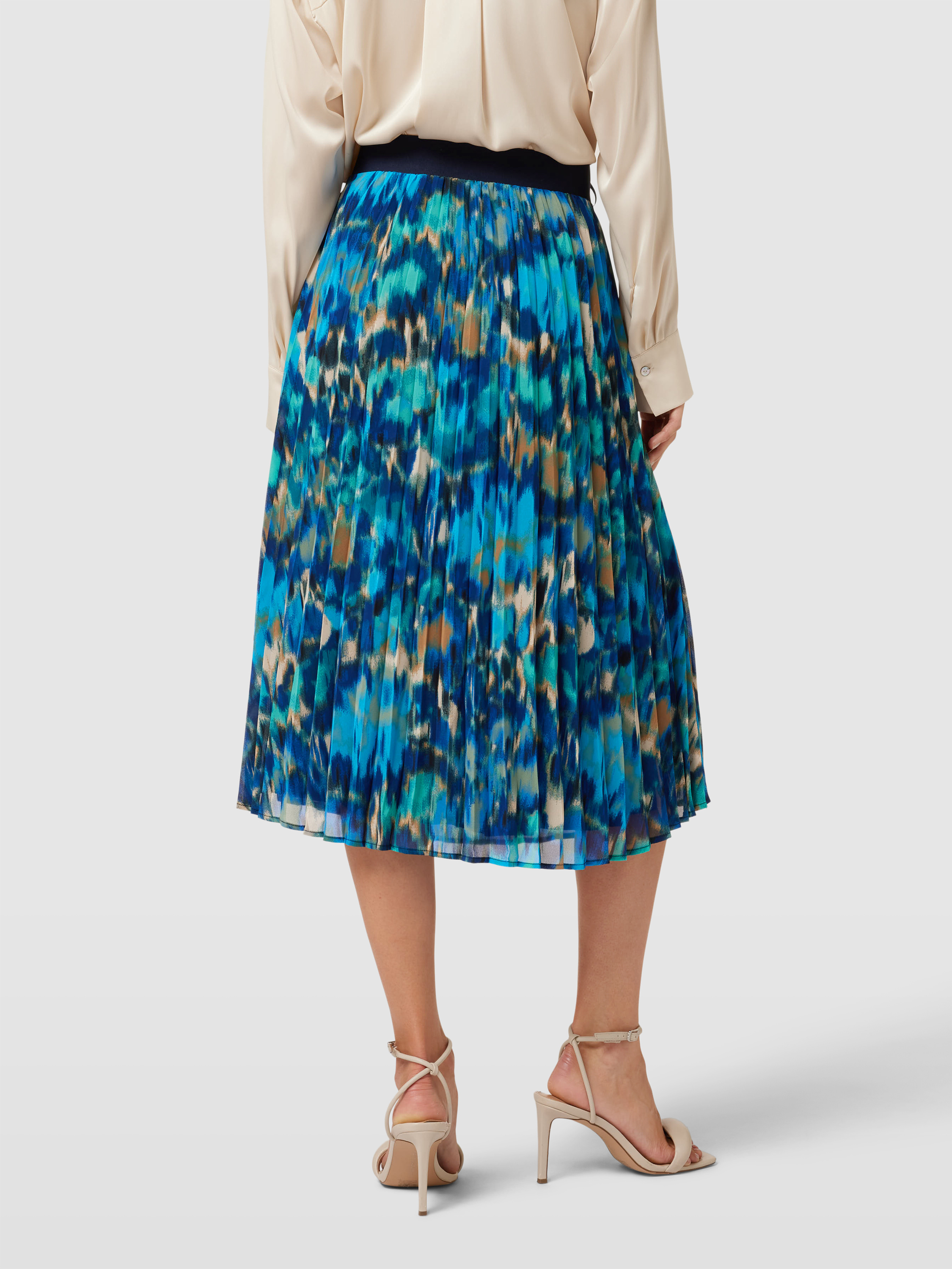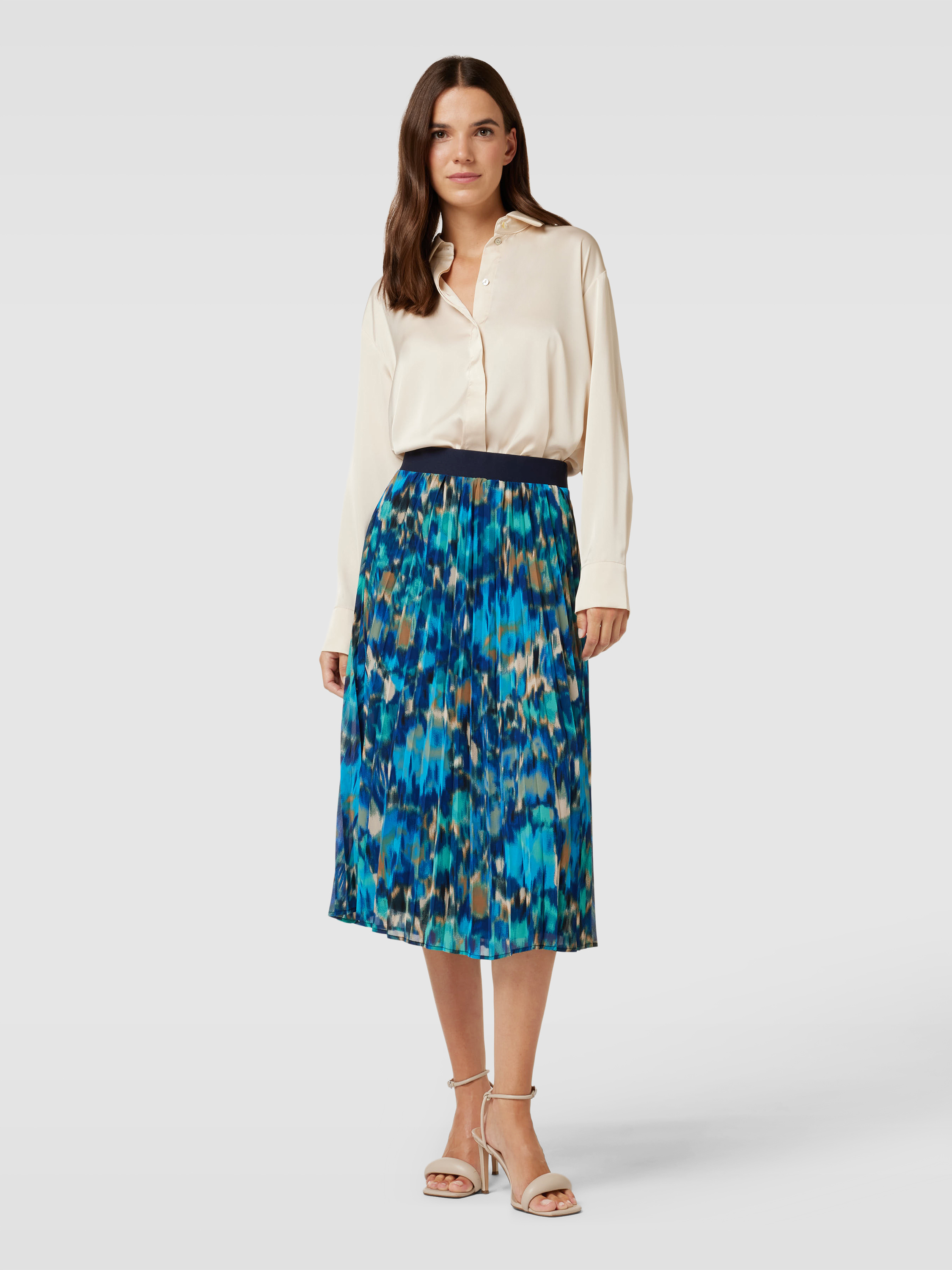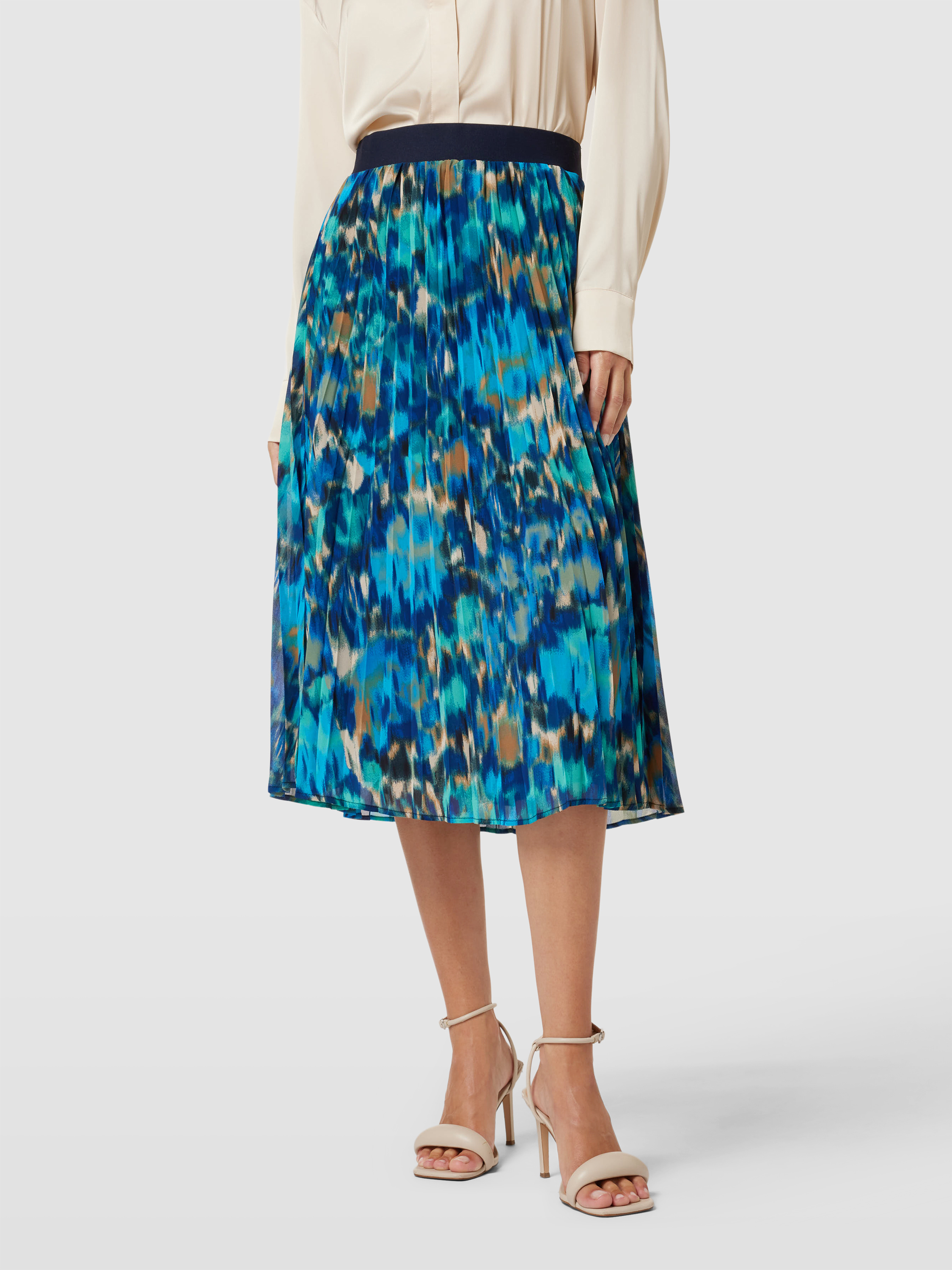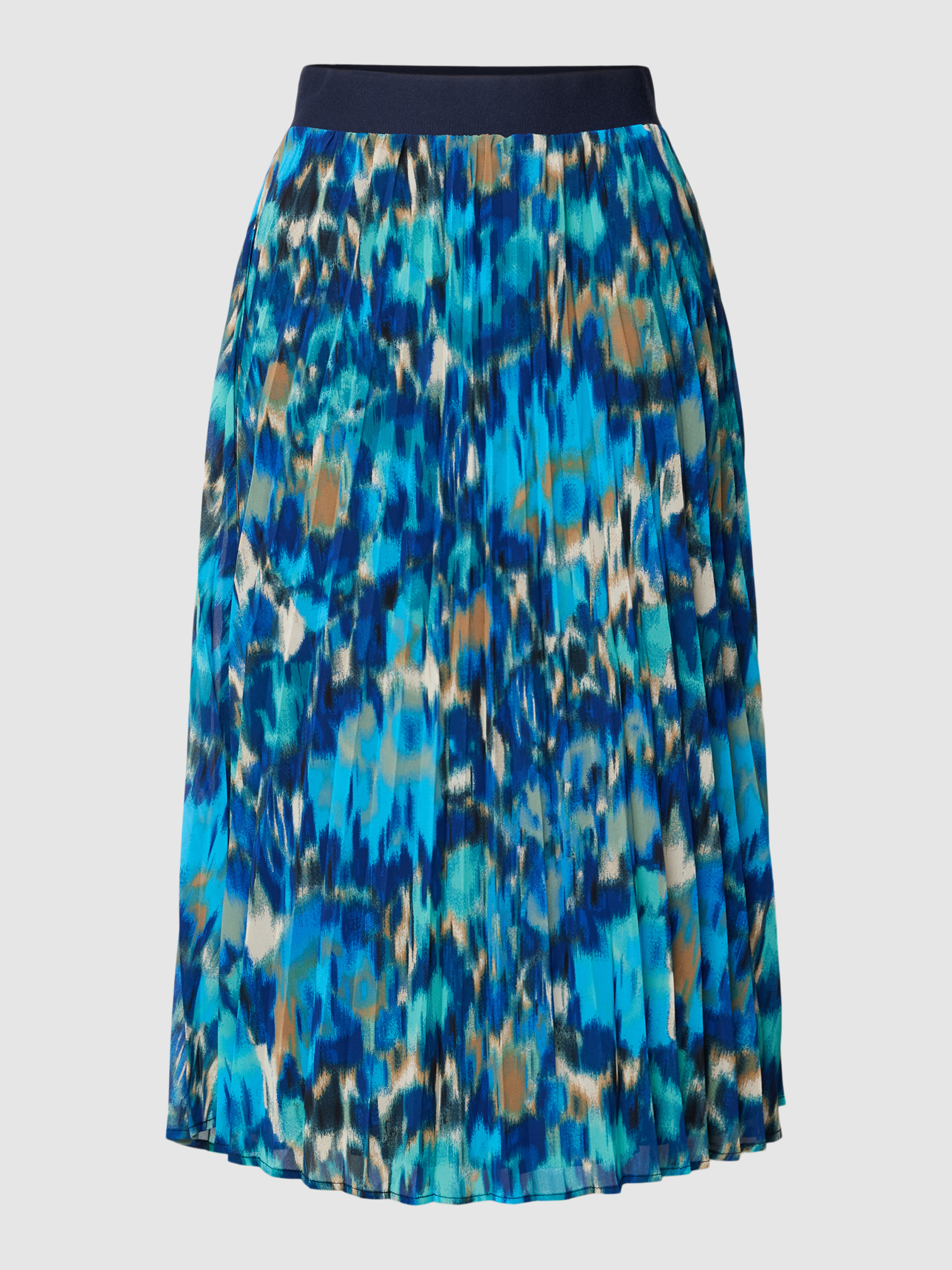 Der Midirock von s.Oliver RED LABEL, Modell 'Aqua', verbindet einen geraden Schnitt mit einem lebendigen Allover-Muster. Die zarten Plisseefalten verleihen ihm eine dynamische Struktur, während der flexible Bund für angenehmen Tragekomfort sorgt. Dieser Rock eignet sich hervorragend für vielseitige Gelegenheiten.