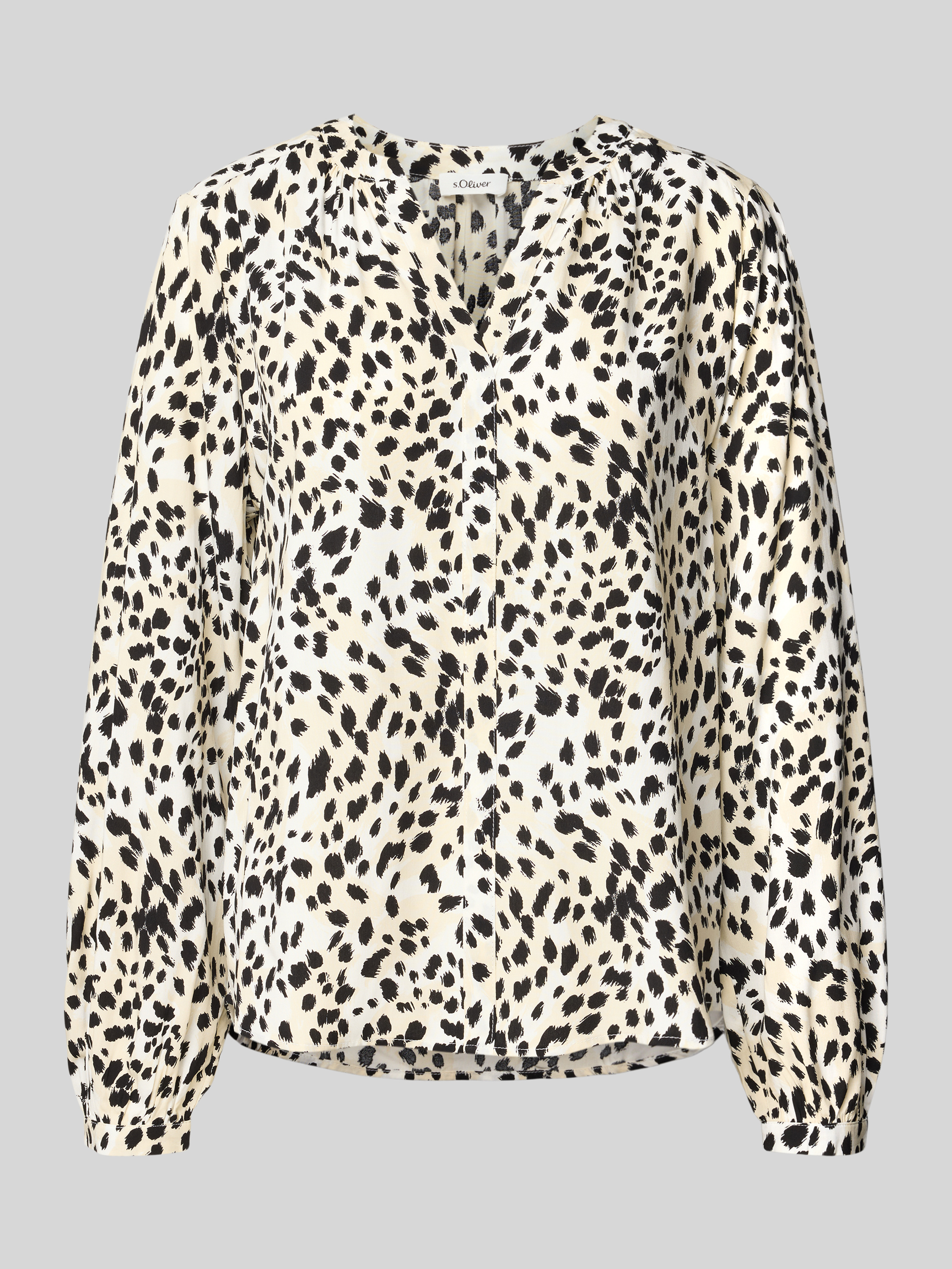 Die Regular Fit Bluse von s.Oliver RED LABEL kombiniert einen lässigen Schnitt mit einer feinen Webstruktur aus reiner Viskose, die angenehm auf der Haut liegt. Das Allover-Muster und die Ballonärmel verleihen der Bluse eine besondere Note, während der Tunika-Kragen und der V-Ausschnitt für eine luftige Eleganz sorgen. Ideal für vielseitige Outfits im Alltag.
