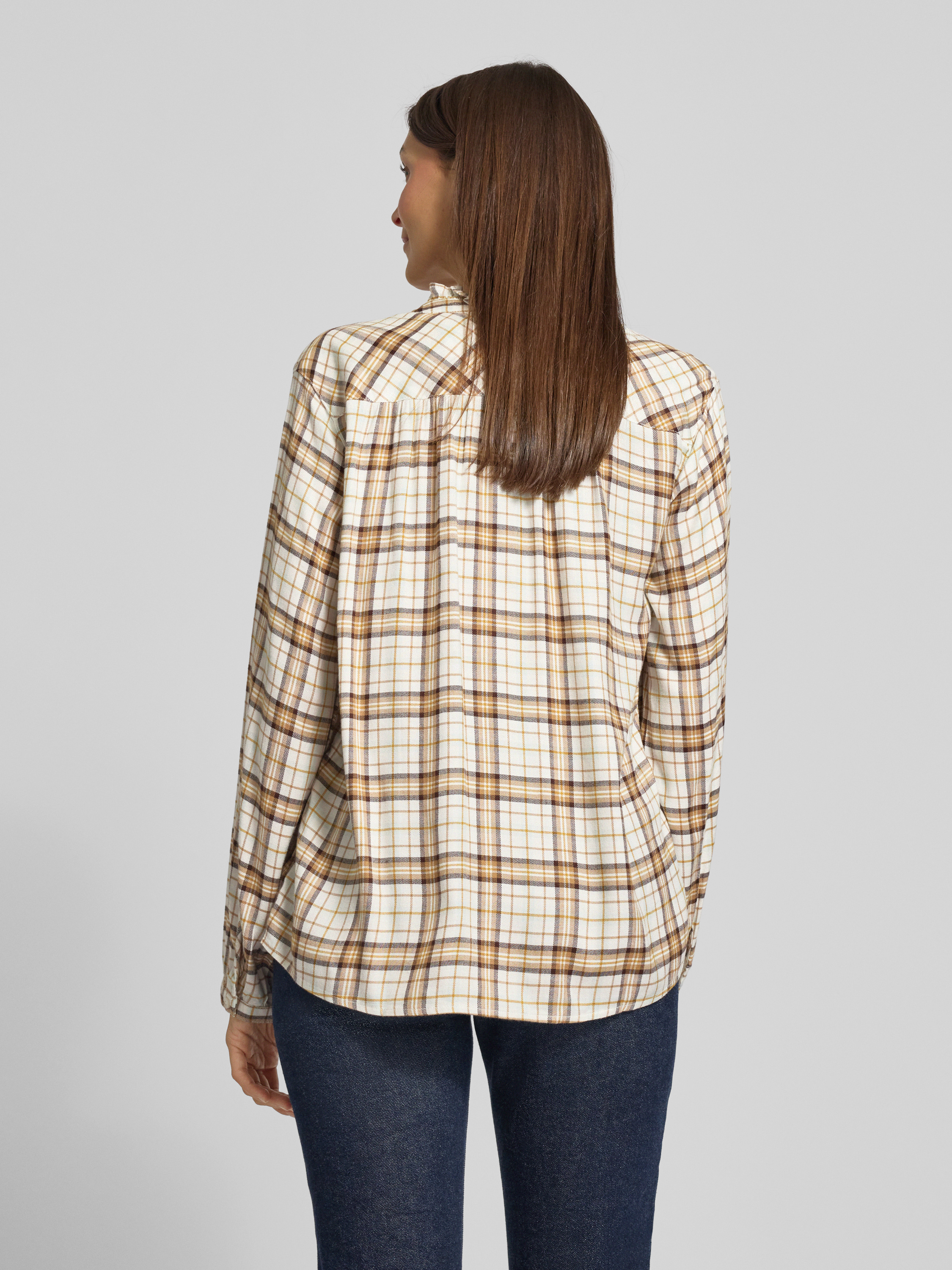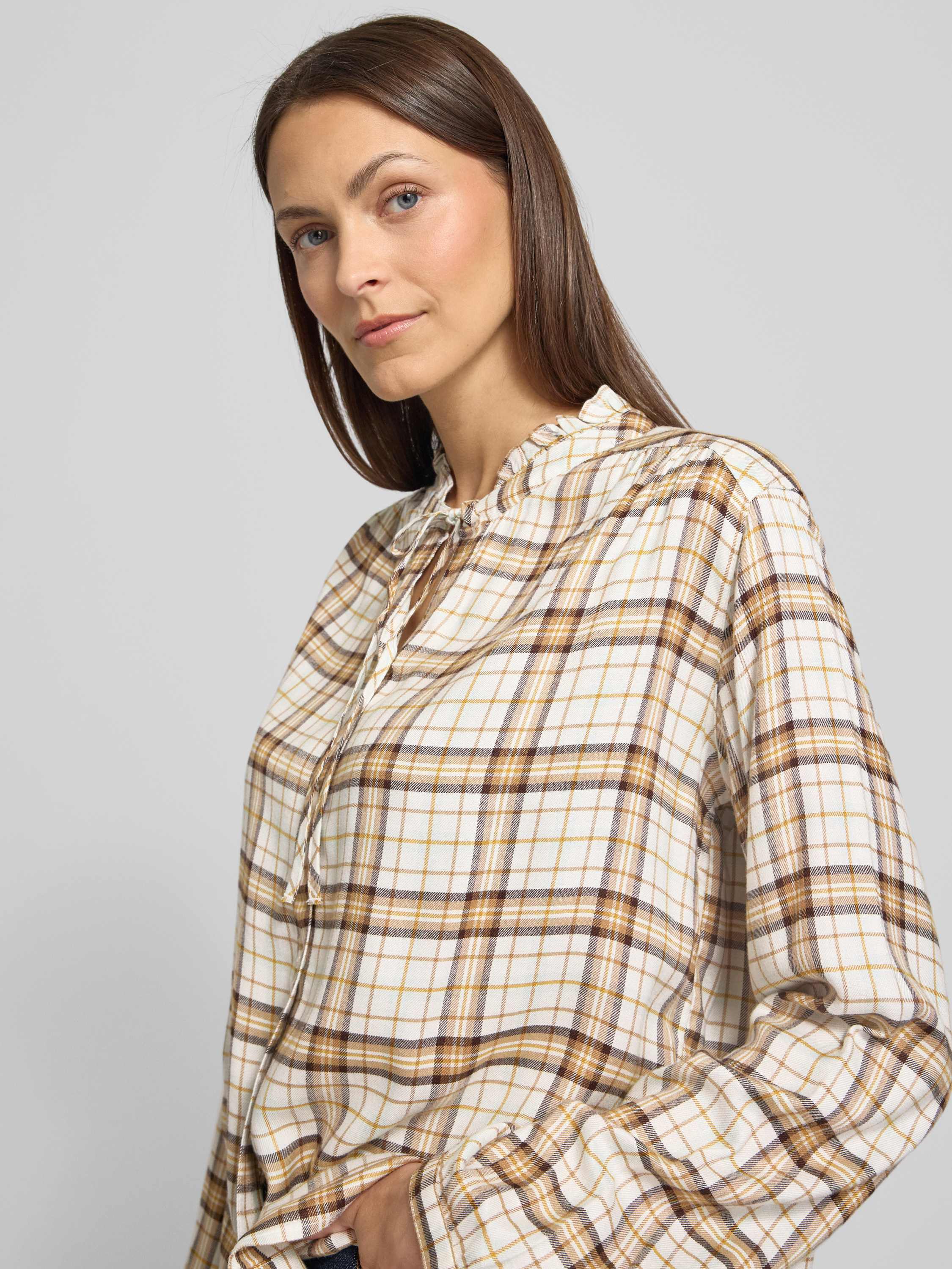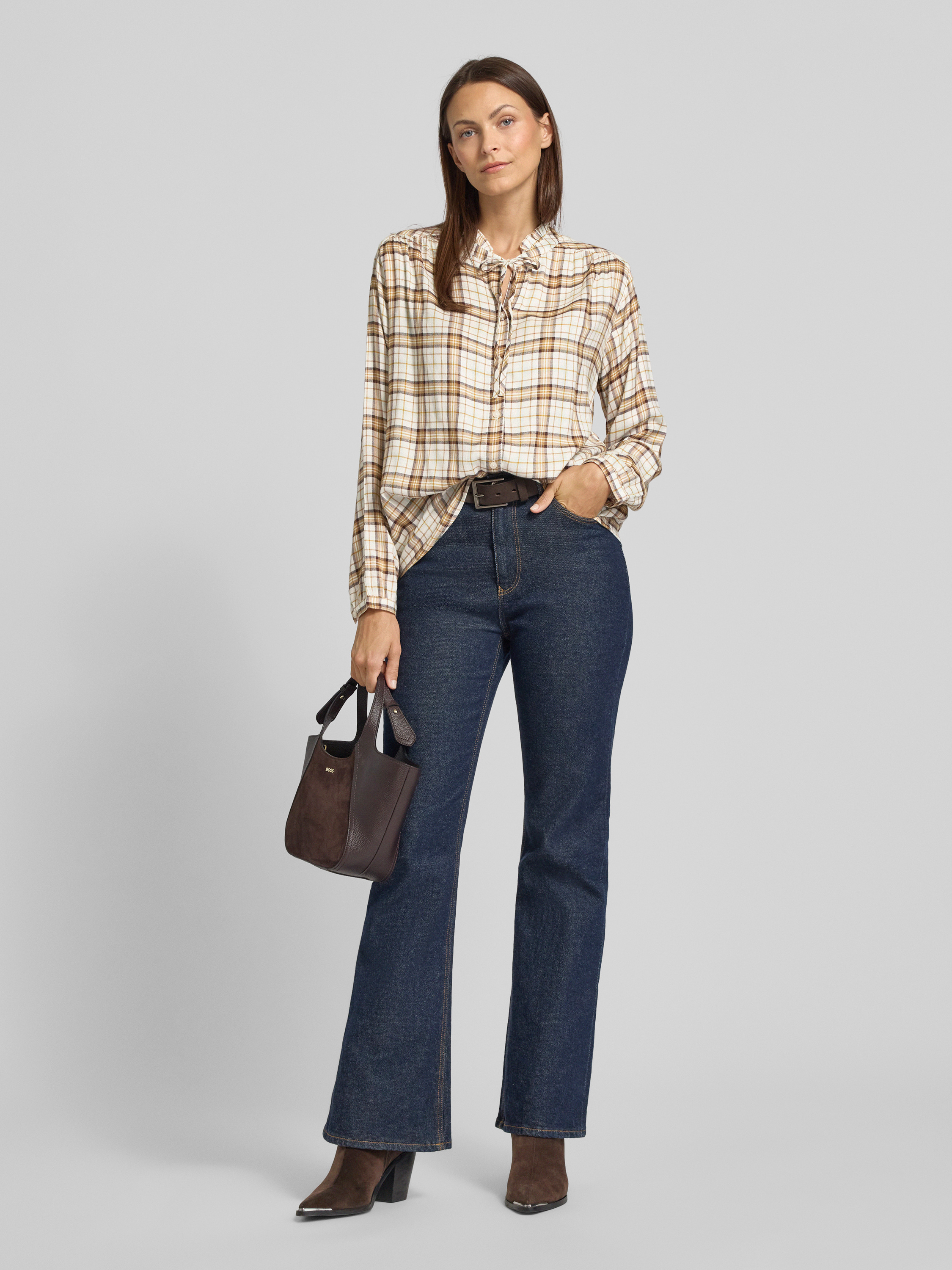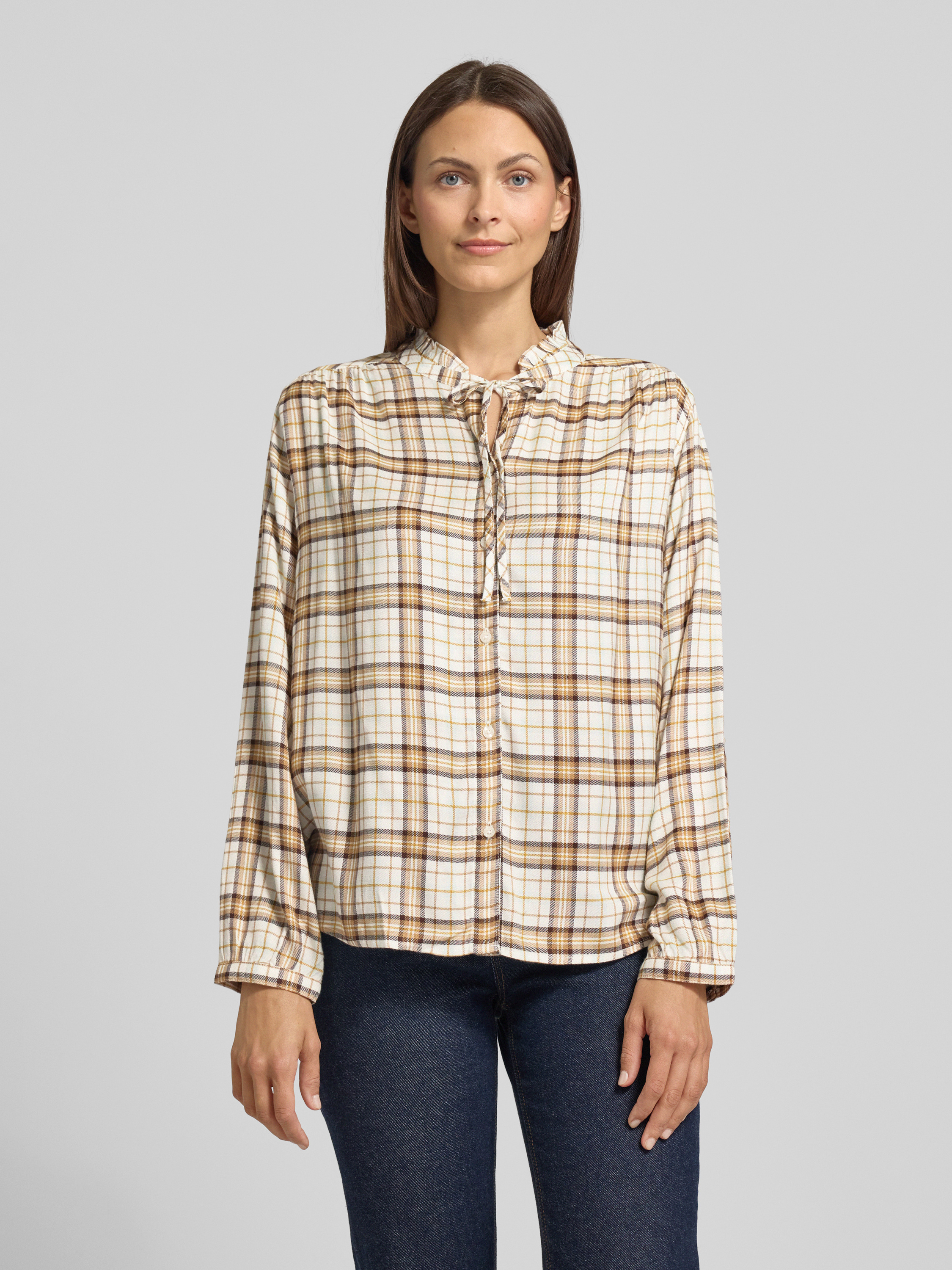 Die Damen Hemdbluse von s.Oliver RED LABEL zeigt sich im Regular-Fit und wirkt durch das Allover-Muster lebendig. Der Modal-Viskose-Mix fühlt sich weich an und sorgt für angenehmen Tragekomfort, während die Rückenpasse mit Raffung dem Schnitt eine besondere Note verleiht. Durch den leicht abgerundeten Saum erhält die Bluse eine dezente, alltagstaugliche Silhouette.
