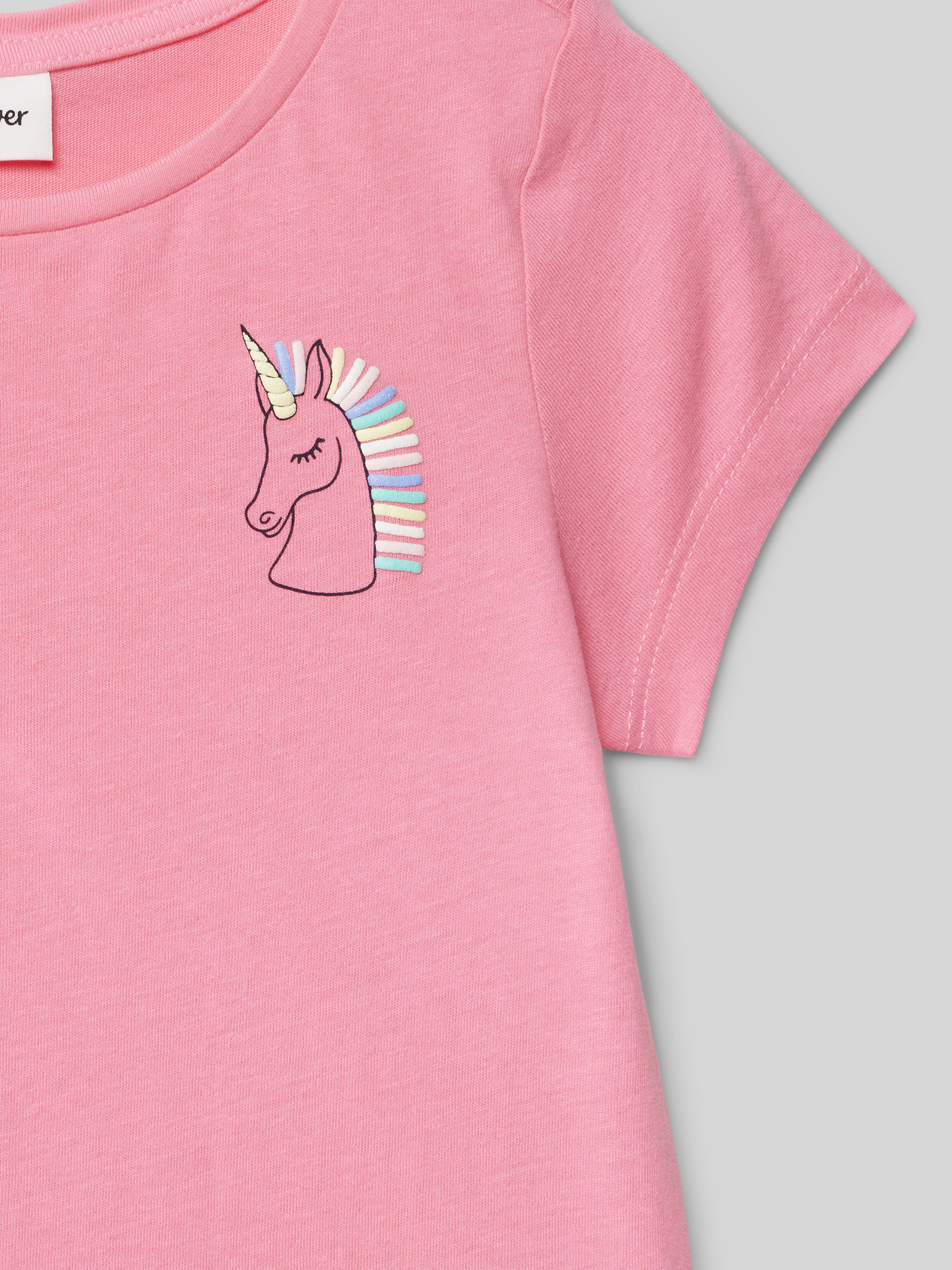 Das Regular Fit T-Shirt von s.Oliver RED LABEL bietet mit seinem weichen Baumwollmaterial und dem Rundhalsausschnitt angenehmen Tragekomfort. Die unifarbene Optik wird durch einen dezenten Motiv-Print ergänzt. Kappärmel sorgen für eine lockere Passform, die sich ideal für Kinder eignet.