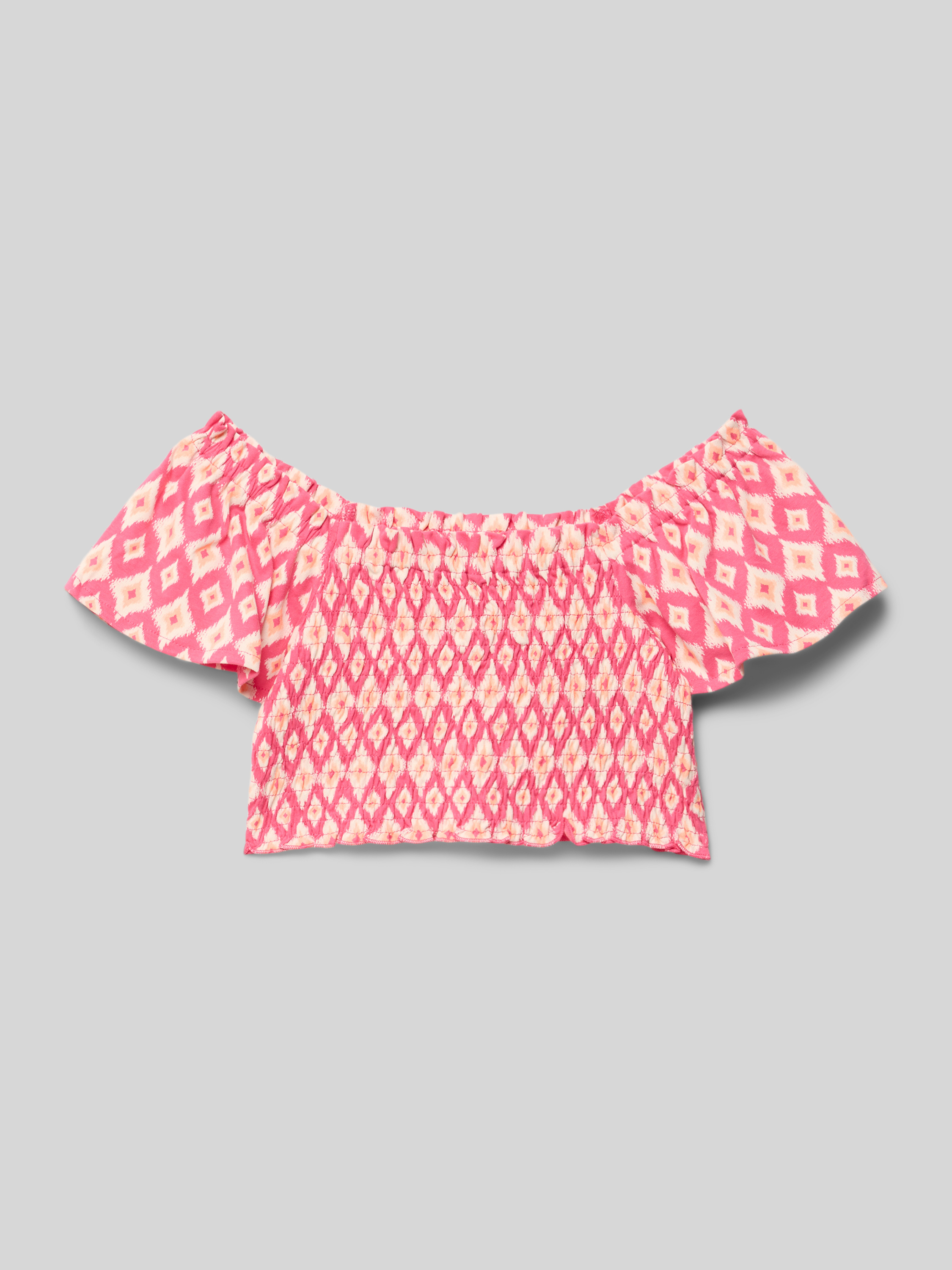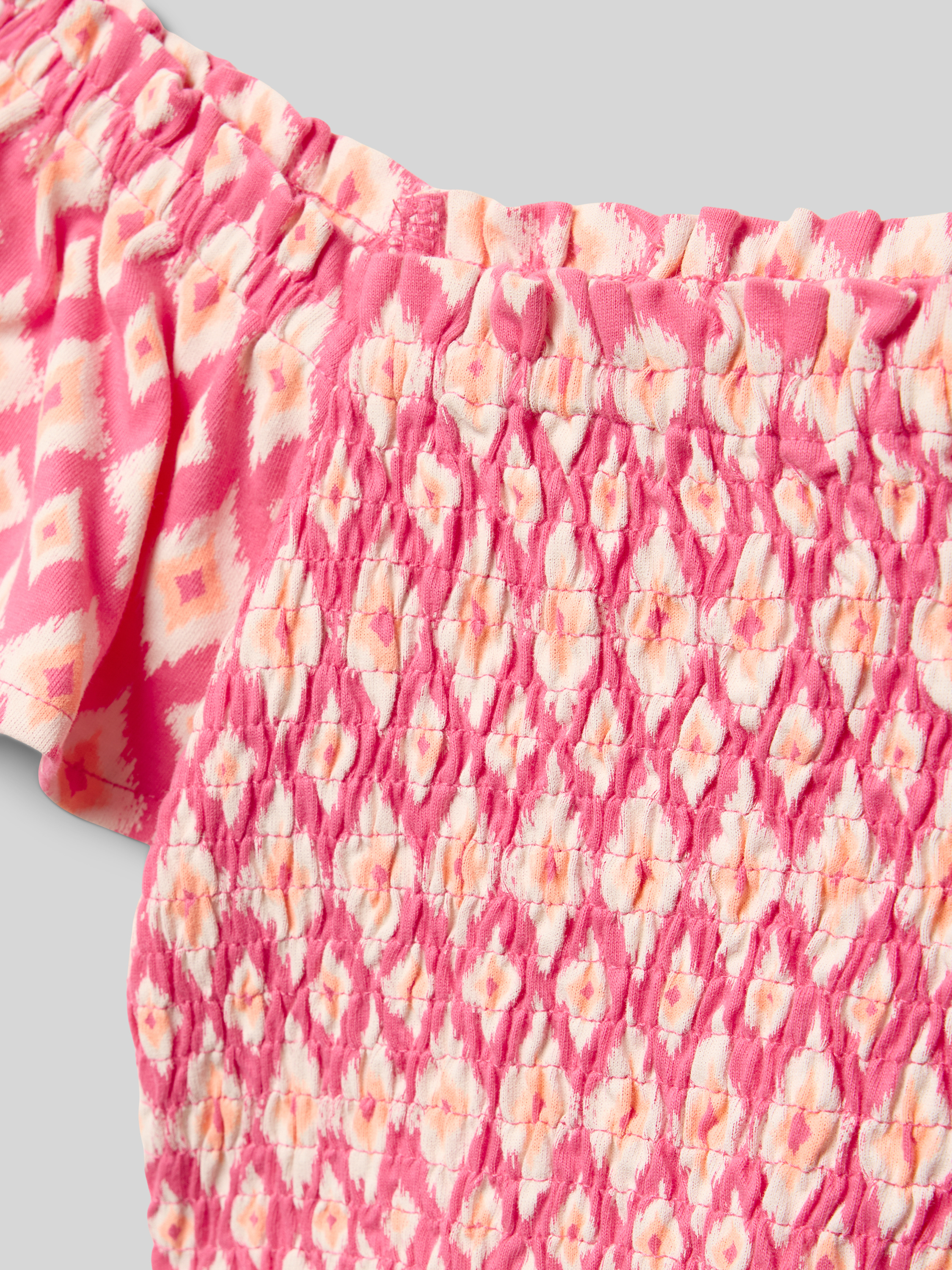 Das Slim Fit Crop Top von s.Oliver RED LABEL aus reiner Baumwolle bietet durch seinen Off-Shoulder-Schnitt eine luftige Passform, die ideal für warme Tage ist. Das Allover-Muster verleiht dem Top eine verspielte Note, während die Smokdetails für eine moderne Optik sorgen.