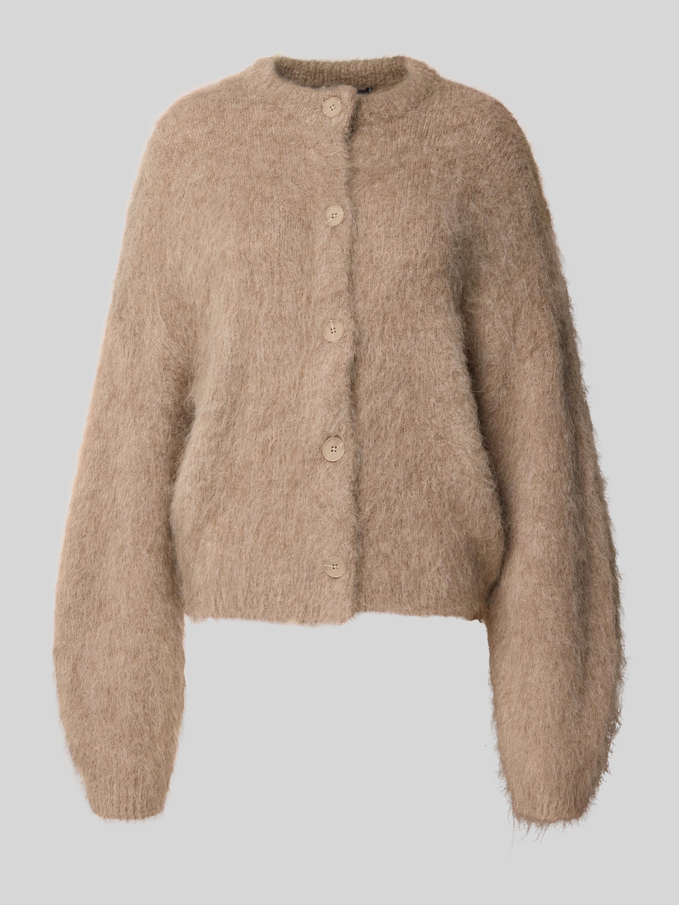 Die Damen Strickjacke von Someday im Modell 'Tamanah' kombiniert einen lockeren Schnitt mit einem angenehmen Alpaka-Mix und Stretch-Anteil. Durch die gerippten Abschlüsse und den Rundhalsausschnitt entsteht eine lässige Silhouette, die vielseitig im Alltag getragen werden kann. Die Knopfleiste unterstreicht den unkomplizierten Stil und sorgt für flexible Tragemöglichkeiten.