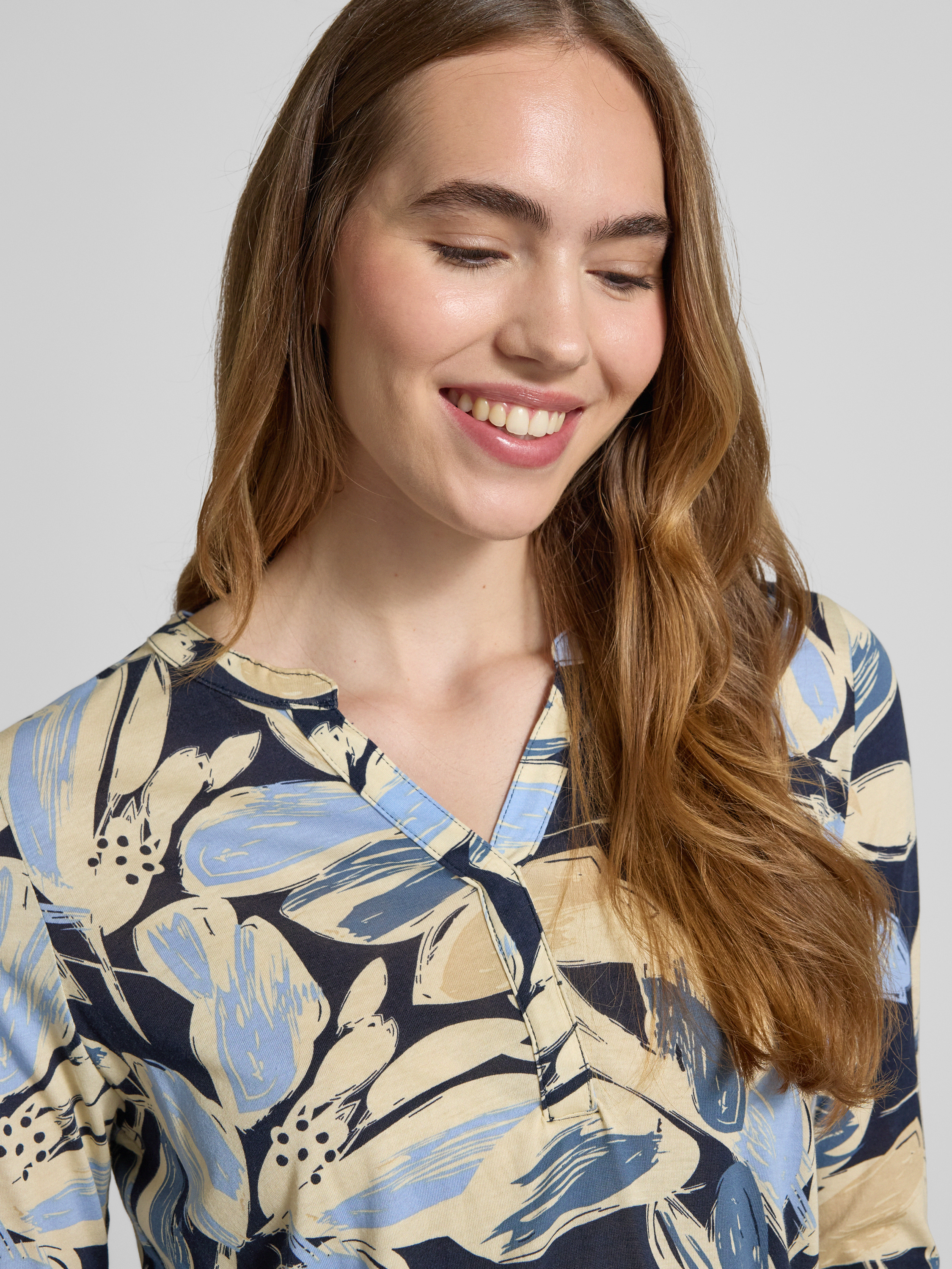 Die Damen Tunikabluse von Soyaconcept Modell 'Felicity' zeigt sich im Regular-Fit und schmiegt sich dank des Viskose-Baumwoll-Mix angenehm an die Haut. Durch den Tunika-Ausschnitt und die 3/4-Arm wirkt sie locker, ohne an Struktur zu verlieren. Ein floraler Allover-Print sorgt für eine dezente, lebendige Note, wodurch man das Oberteil vielseitig kombinieren kann.