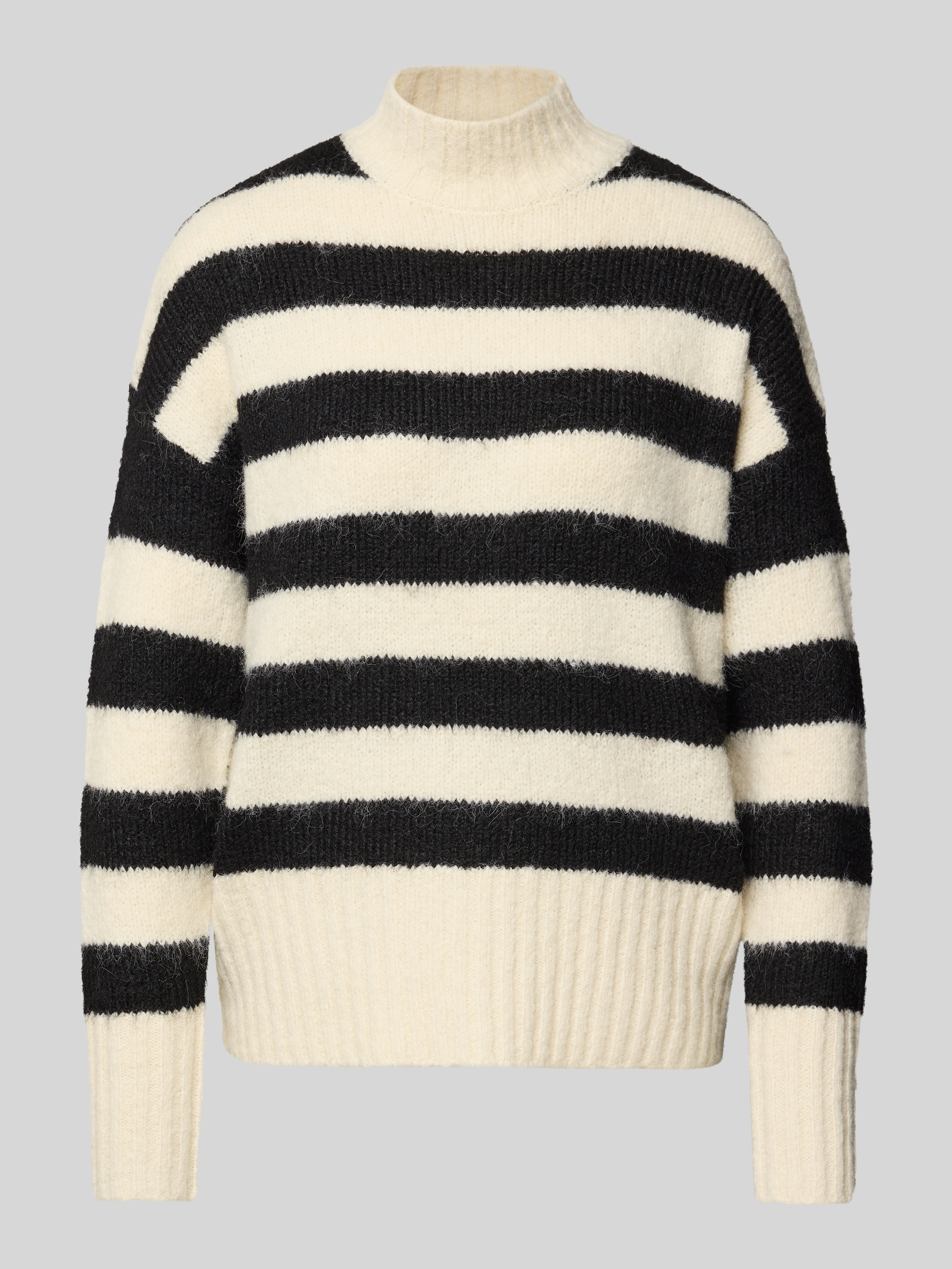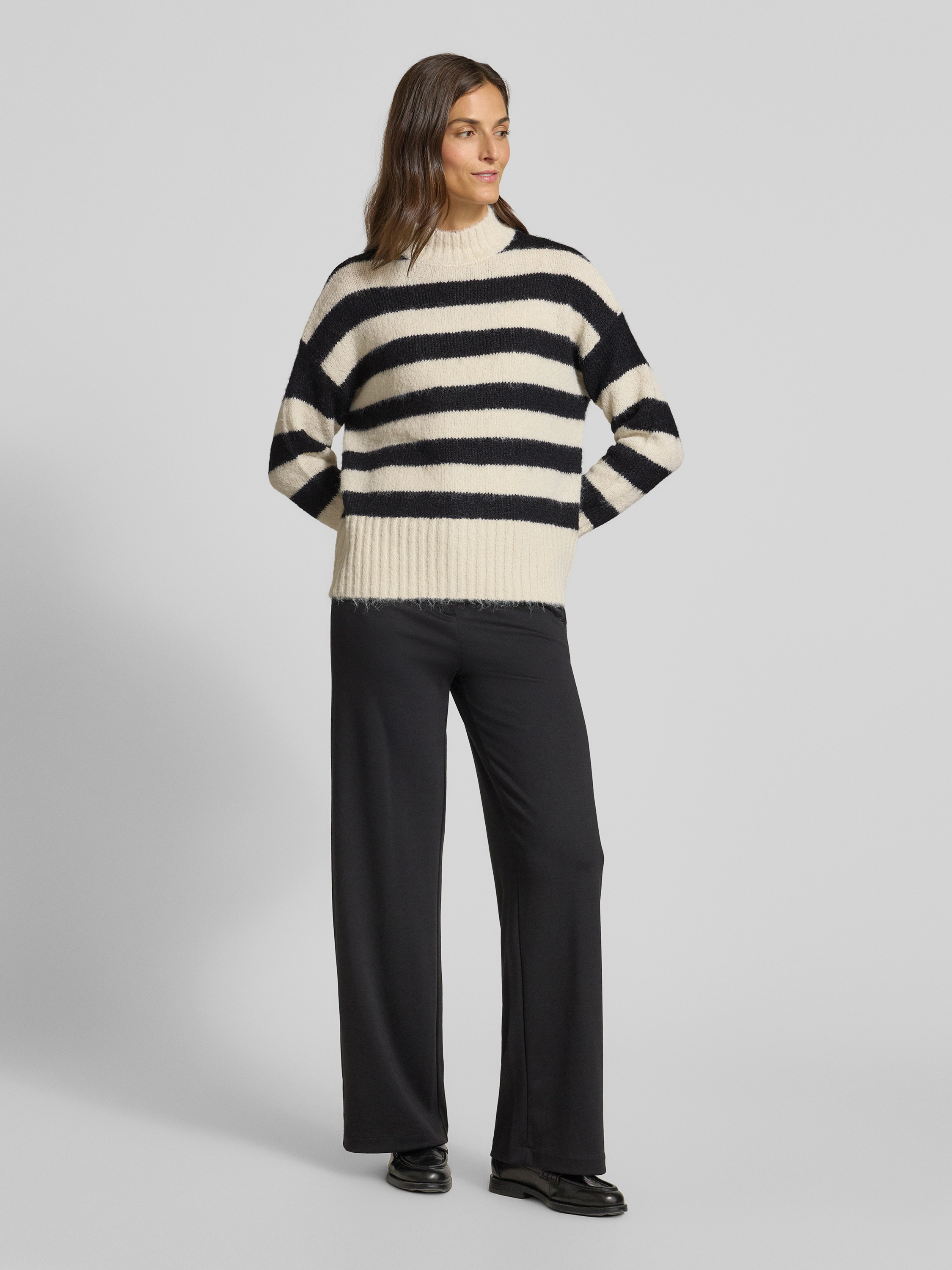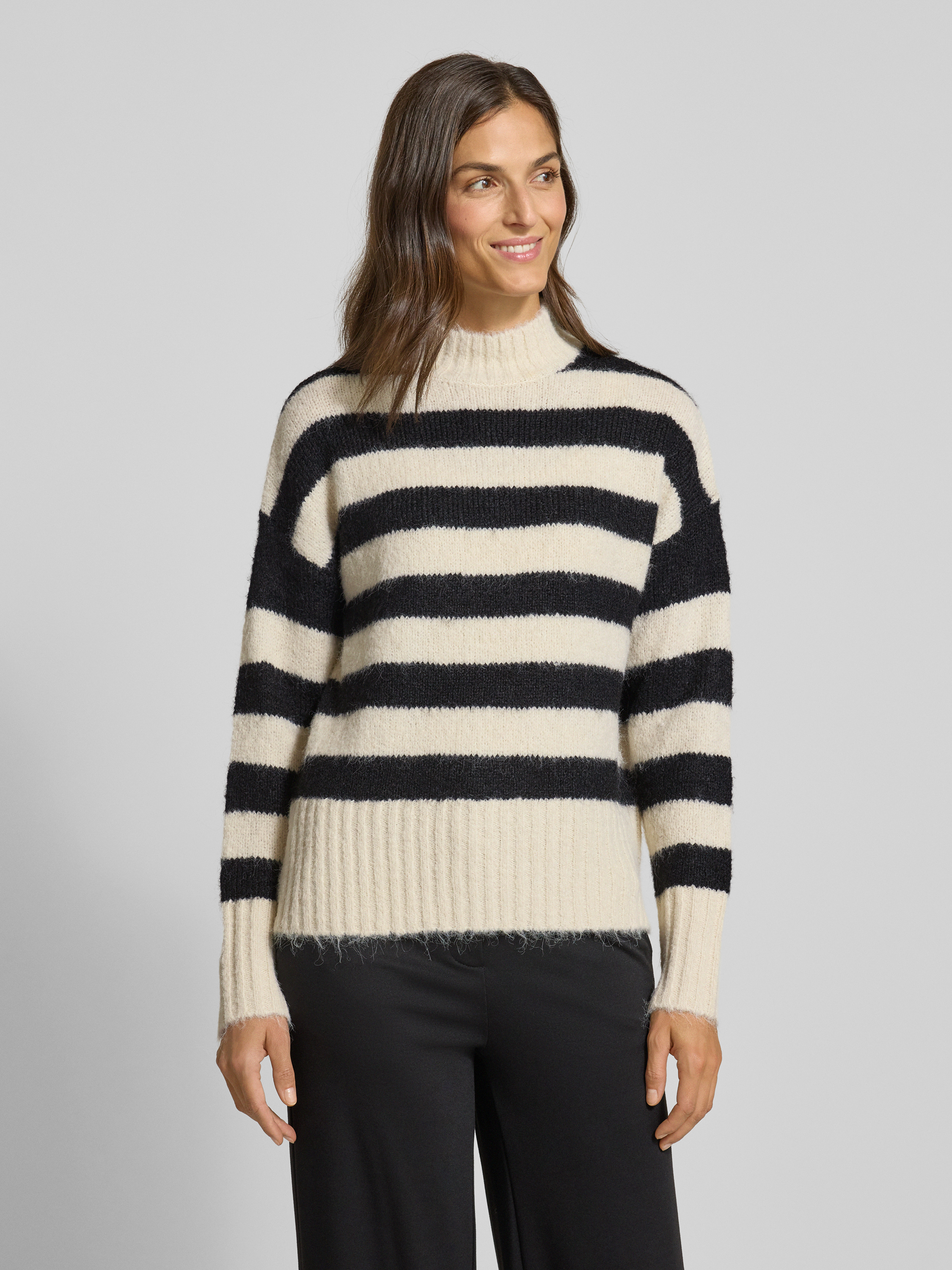 Der Damenpullover von Soyaconcept, Modell 'ILENE', fällt durch seinen lockeren Oversized-Schnitt angenehm leger. Dank des Materials mit Lanawolle-Anteil entsteht ein weiches Tragegefühl, das sich besonders an kühlen Tagen auszahlt. Der Stehkragen und die gerippten Abschlüsse runden das Design ab.