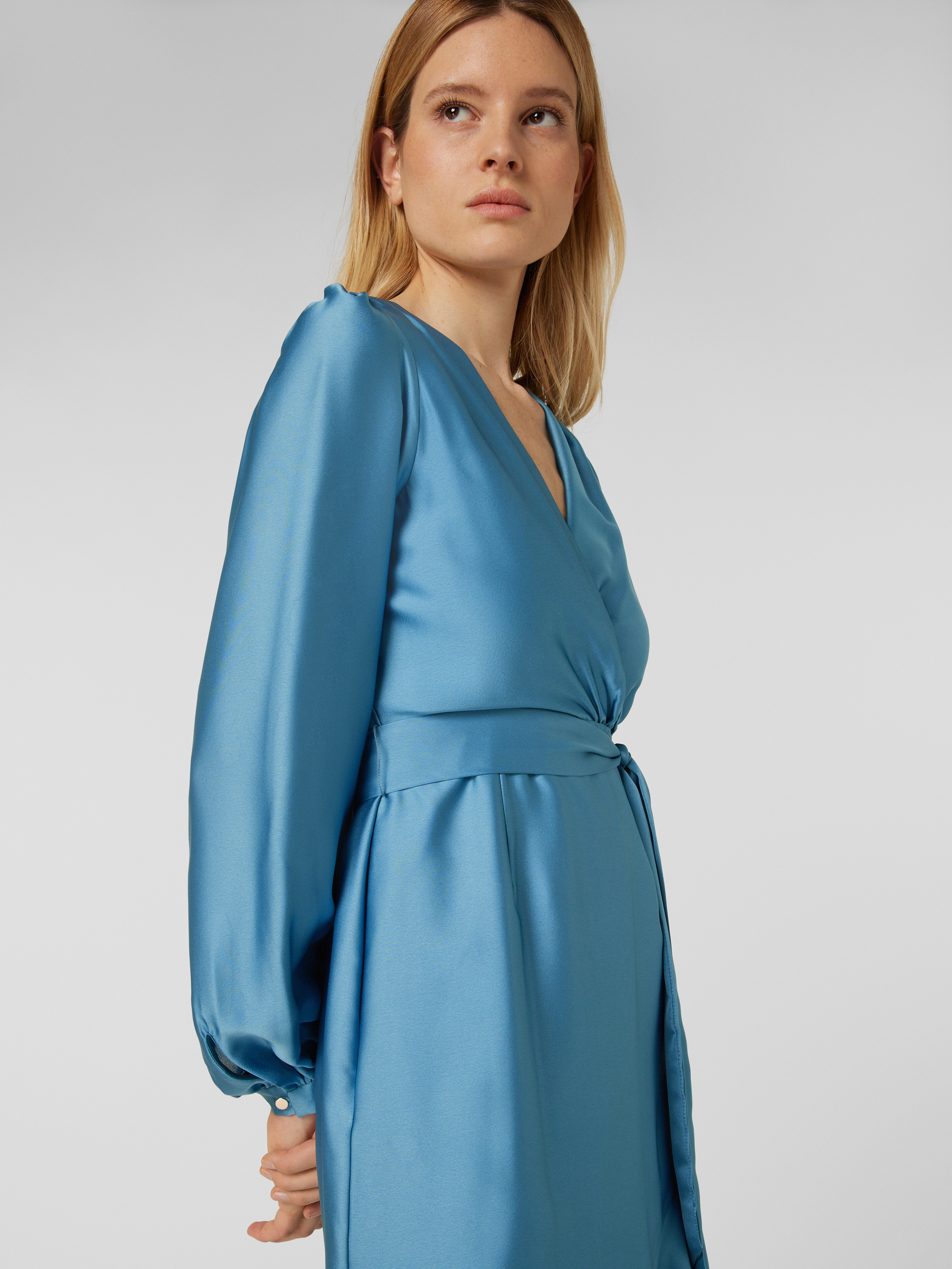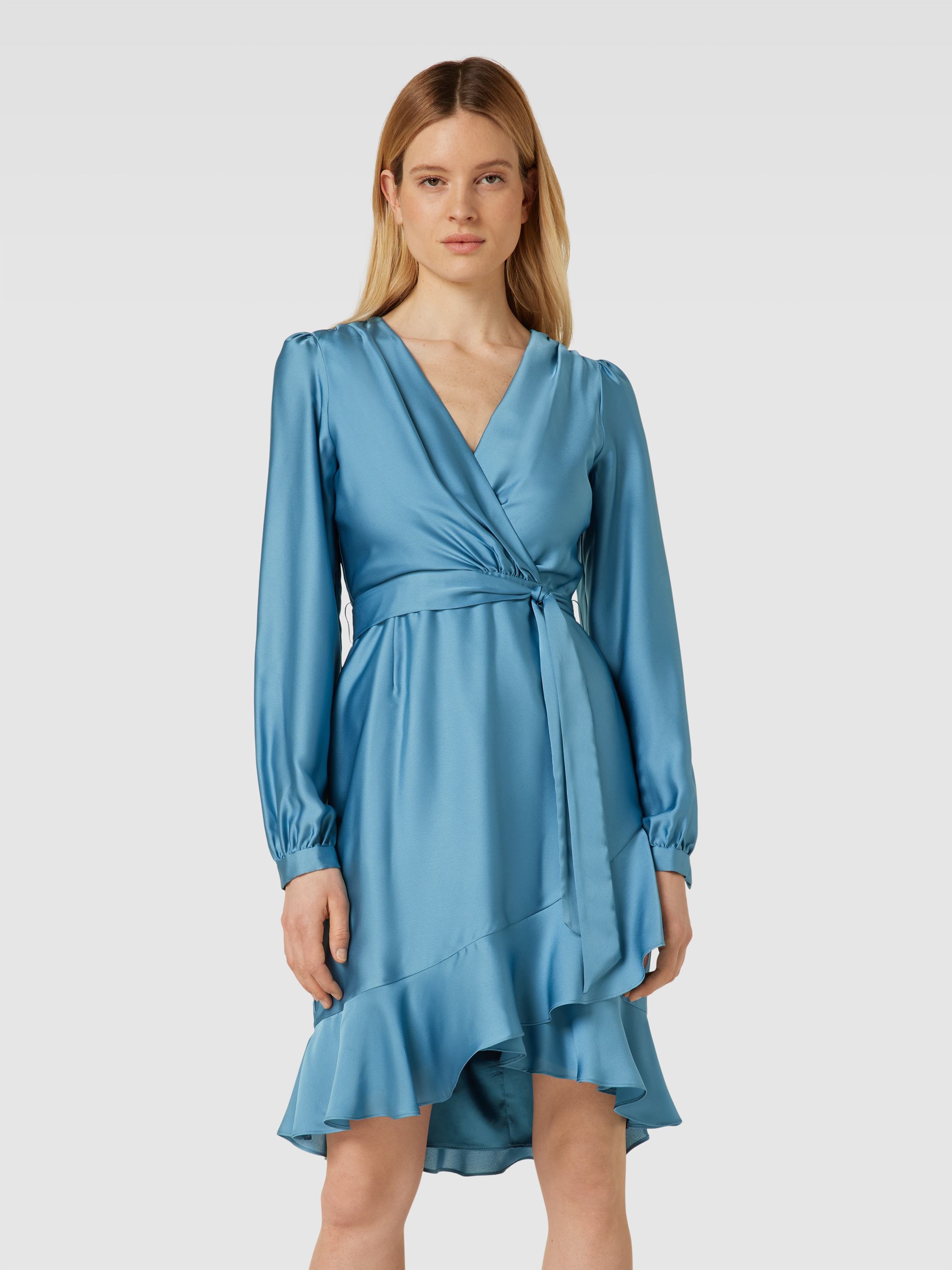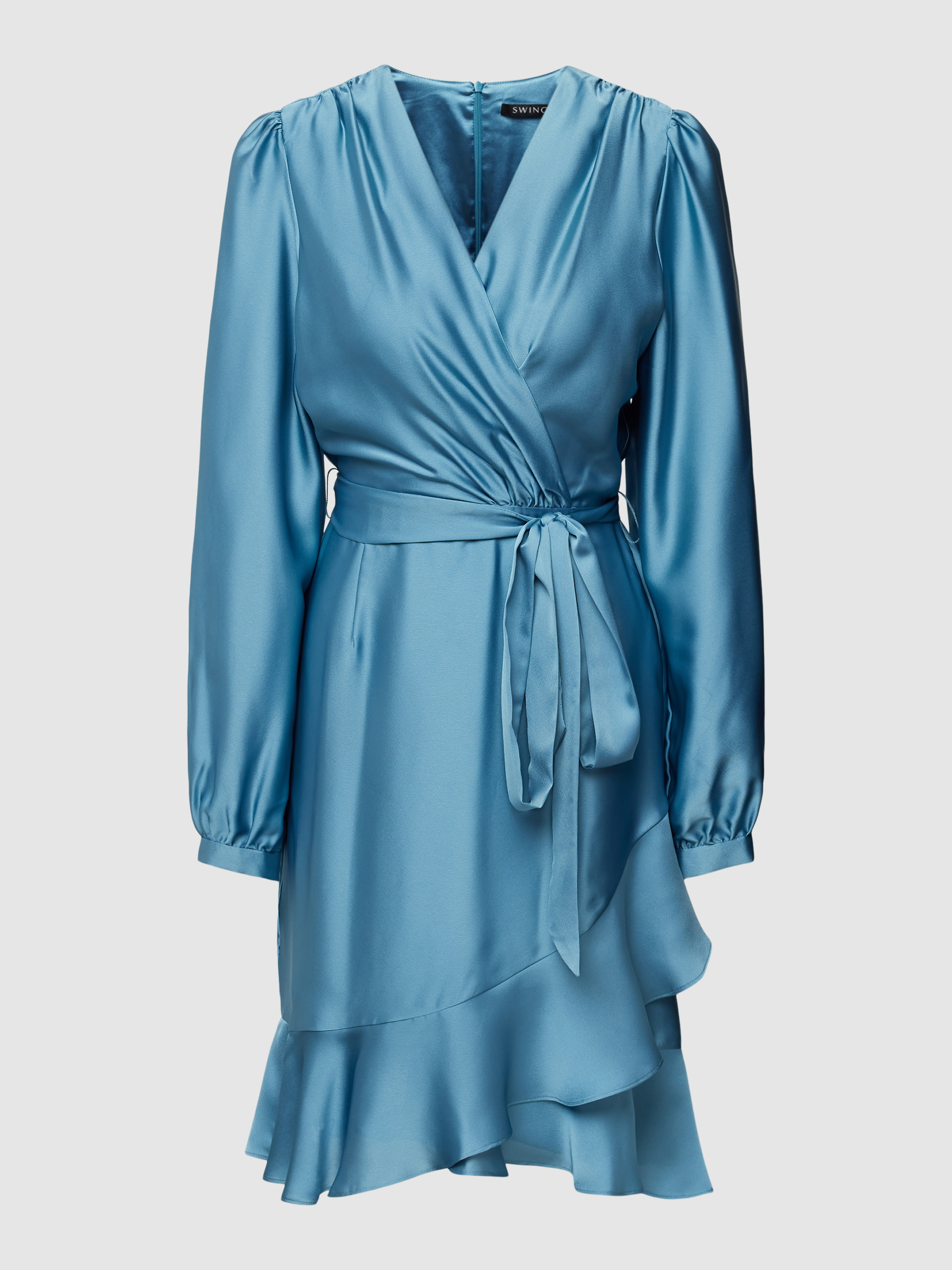 Das Damen Cocktailkleid von SWING zeigt sich in schimmerndem Satin und knielangem, geradem Schnitt. Durch die Wickel-Optik mit V-Ausschnitt sowie Ballonärmel und Volants entsteht ein fließender Eindruck, während der Bindegürtel die Taille betont und Bewegungsfreiheit erhält.