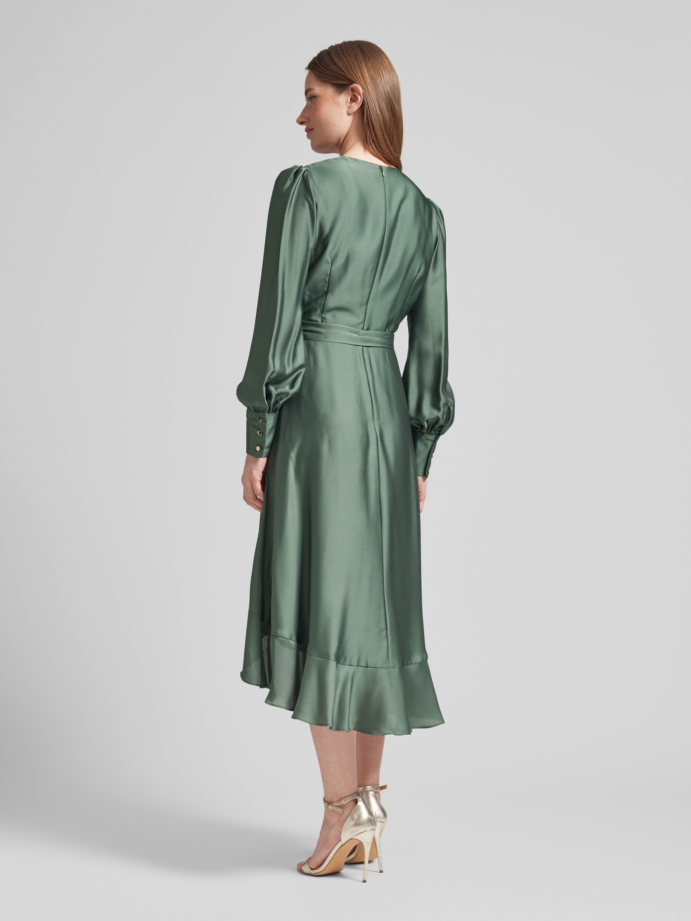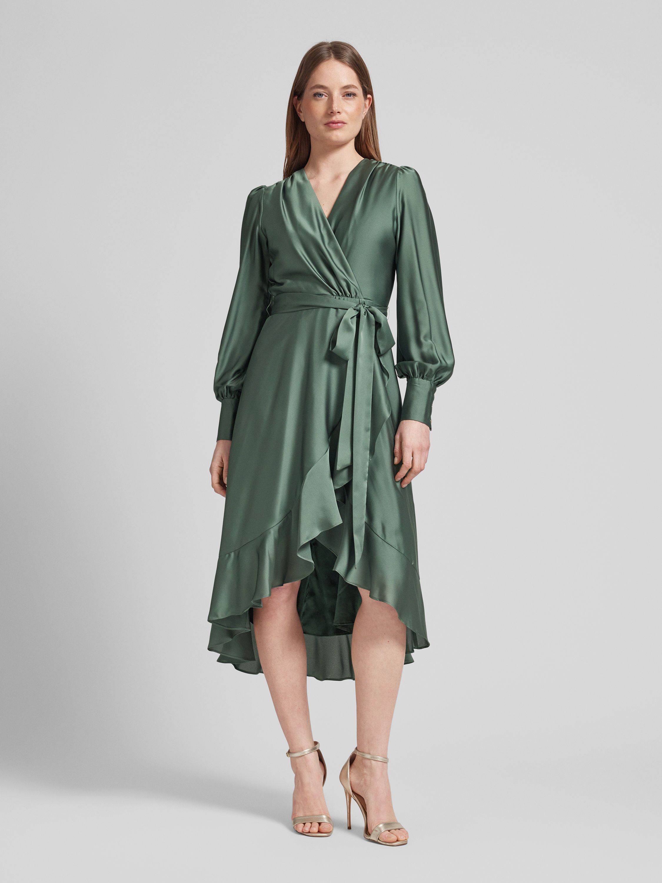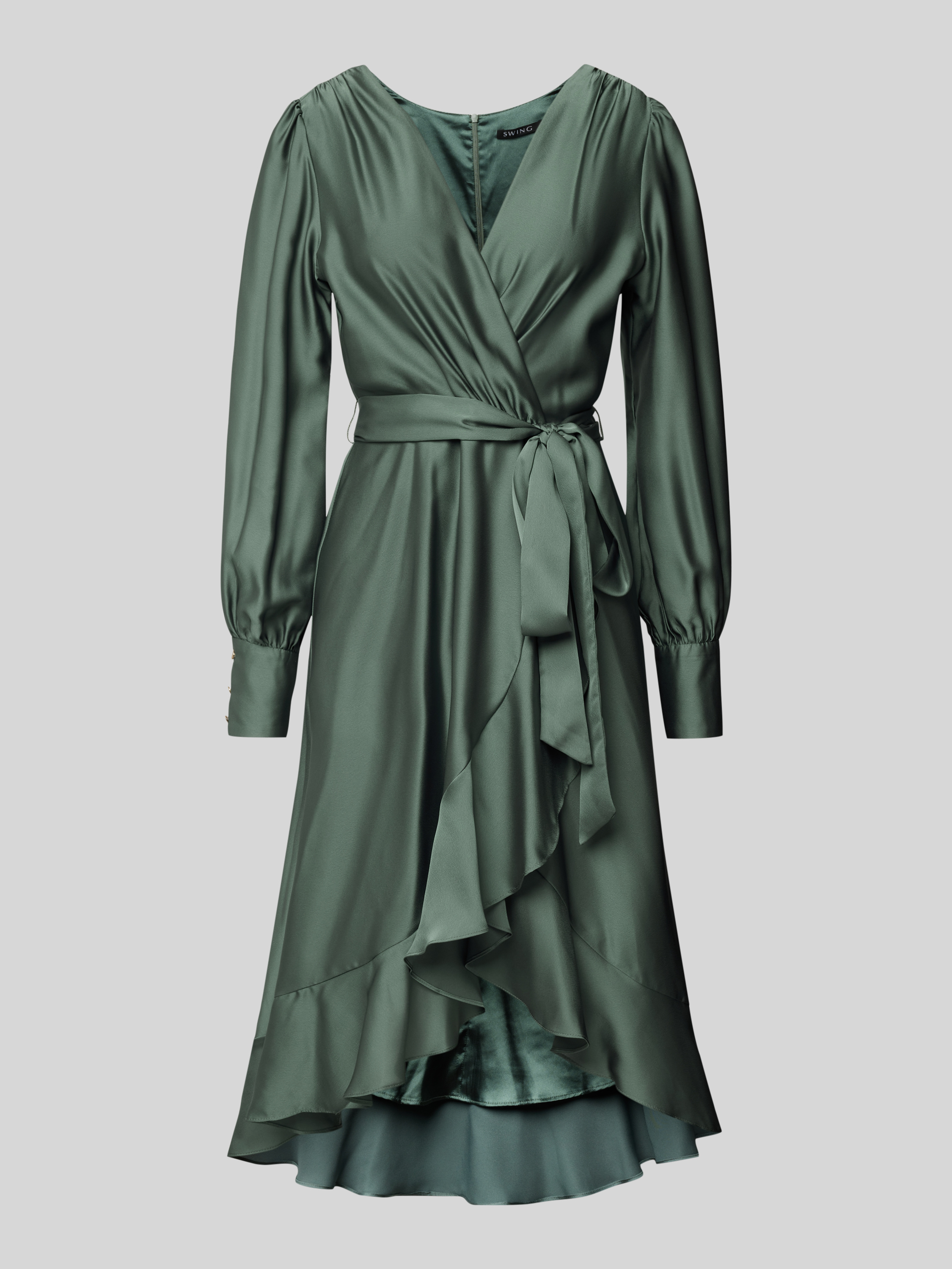 Das SWING Cocktailkleid mit Bindegürtel zeichnet sich durch seine fließende Satin-Textur aus, die einen leichten Glanz verleiht. Der V-Ausschnitt und die Wickel-Optik schaffen eine elegante Silhouette, während Ballonärmel und Volantsaum dem Midikleid eine verspielte Note hinzufügen. Der Bindegürtel ermöglicht es, die leicht taillierte Passform individuell zu gestalten, was für einen komfortablen Sitz sorgt.