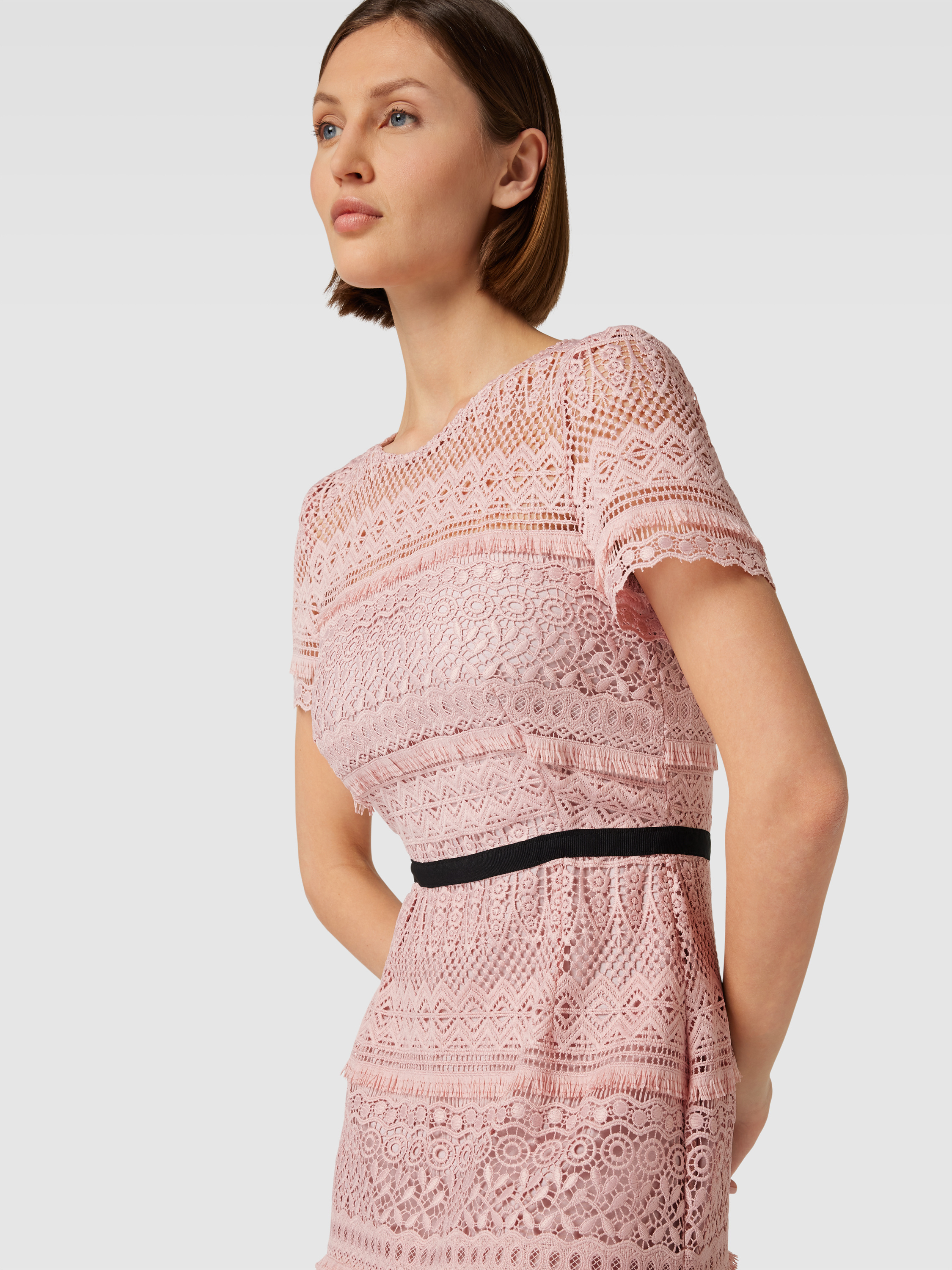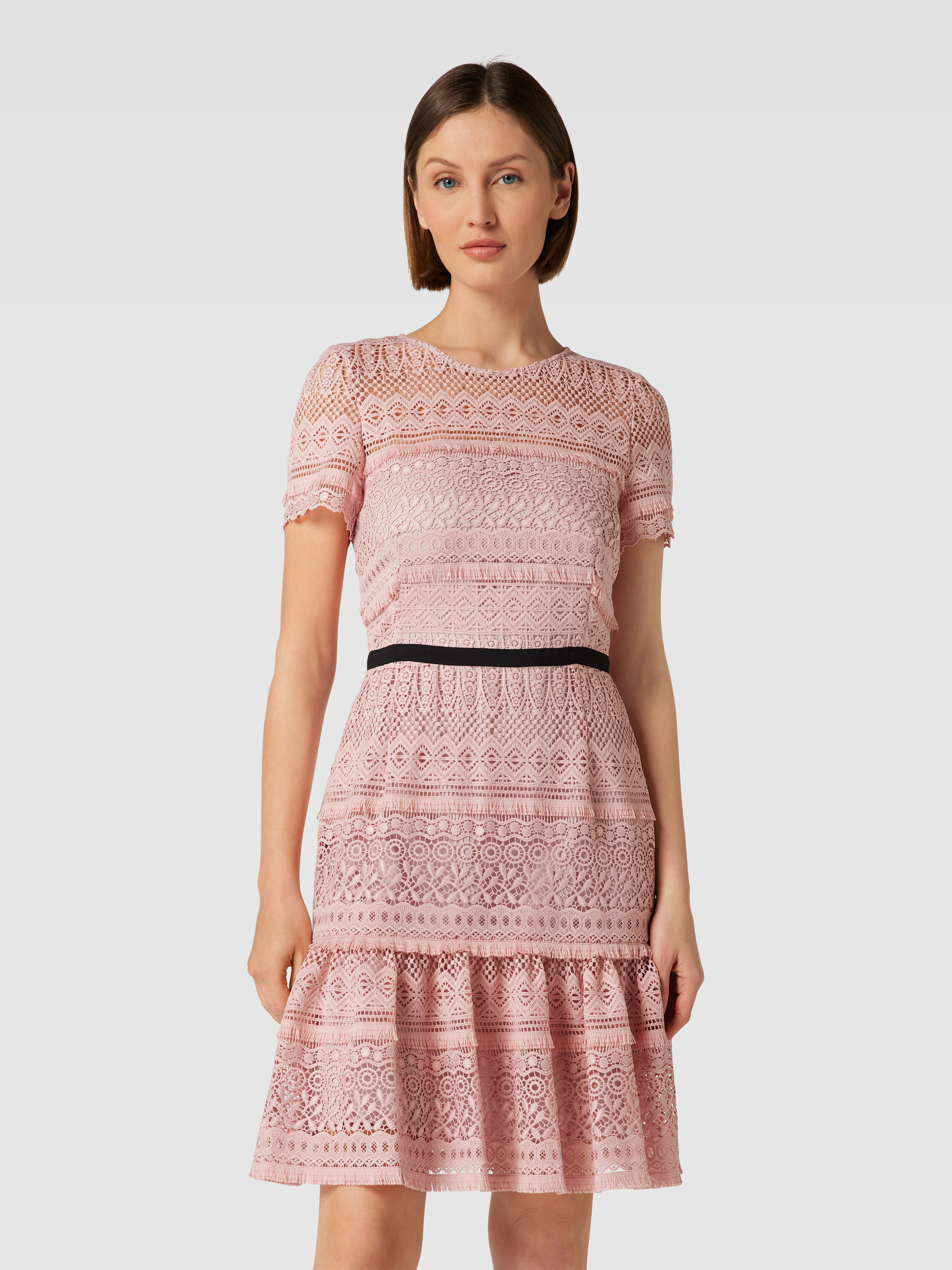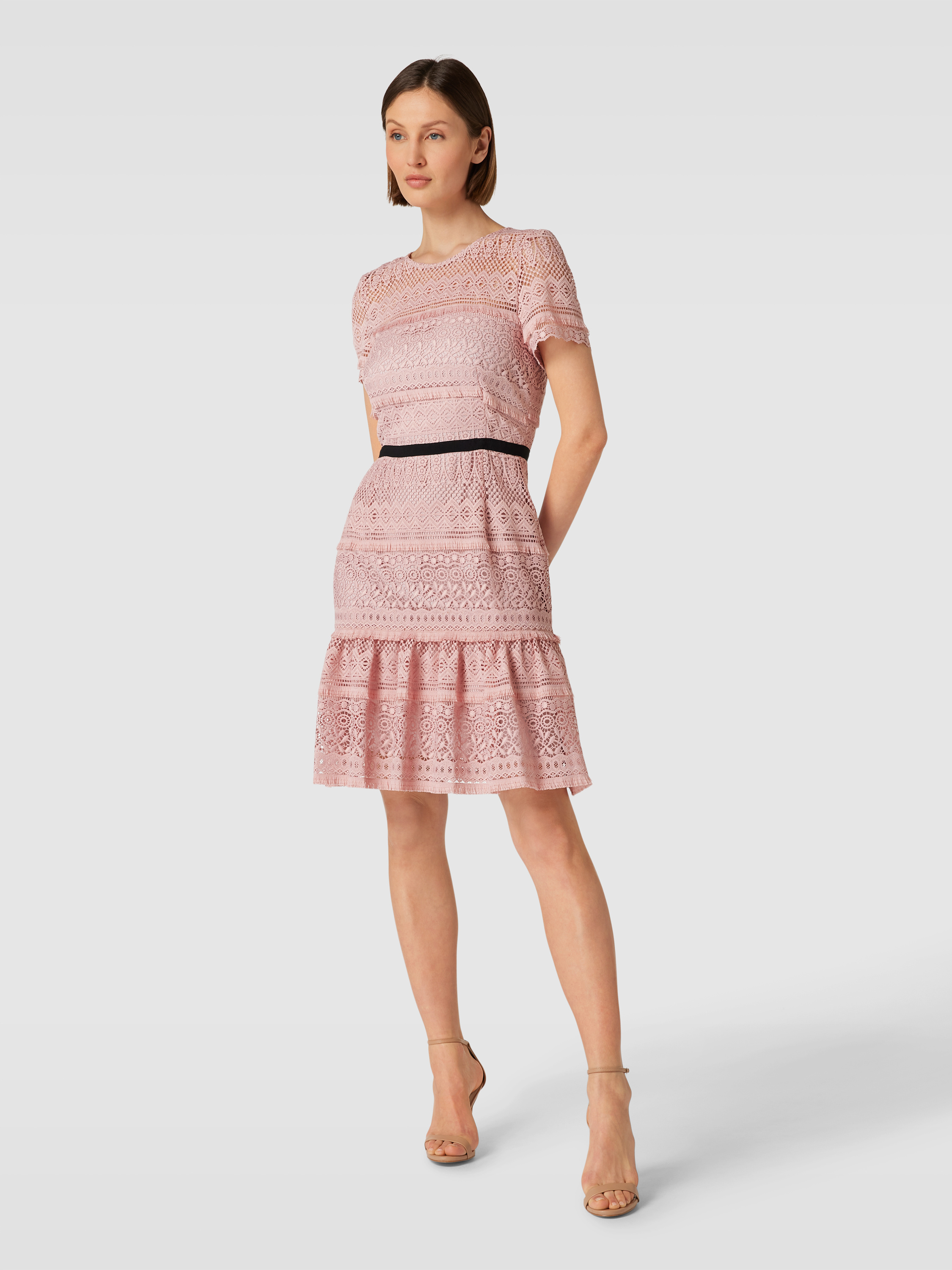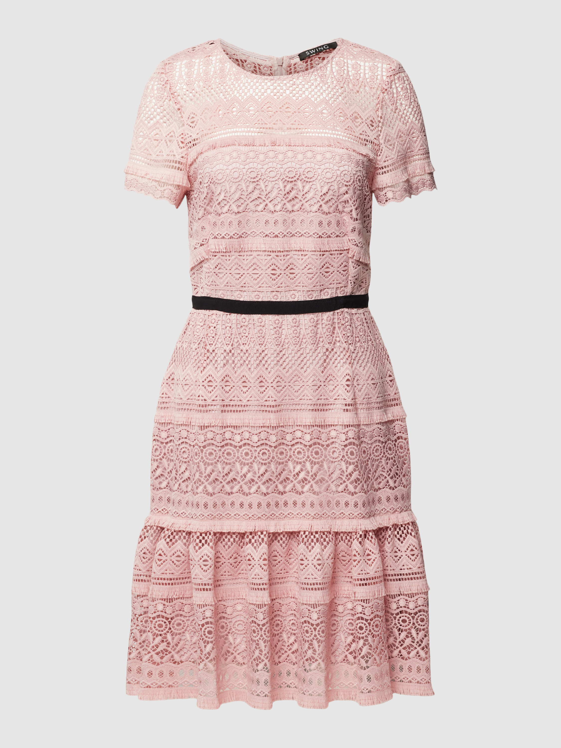 Das Cocktailkleid mit Spitzenbesatz von SWING zeigt sich in taillierter Silhouette und kurzer Minilänge, wodurch Bewegungsfreiheit und eine angenehme Passform entstehen. Feiner Spitzenbesatz setzt dezente Akzente, während das unifarbene Design vielfältige Kombinationsmöglichkeiten eröffnet. Der Stufen-Look sorgt für eine moderne, feminine Ausstrahlung.