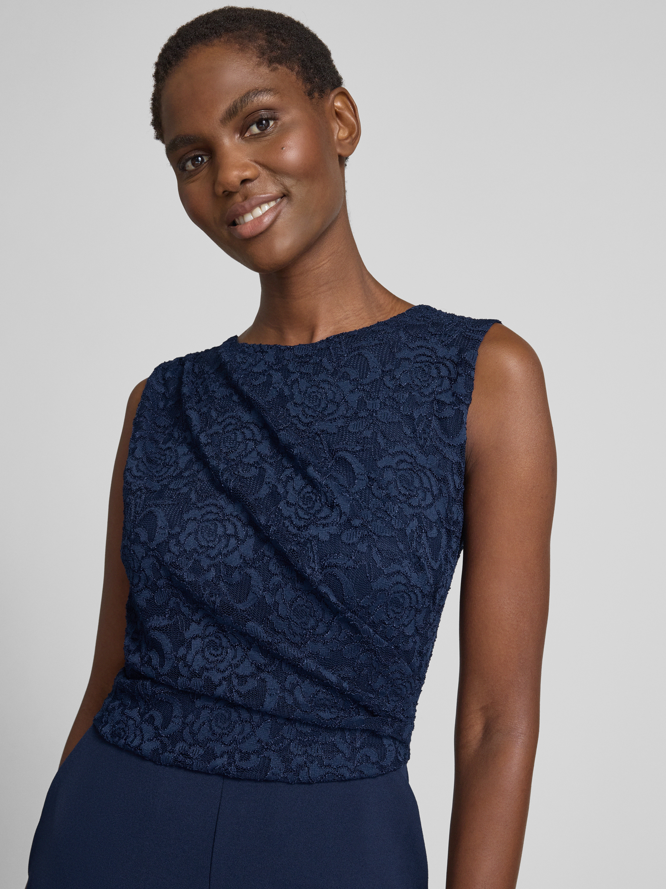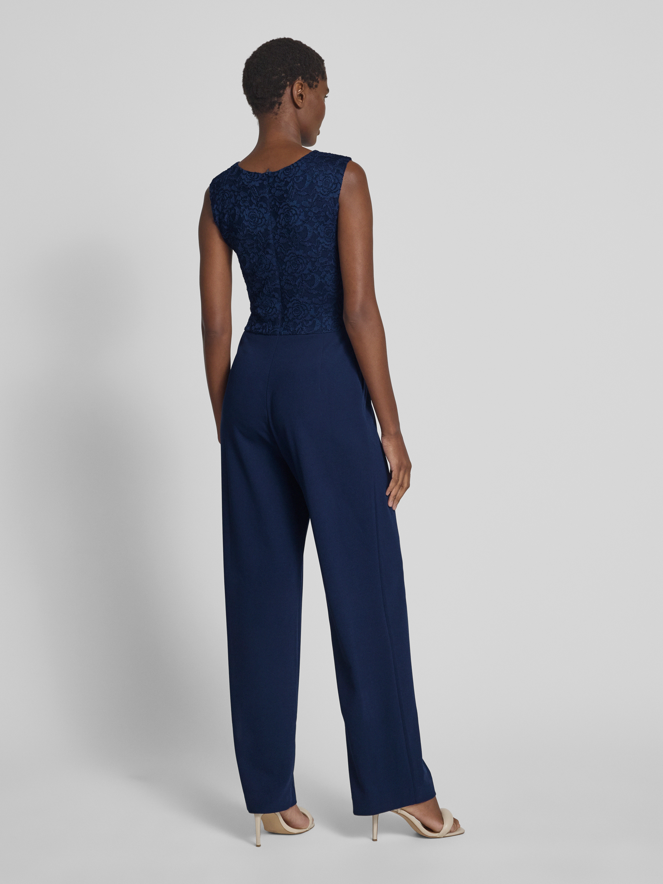 Der Jumpsuit von Swing beeindruckt durch seinen eleganten Ausbrenner-Effekt und den taillierten Schnitt, der für eine feminine Silhouette sorgt. Der Material-Mix mit Stretch-Anteil bietet hohen Tragekomfort, während der Rundhalsausschnitt einen zeitlosen Look verleiht. Ideal für besondere Anlässe geeignet.