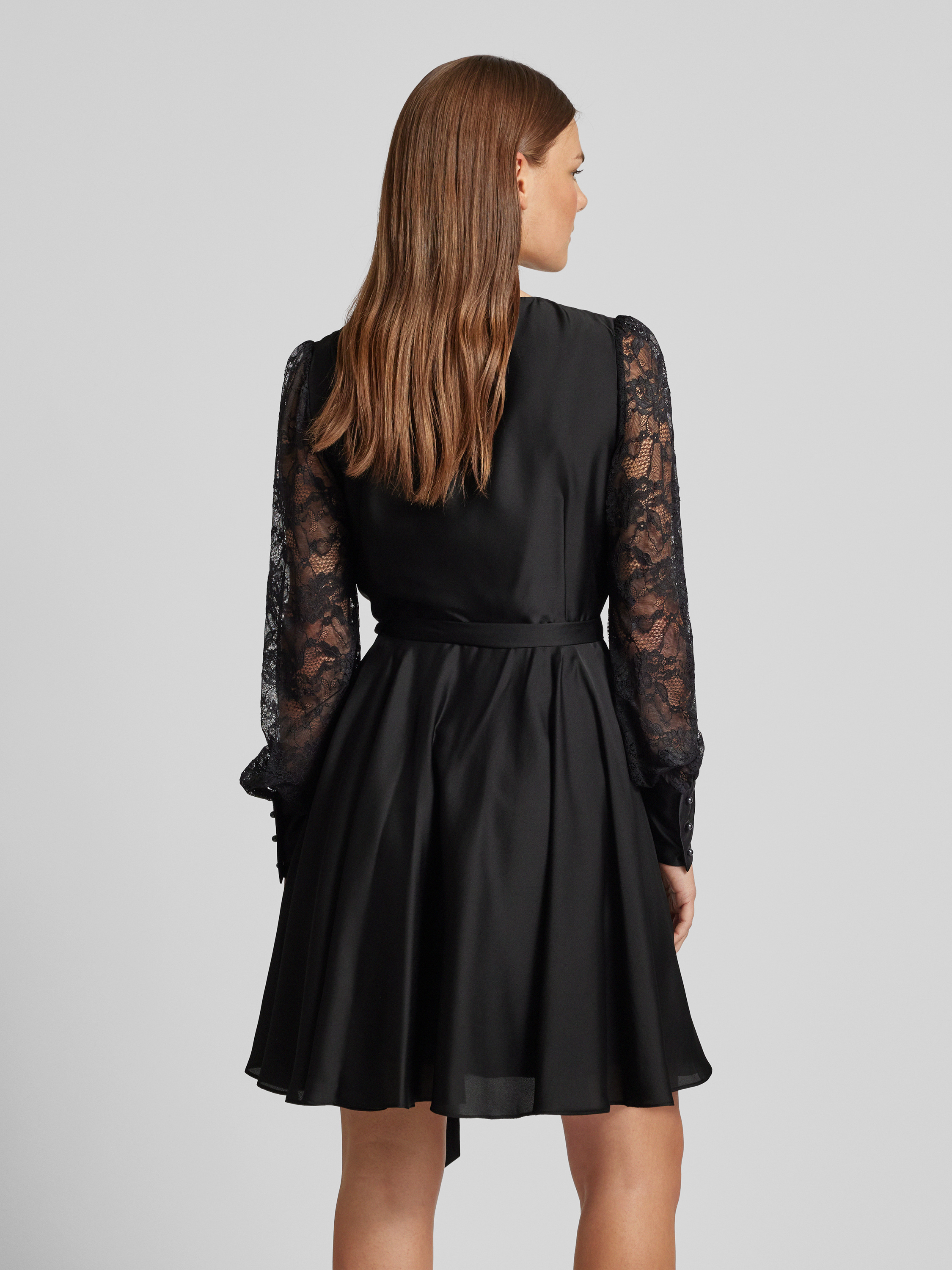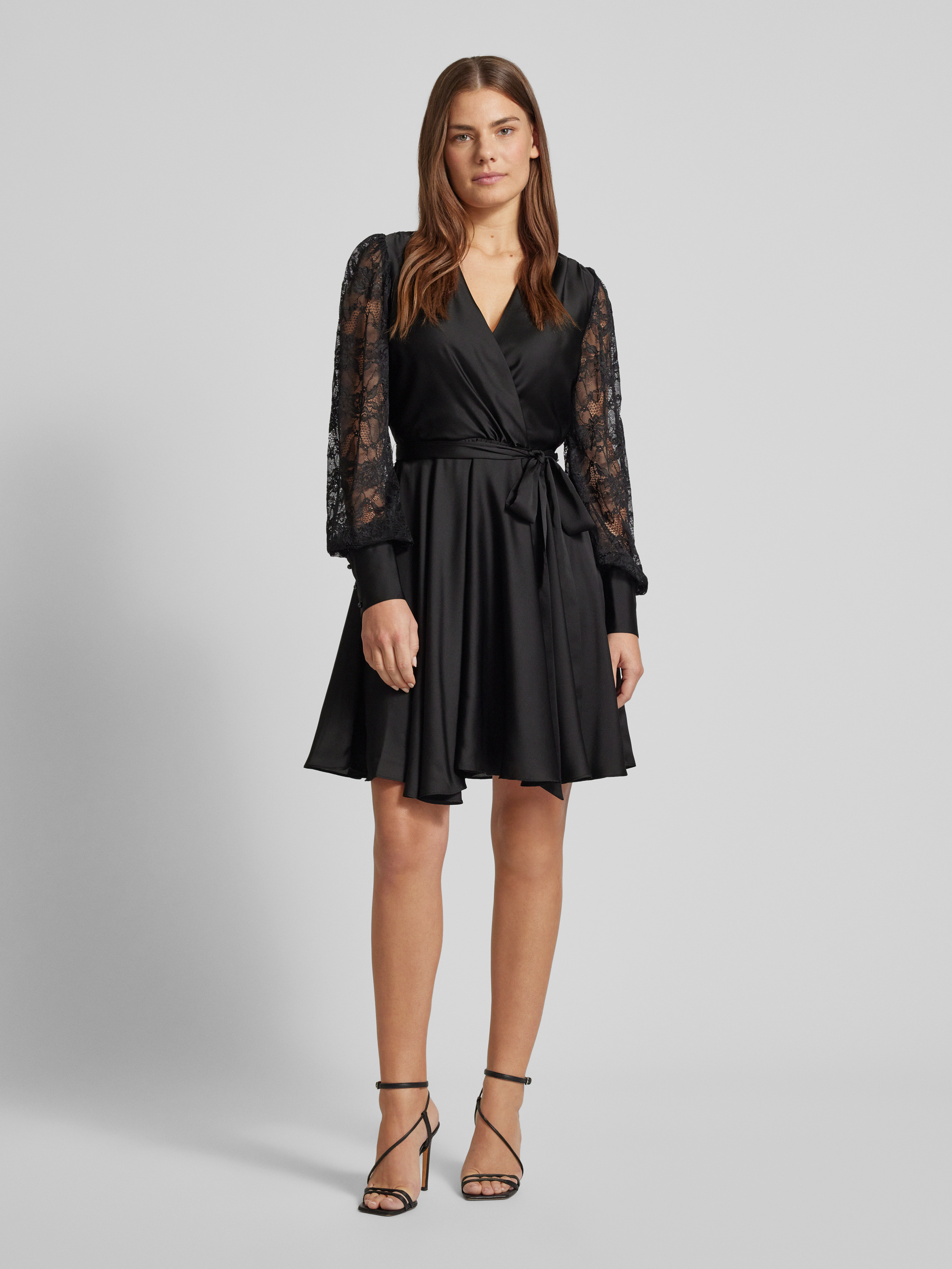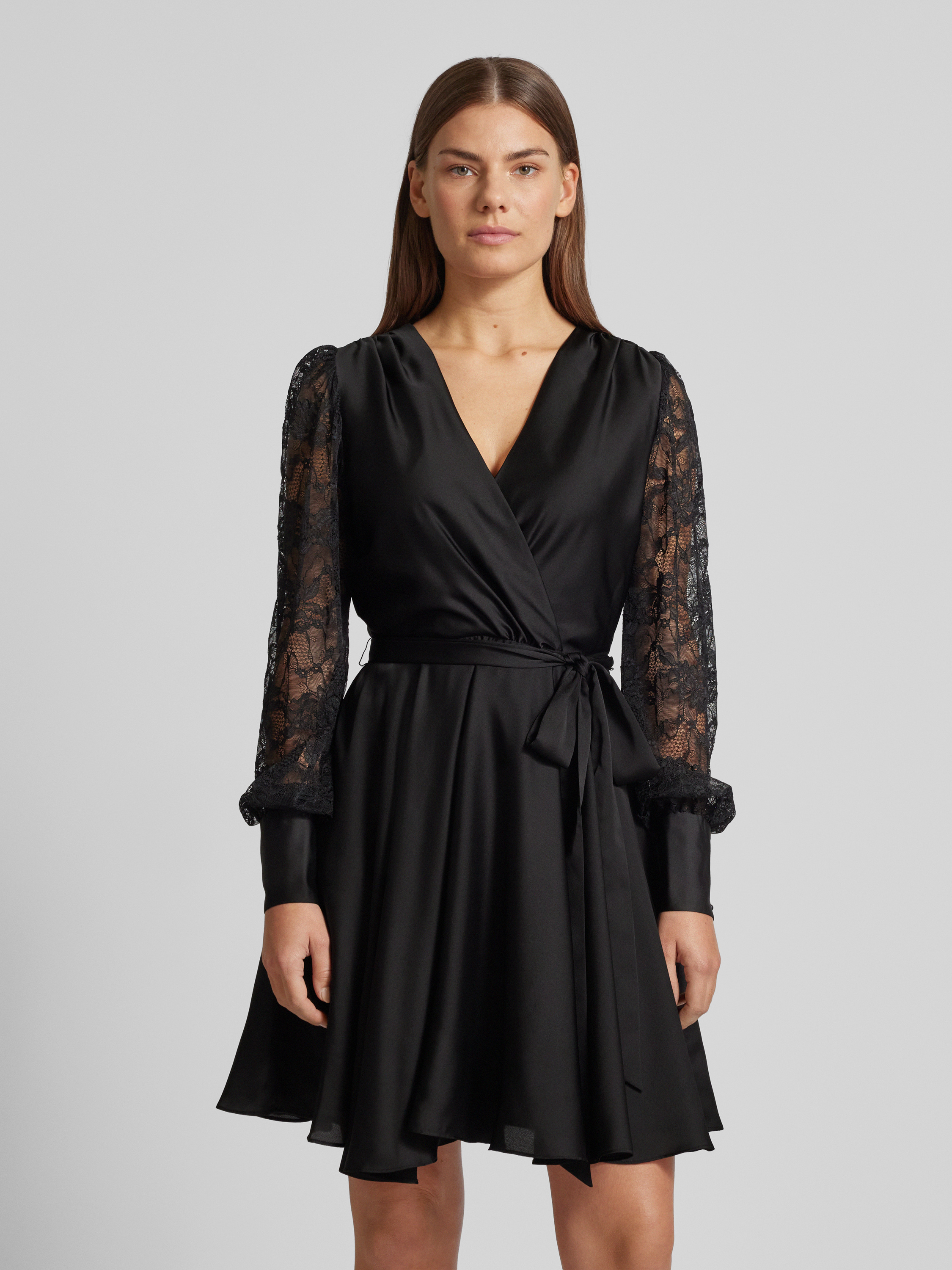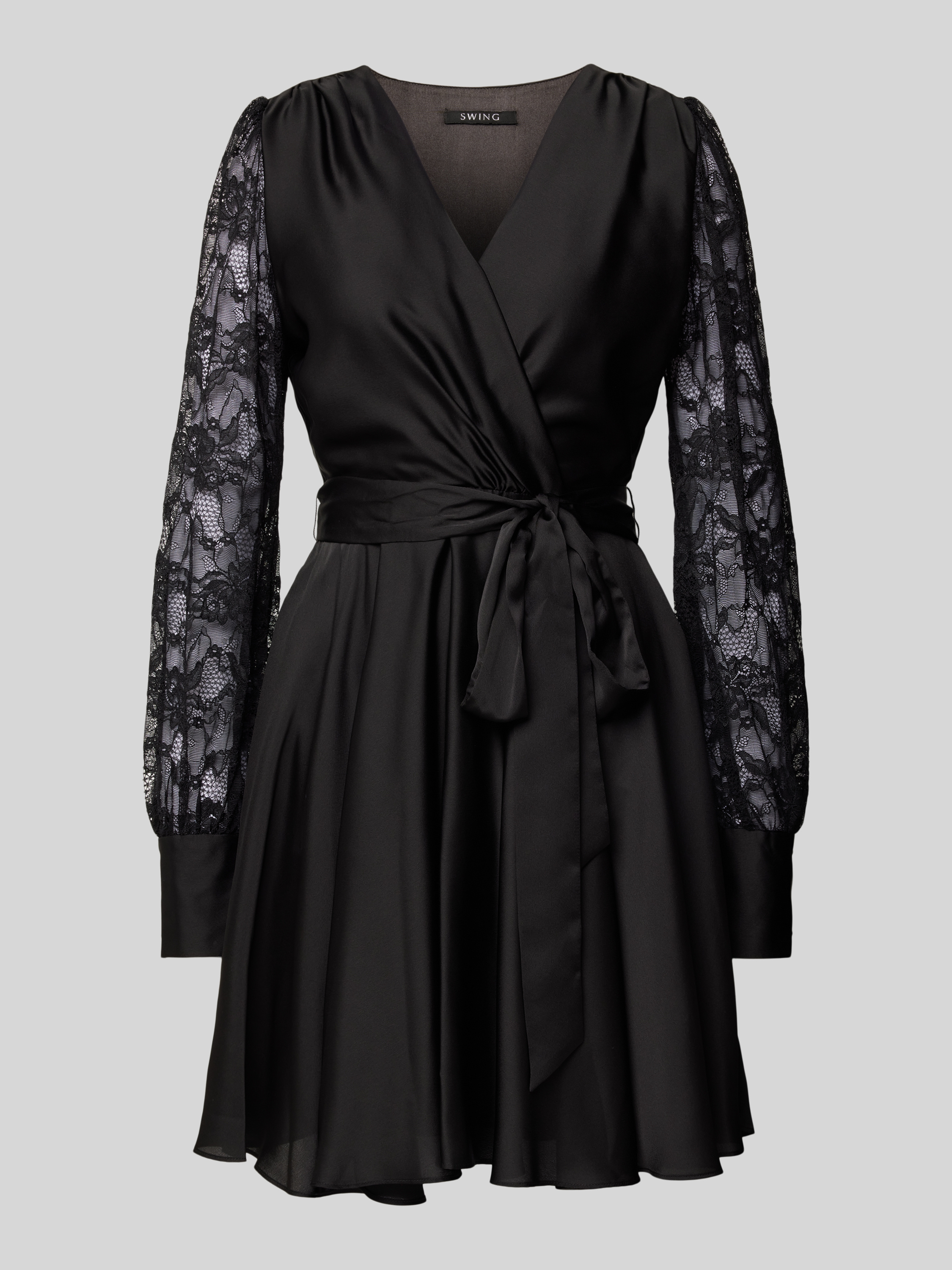 Das elegante Cocktailkleid von SWING beeindruckt durch seinen femininen, taillierten Schnitt und die raffinierte Wickel-Optik. Ein Bindegürtel akzentuiert die Taille und verleiht dem knielangen Kleid eine ansprechende Silhouette. Der V-Ausschnitt rundet das Design geschmackvoll ab.