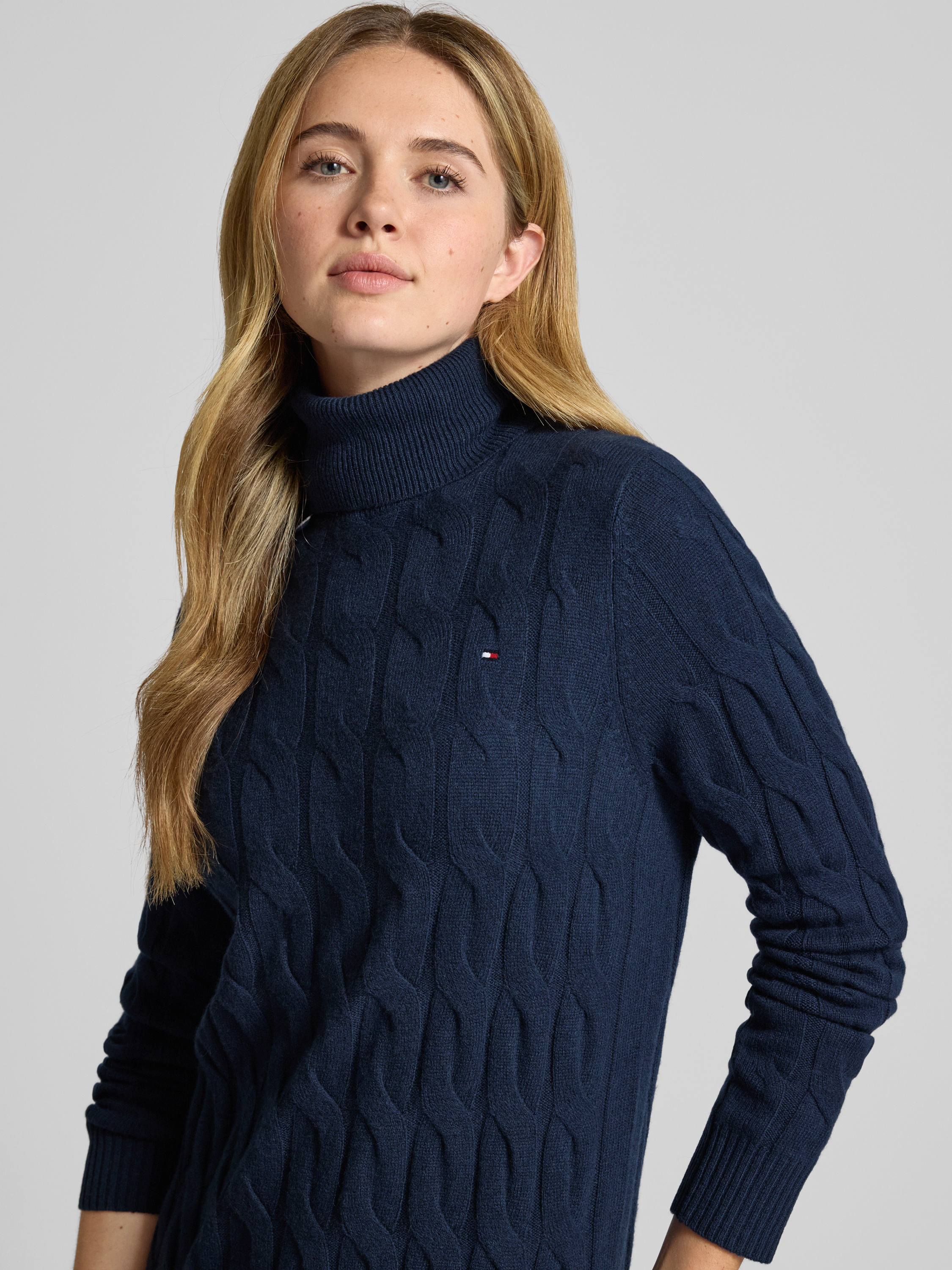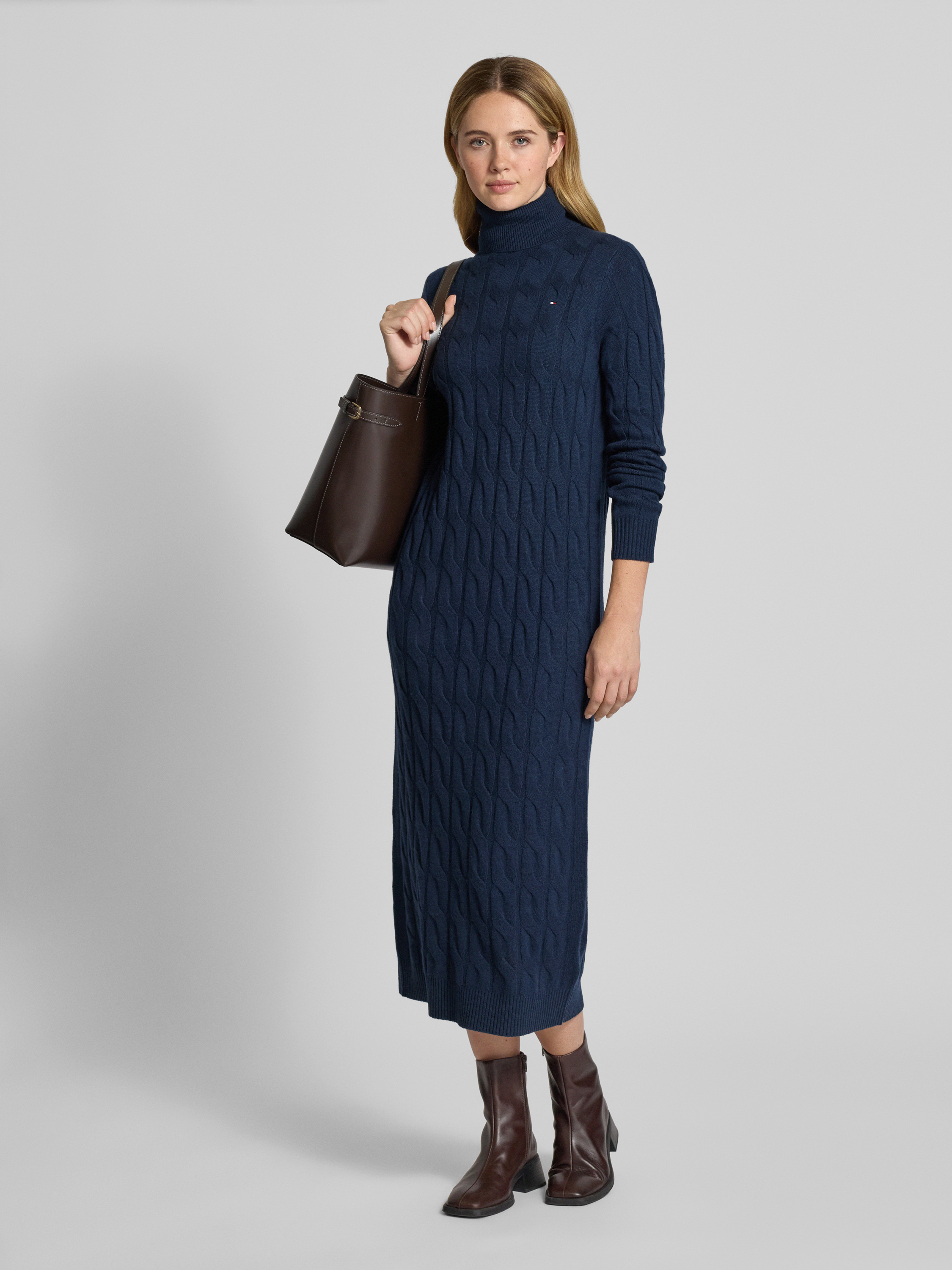 Das Strickkleid von Tommy Hilfiger fällt durch seine fließende Passform angenehm weich und lässt sich vielseitig kombinieren. Durch den hohen Rollkragen und die langen Ärmel entsteht ein wärmendes Tragegefühl, während die hochwertige Wolle den Stoff besonders anschmiegsam wirken lässt. Unifarben gestaltet, fügt sich das Kleid dezent in verschiedene Outfits ein.