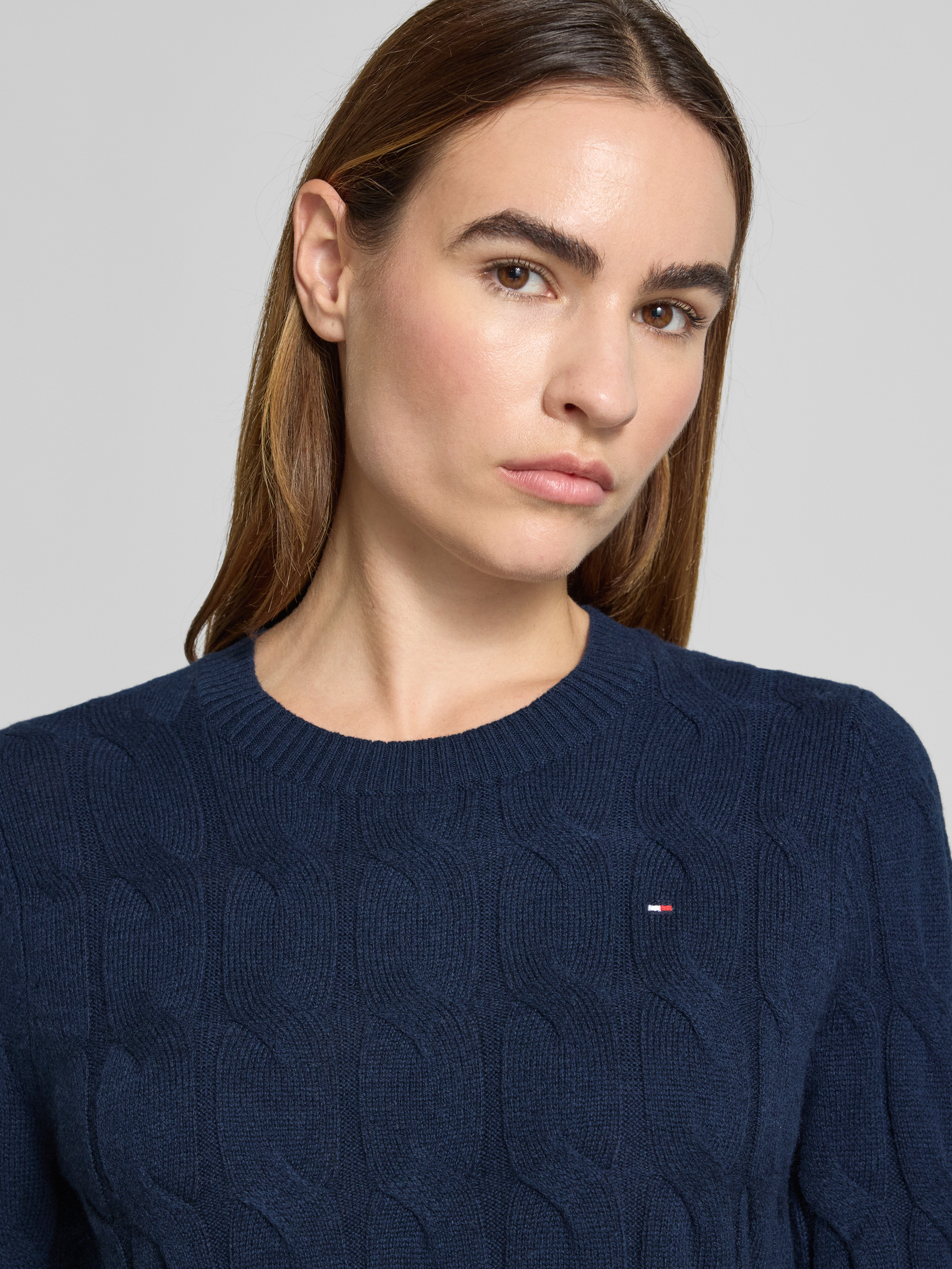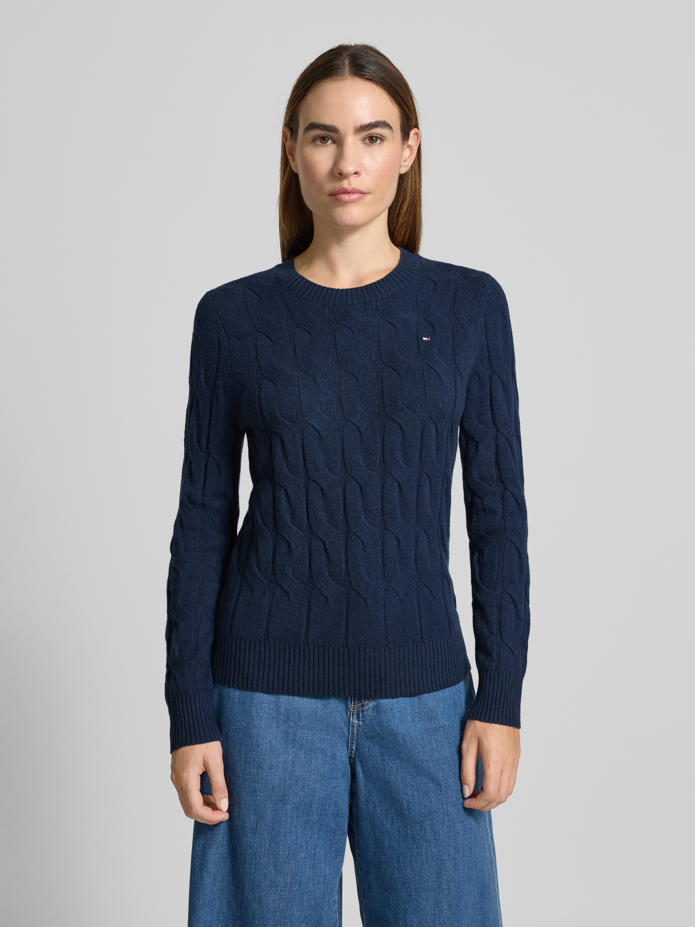 Der Damen Regular Fit Strickpullover von Tommy Hilfiger zeichnet sich durch reine Wolle aus, wodurch ein angenehmes Tragegefühl entsteht und sich die natürliche Wärme besonders an kühleren Tagen bemerkbar macht. Das feine Zopf-Muster und die unifarbene Optik geben dem Strickpullover einen zeitgemäßen, vielseitigen Charakter. Durch den klassischen Rundhals und die langen Ärmel eignet sich das Modell sowohl für entspannte Momente als auch für den Alltag.