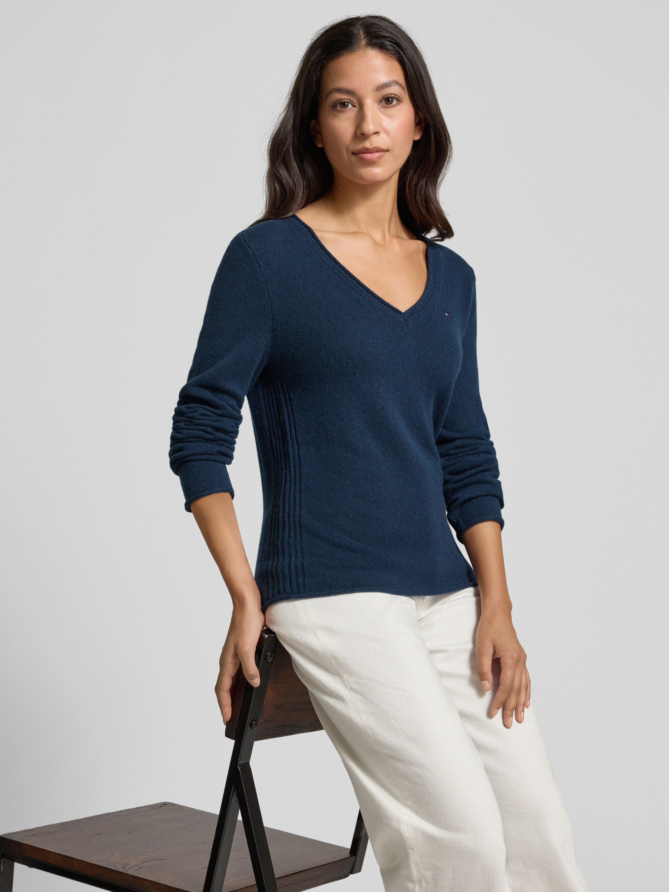 Der Damen Strickpullover von Tommy Hilfiger zeigt sich im Slim-Fit und legt sich dank reiner Wolle angenehm auf die Haut. Durch die Struktur und den V-Ausschnitt entsteht ein moderner Look, der Bewegung zulässt und vielseitig wirkt. Dezentes Logo-Stitching rundet das Design ab.