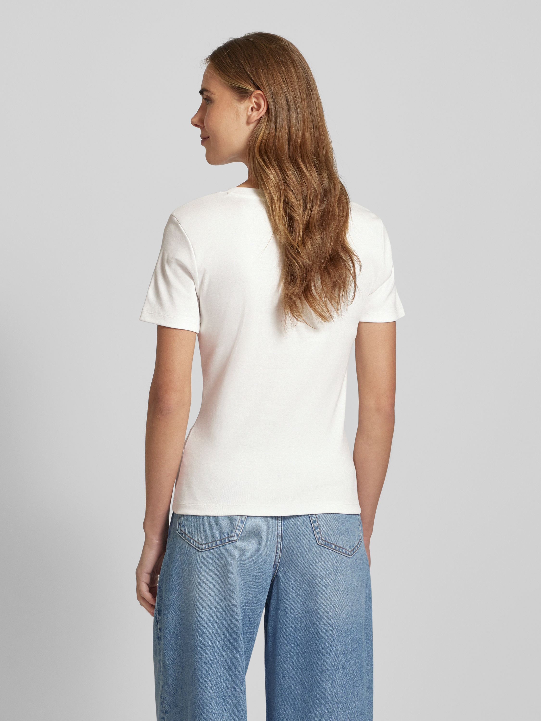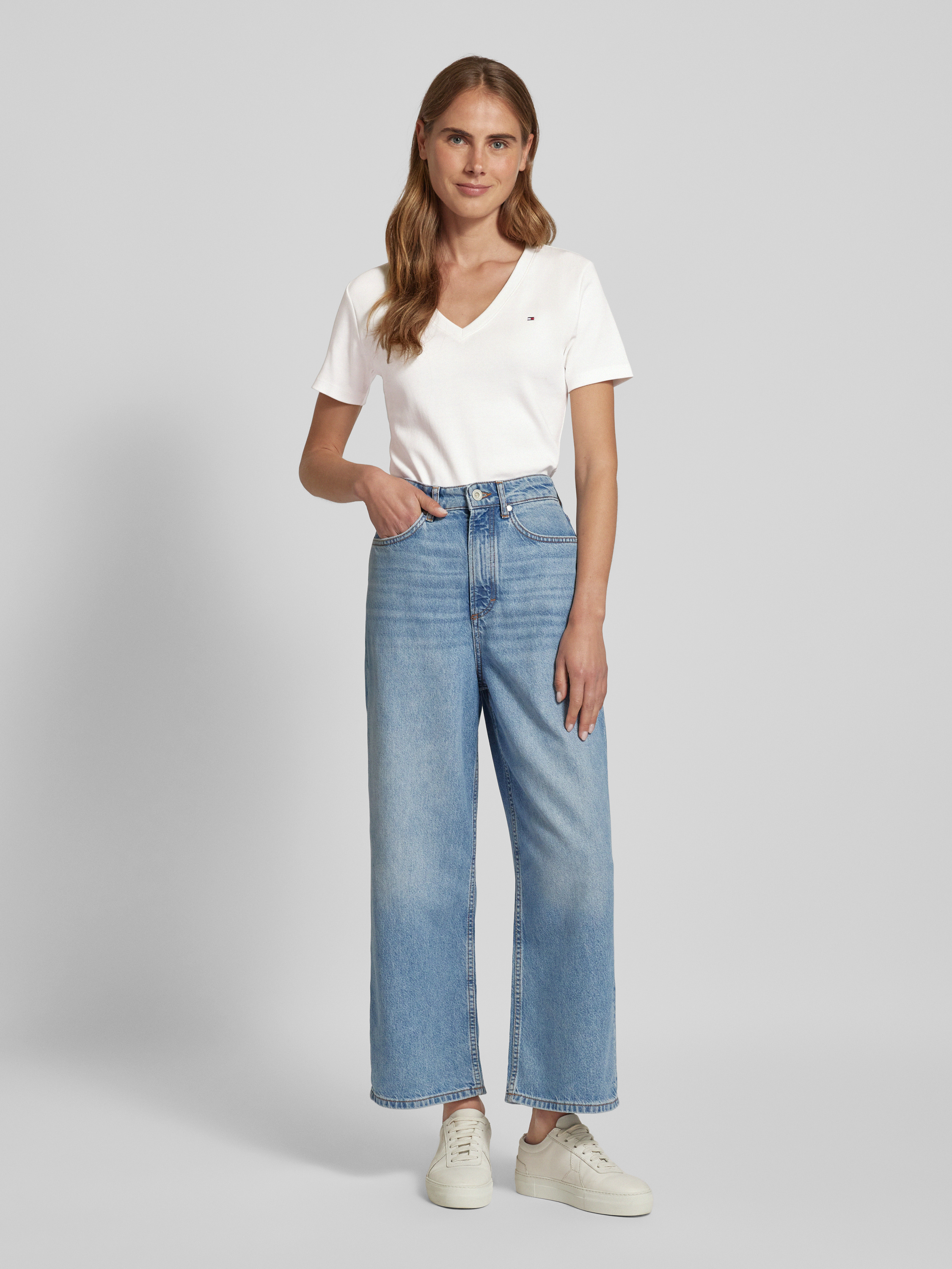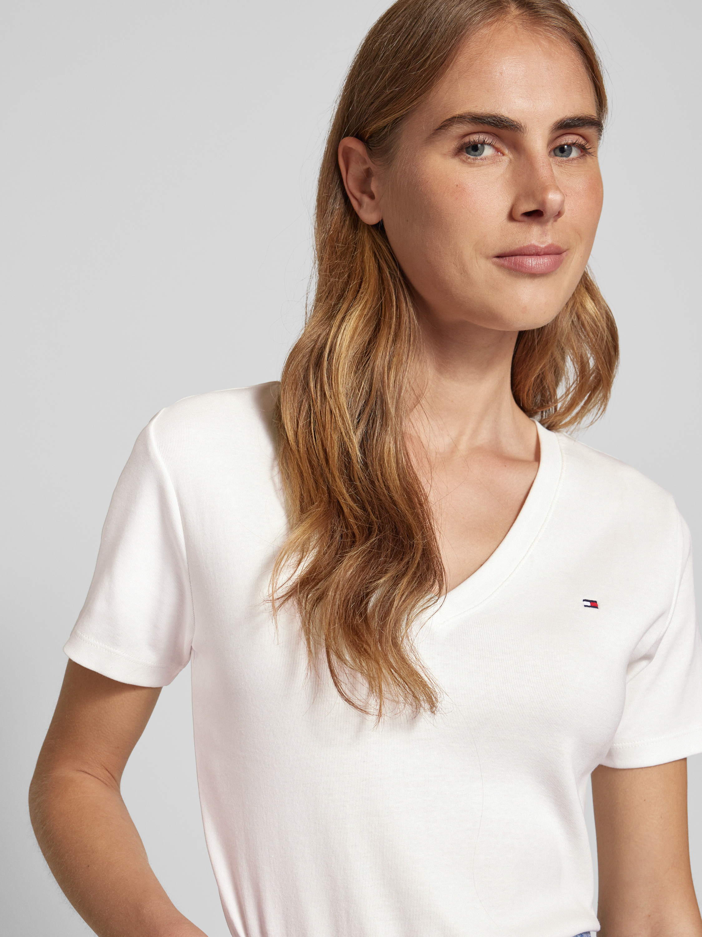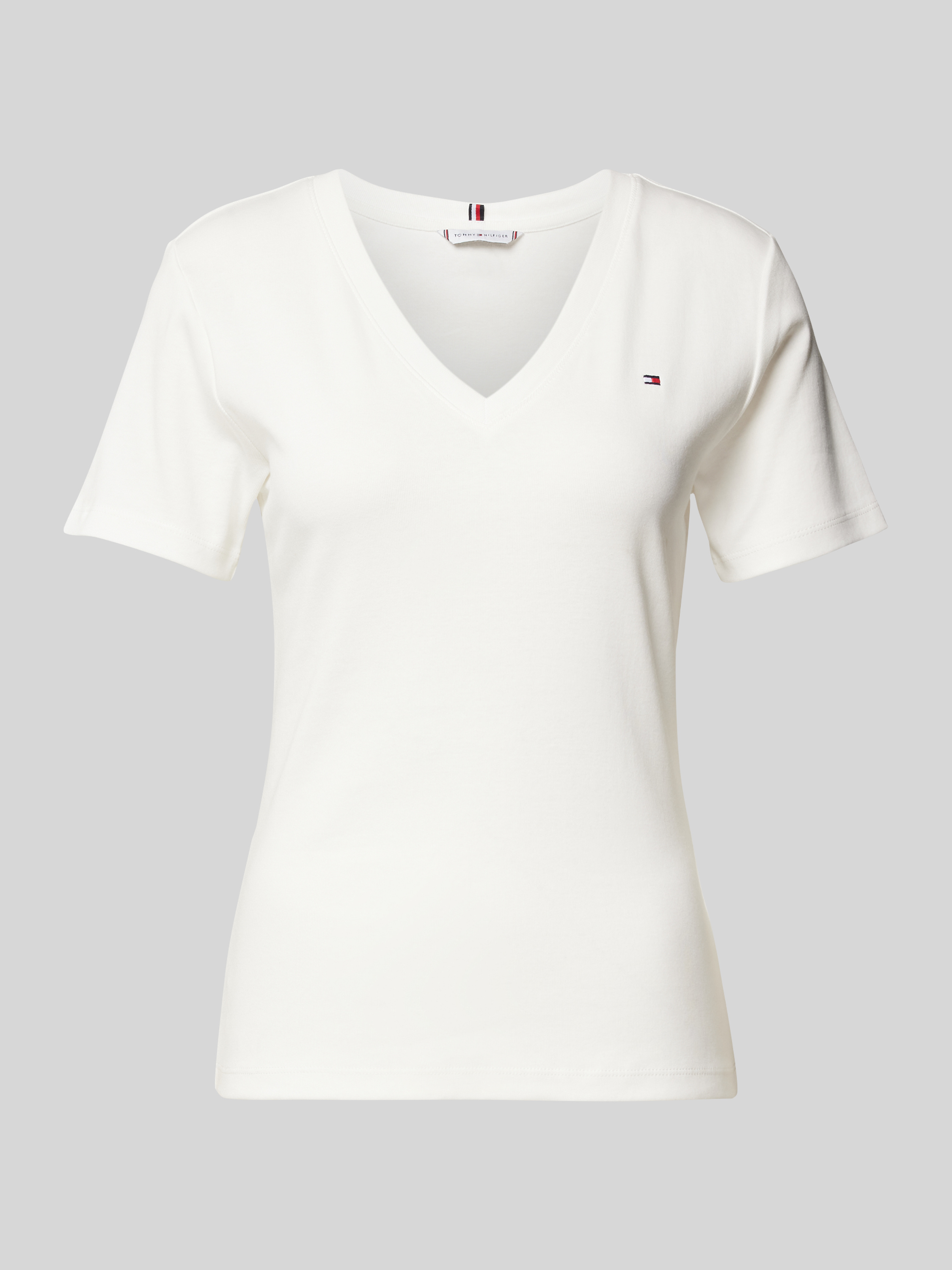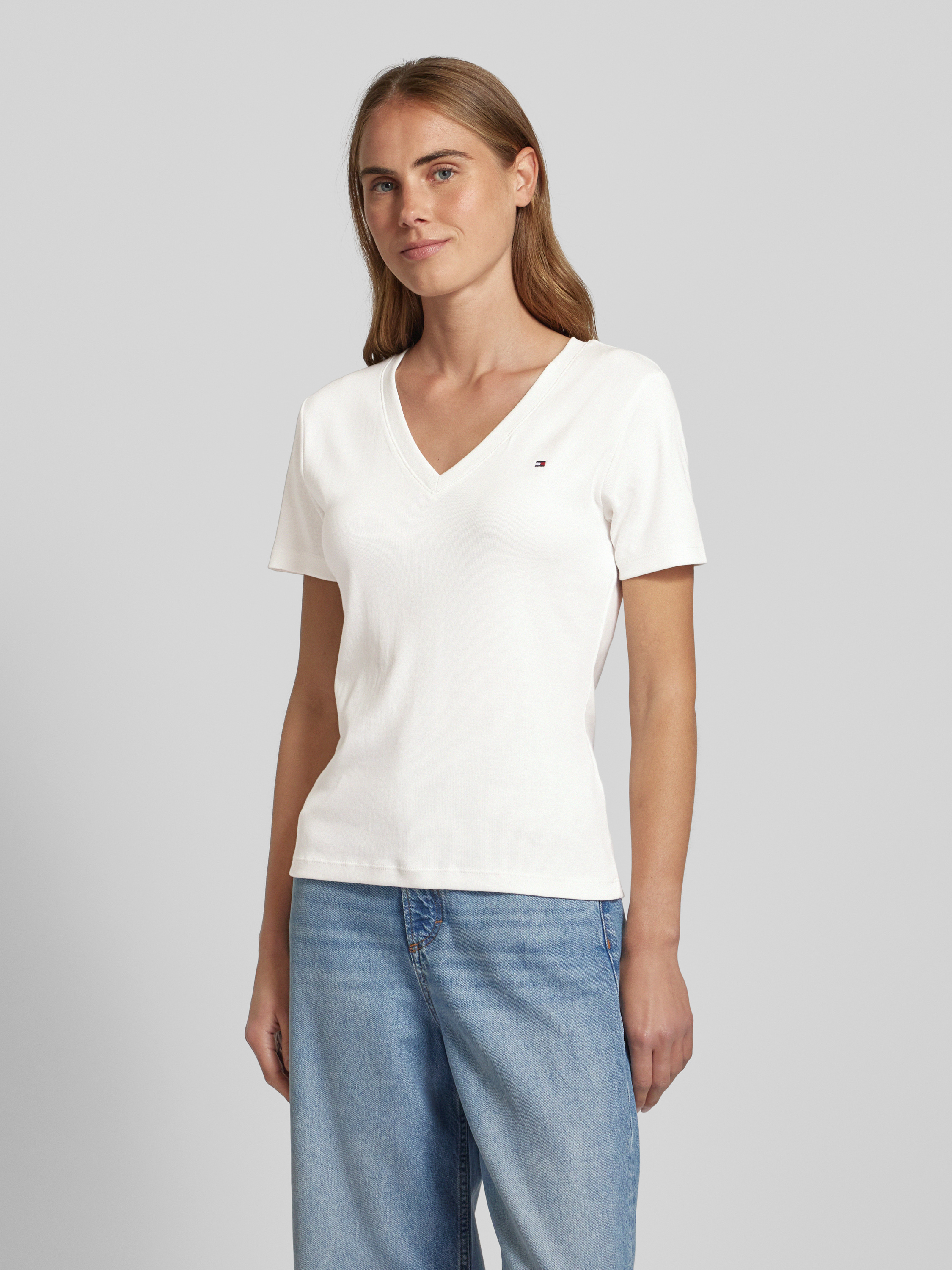 Das Damen T-Shirt 'CODY' von Tommy Hilfiger aus reiner Baumwolle kombiniert Komfort mit einem ansprechenden Slim Fit. Ein dezentes Logo-Stitching und der V-Ausschnitt verleihen dem Modell einen modernen, eleganten Look, der sich ideal für vielseitige Kombinationen im Alltag eignet.