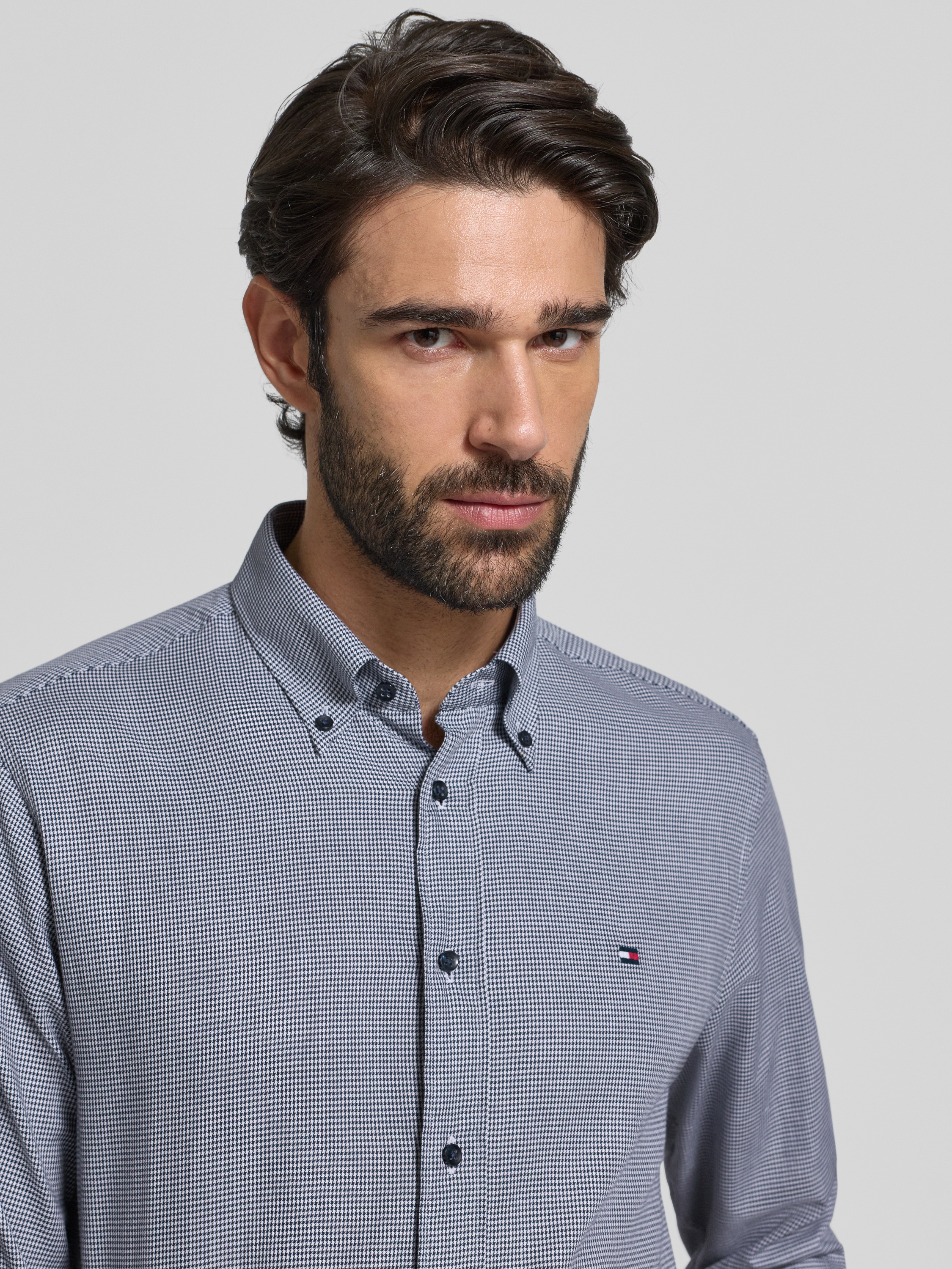 Das Herren Businesshemd von Tommy Hilfiger präsentiert sich im Regular-Fit und vereint ein klassisches Vichy-Muster mit einem dezenten Allover-Muster. Dank reiner Baumwolle fühlt sich das Hemd angenehm auf der Haut an und unterstützt ein ausgeglichenes Trageklima. Durch den Button-Down-Kragen und den leicht abgerundeten Rumpfabschluss entsteht ein gepflegtes Gesamtbild, das sich vielseitig kombinieren lässt.