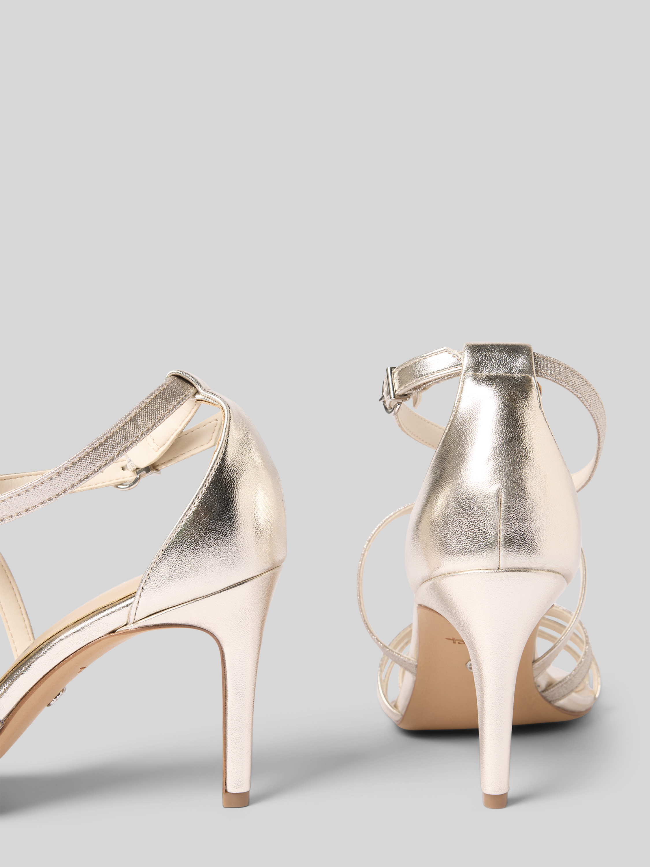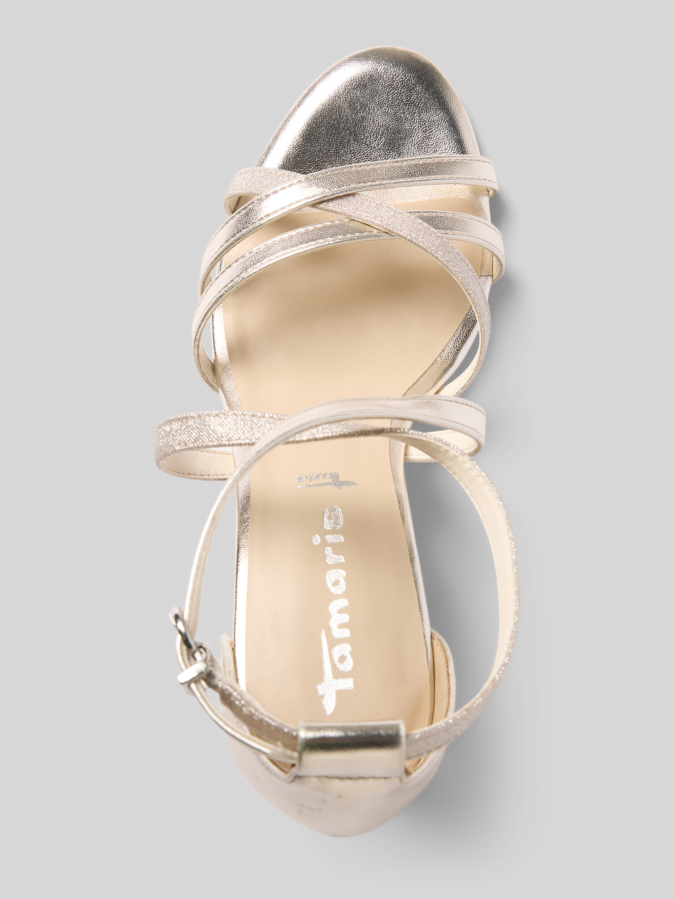 Die Sandaletten von Tamaris zeichnen sich durch ihre elegante Silhouette mit einer abgerundeten Spitze aus und bieten dank der strukturierten Sohle einen sicheren Tritt. Eine Dornschließe sorgt für einen festen Halt, während der 9 cm hohe Absatz eine feminine Note verleiht.