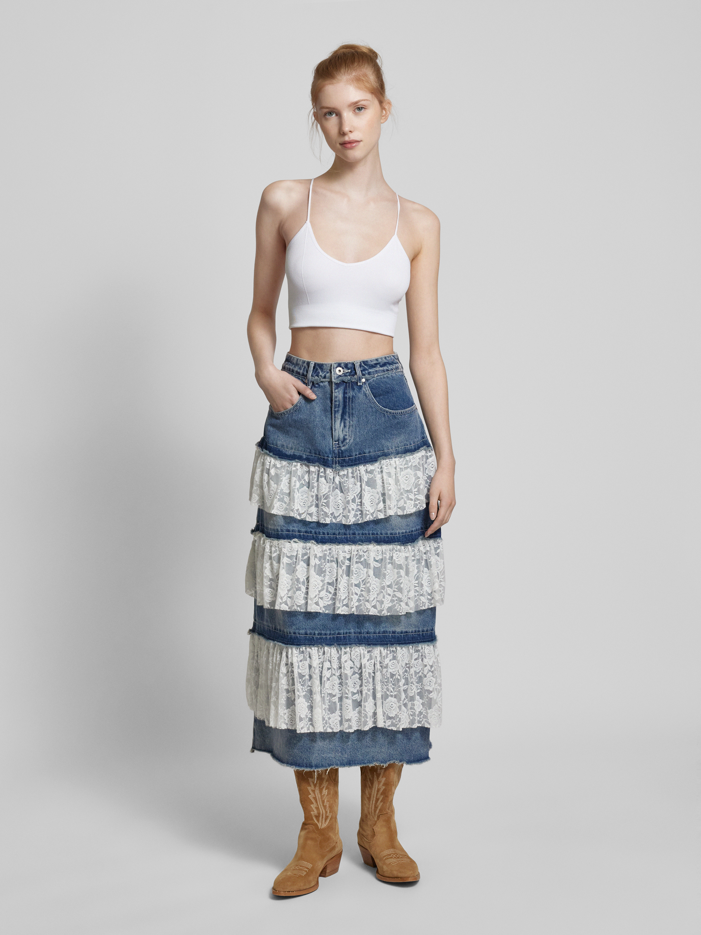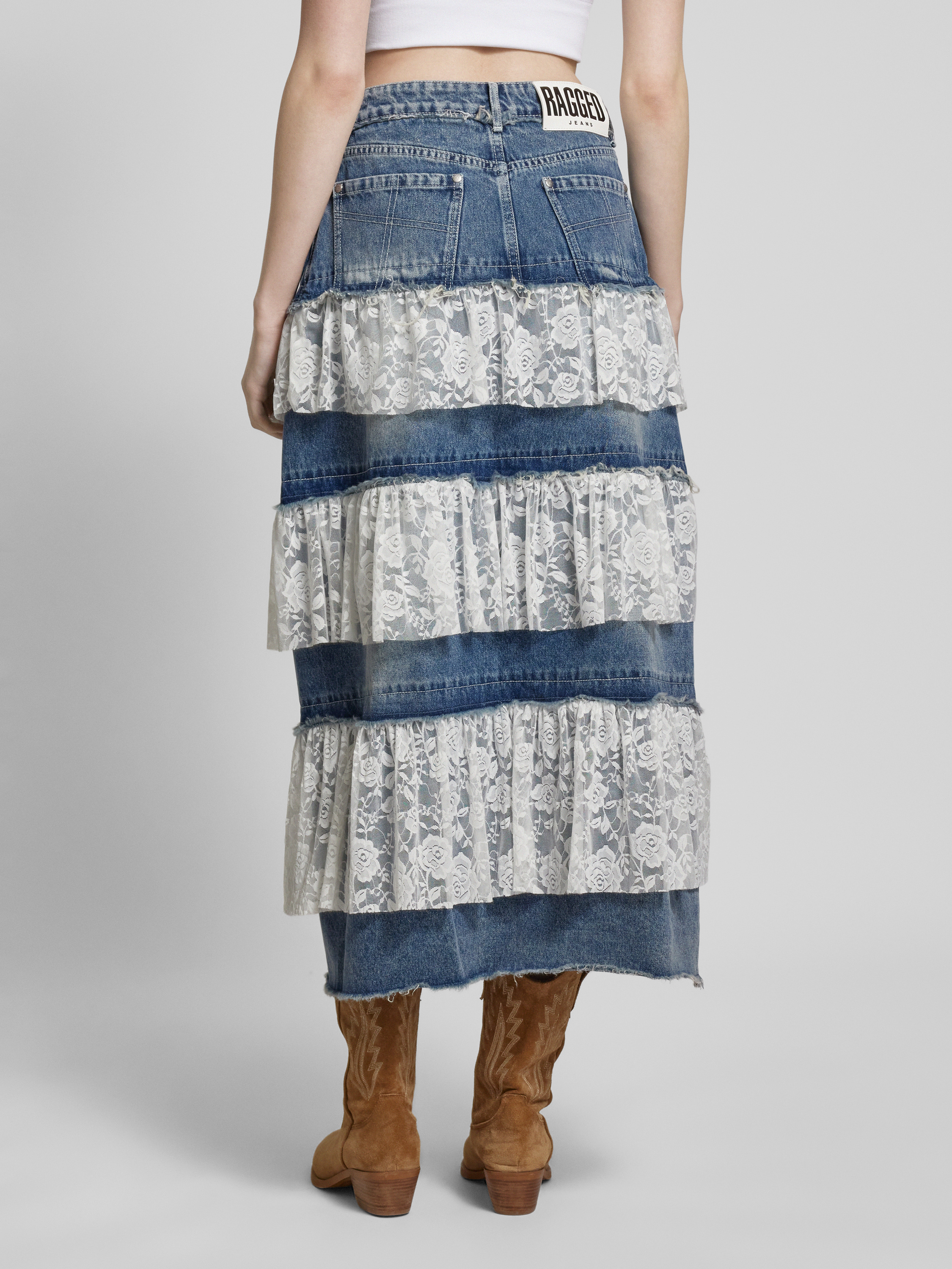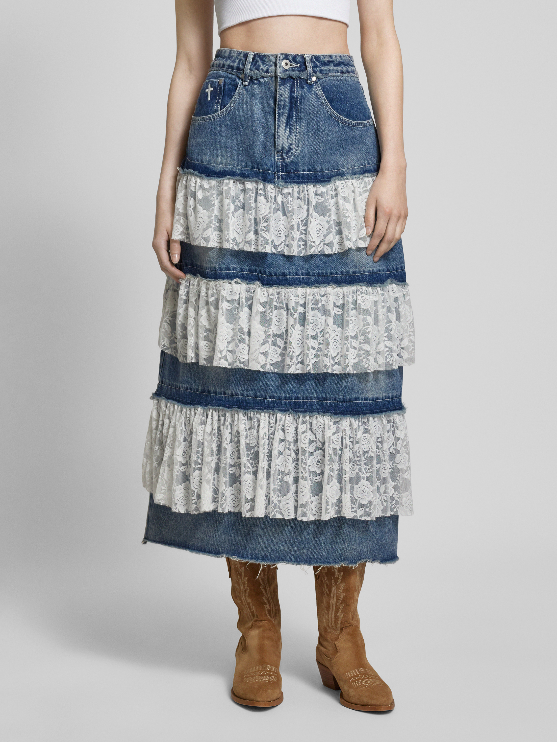 Der Jeansrock von The Ragged Priest, Modell 'BABYDOLL', kombiniert einen Baumwoll-Mix mit Viskose-Anteil in einem ausgestellten Schnitt. Der Maxirock beeindruckt mit einem verspielten Spitzenbesatz und einem Stufen-Look, der mühelos feminine Akzente setzt und Bewegungsfreiheit gewährt. Ein einzigartiges Motiv-Stitching rundet das Design harmonisch ab.