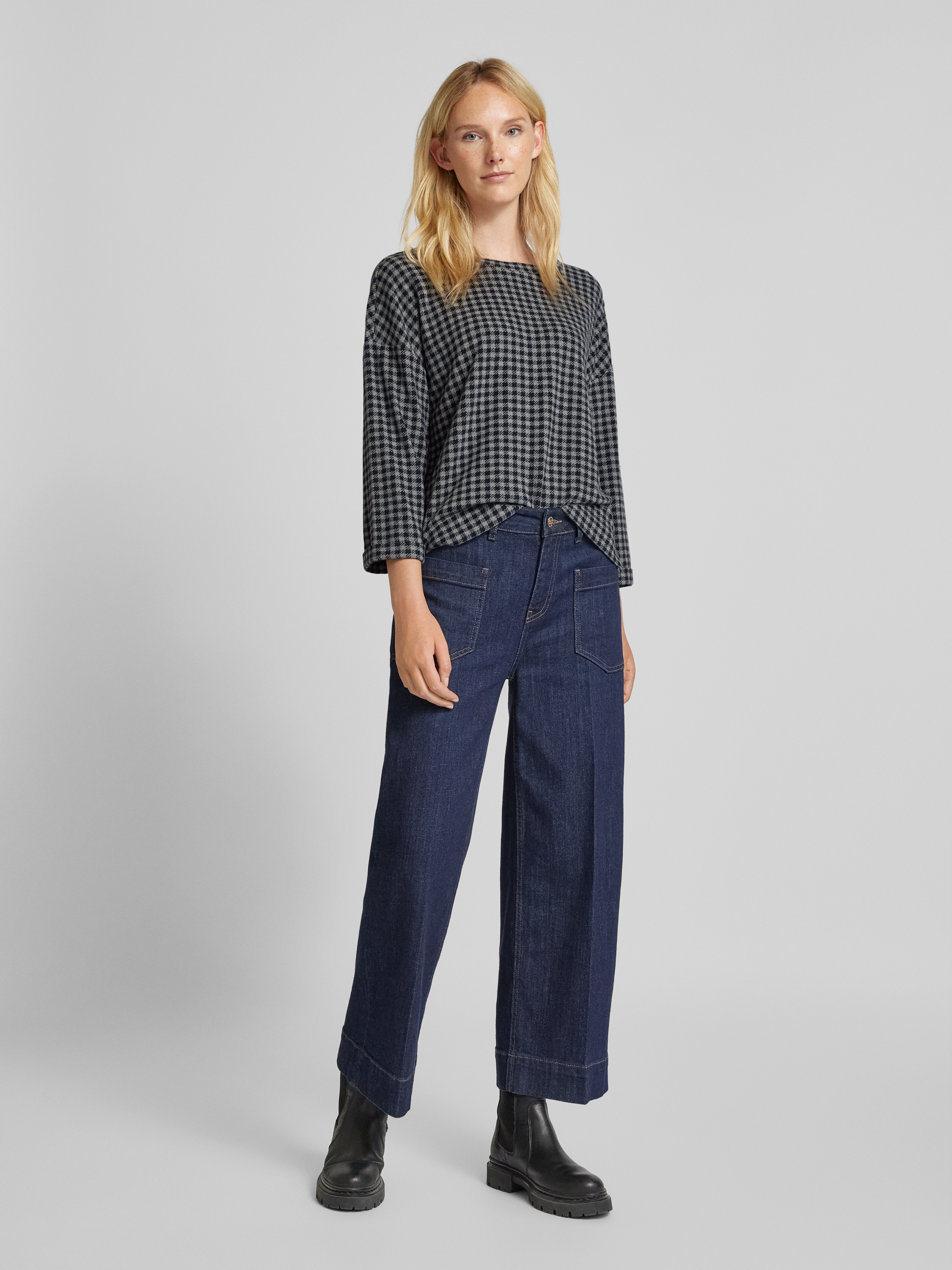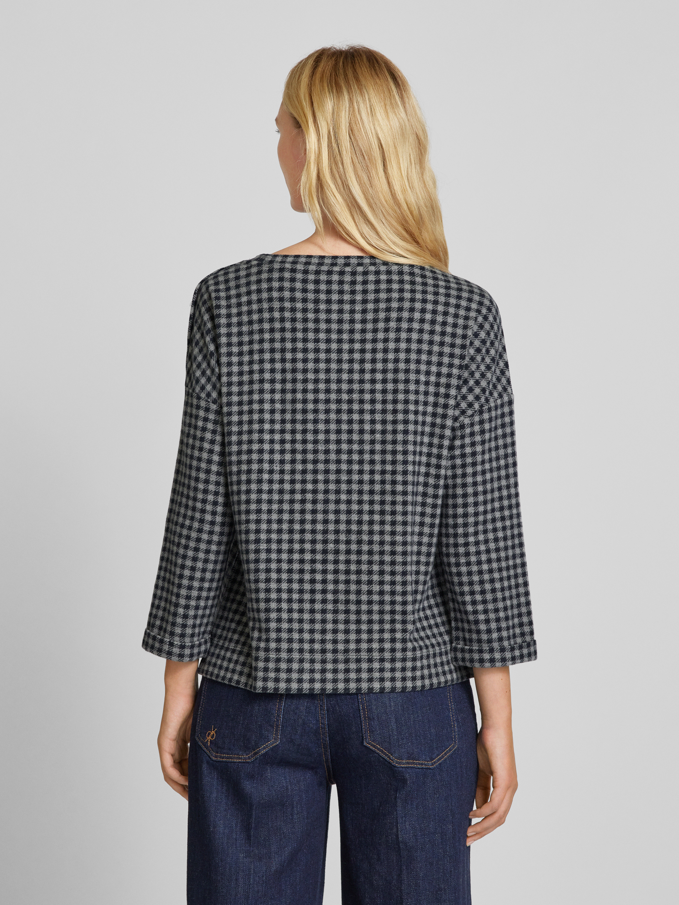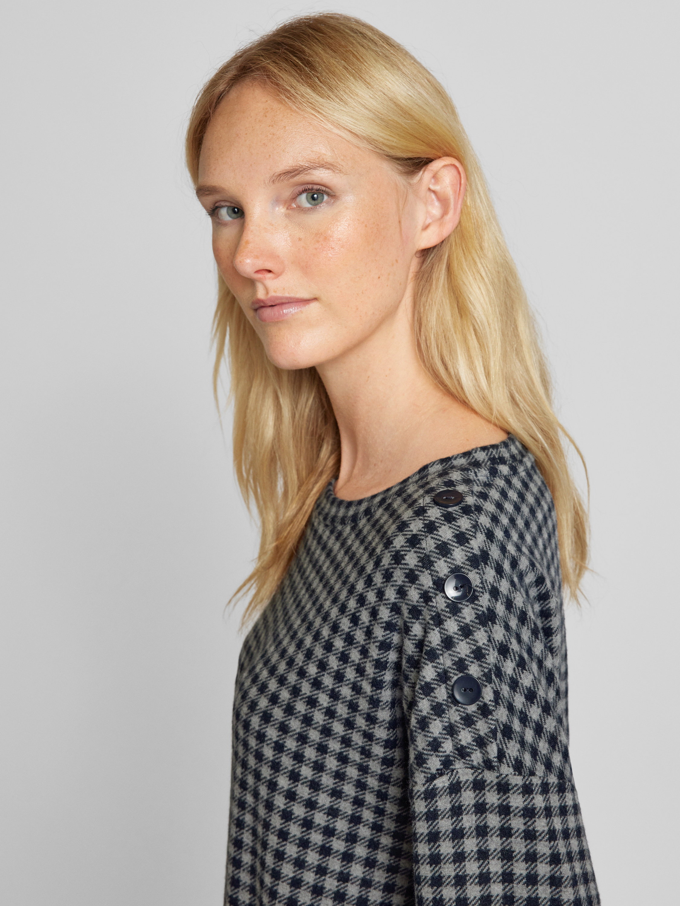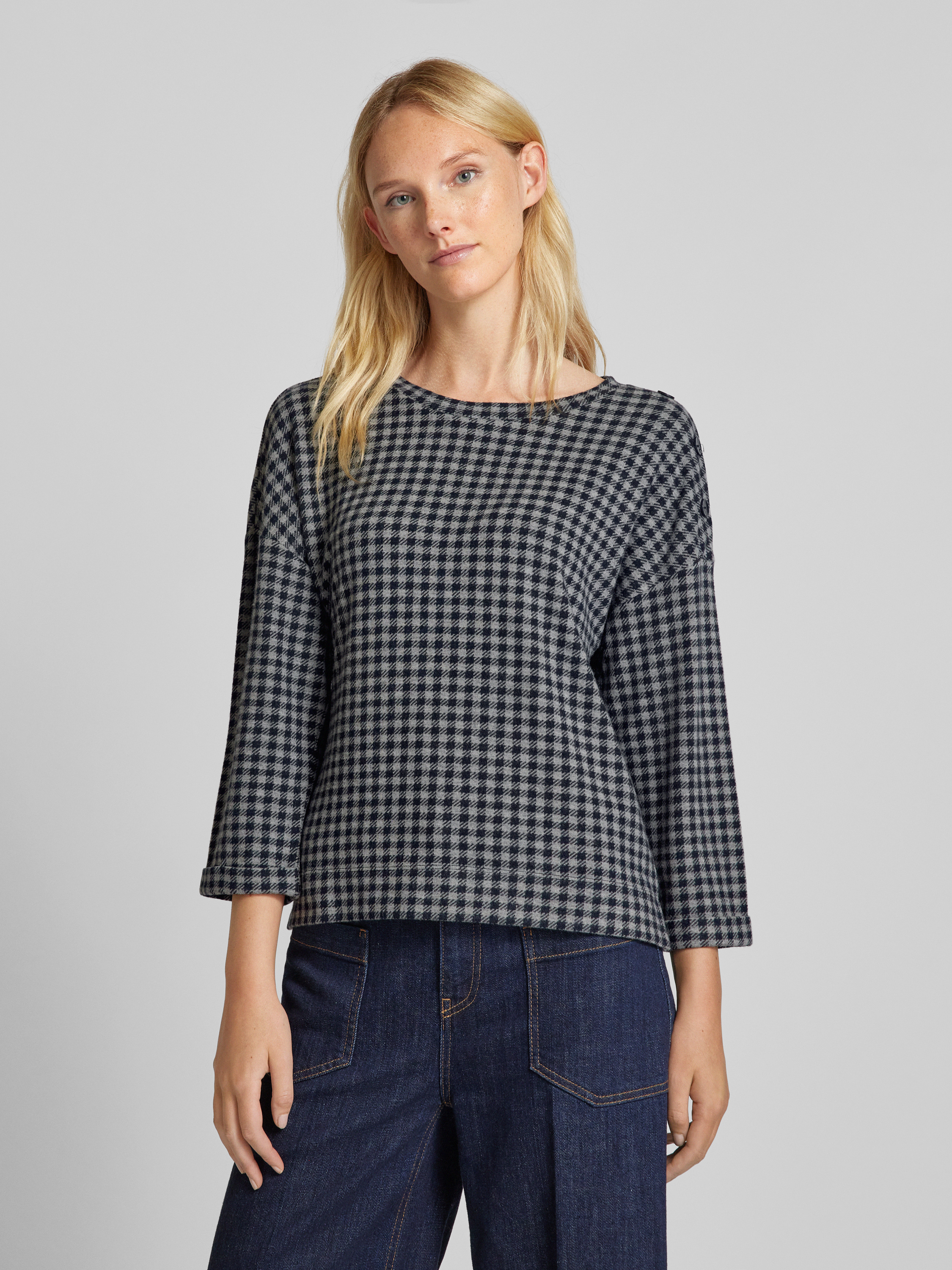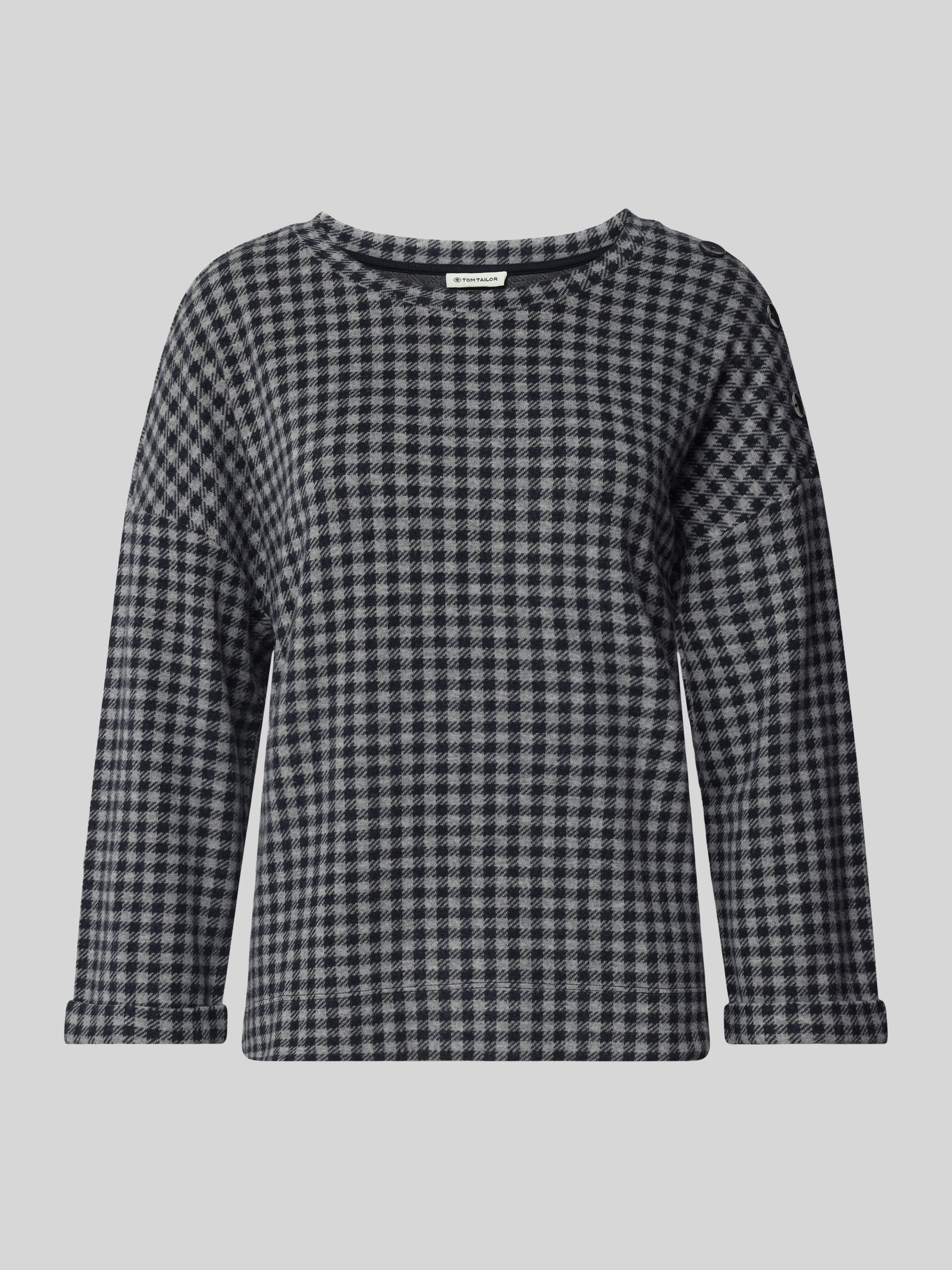Das Damen Sweatshirt von Tom Tailor kombiniert ein charmantes Allover-Karo-Muster mit einem bequemen Regular Fit. Ein Crew-Neck-Kragen und 3/4-Ärmel mit fixiertem Umschlag sorgen für eine lässige Note, während die Zierknopfleiste an der Schulter stilvolle Akzente setzt. Die Seitenschlitze bieten zusätzliche Bewegungsfreiheit.