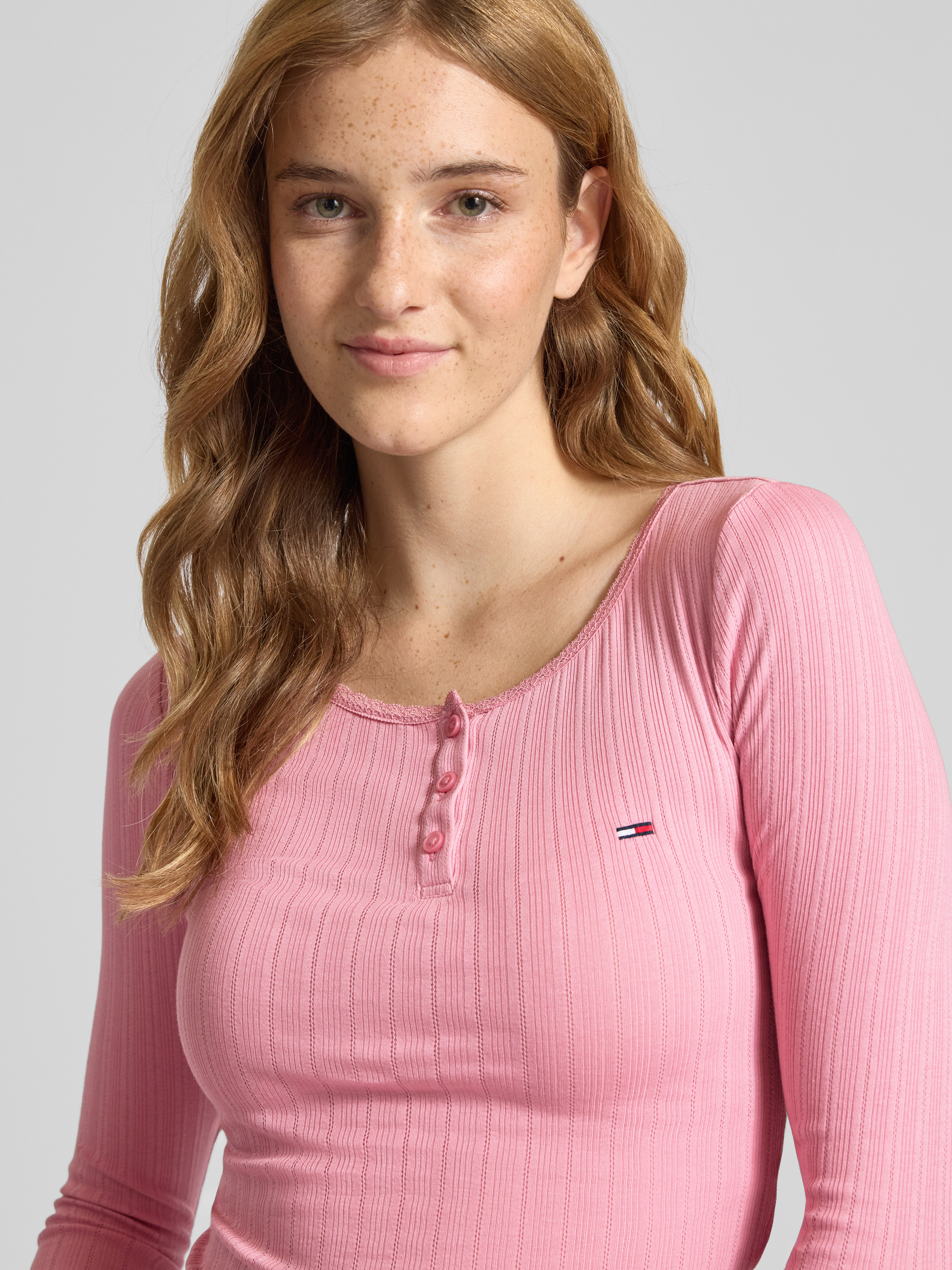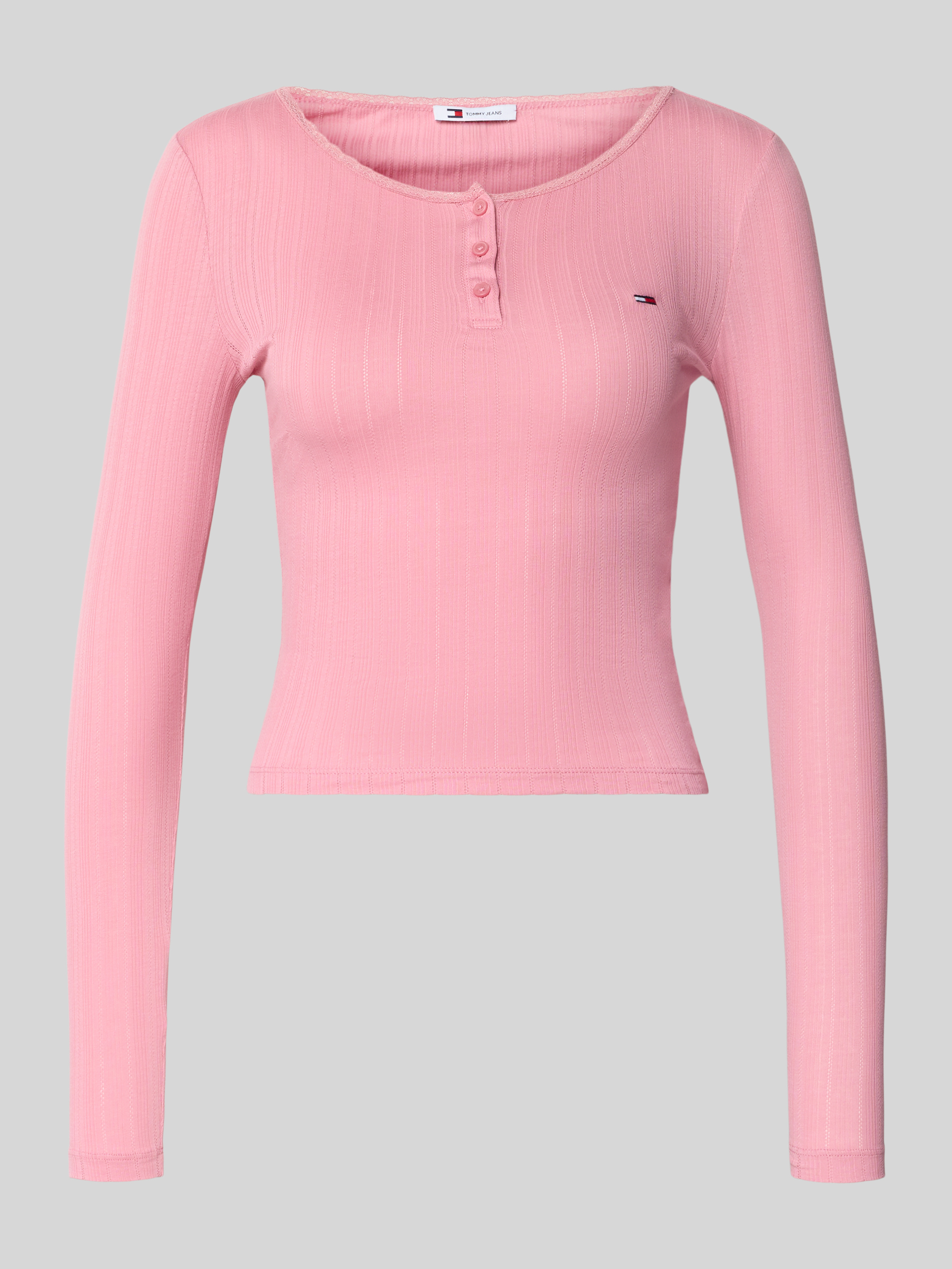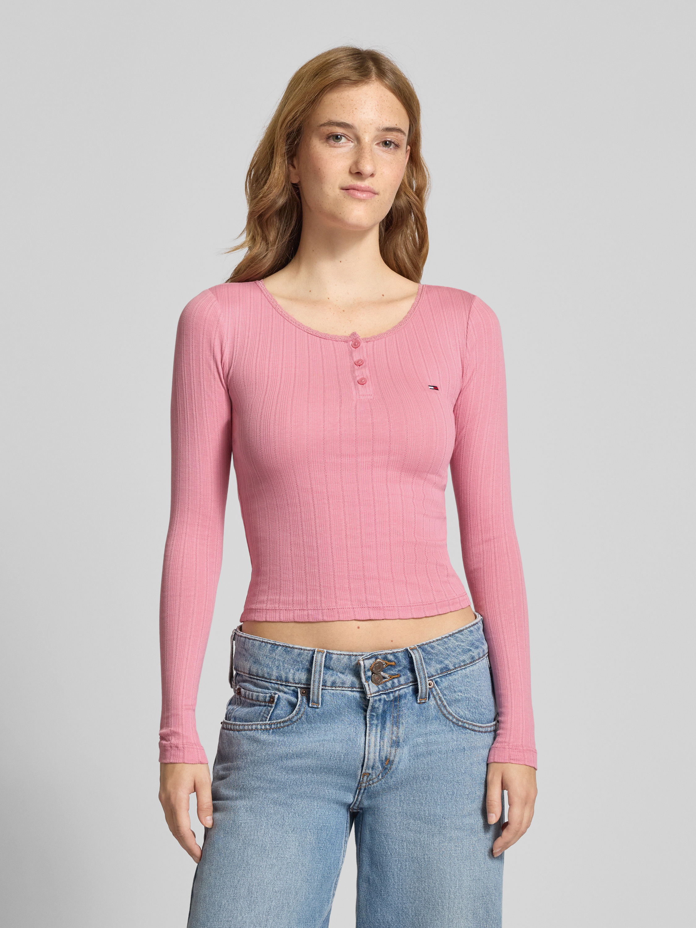 Das Damen Longsleeve von Tommy Jeans fällt durch seine schmale Passform und die dezente Rippstruktur angenehm auf. Der Henley-Ausschnitt und feine Spitzenbesätze sorgen für eine feminine Note, während der Baumwolle-Mix für ein komfortables Tragegefühl im Alltag steht. Dank unifarbener Optik und Logo-Stitching lässt sich das Shirt vielseitig kombinieren.