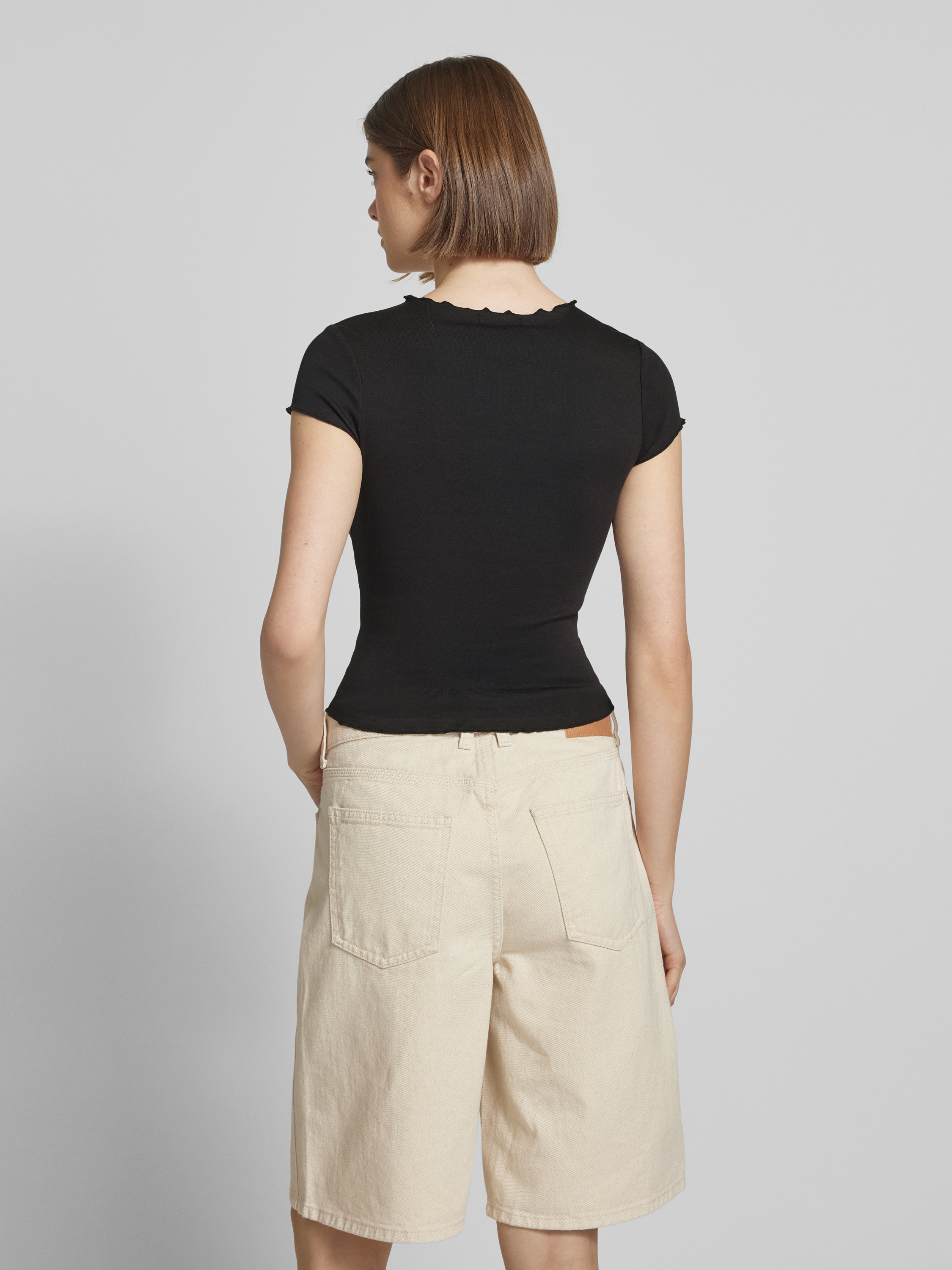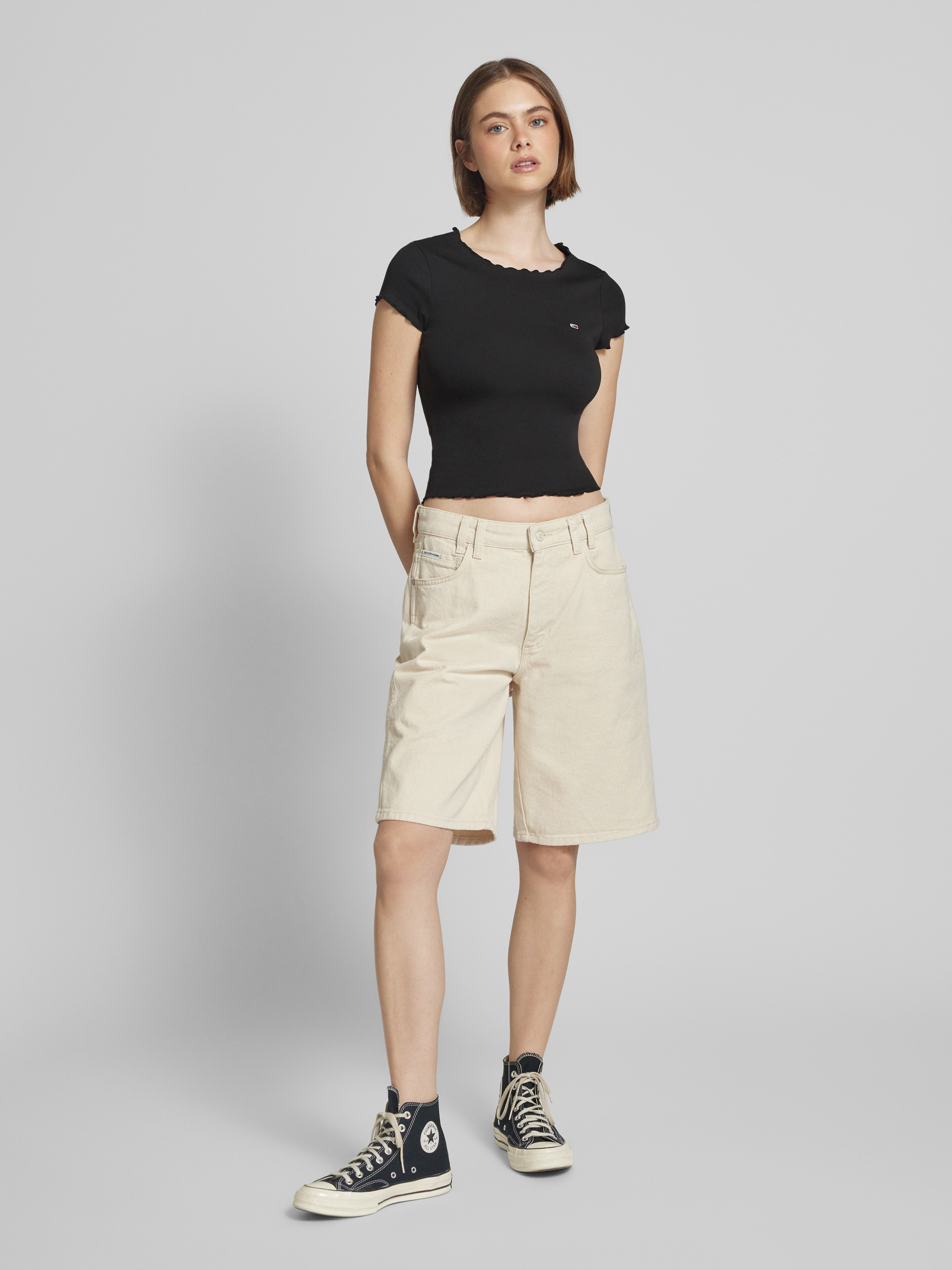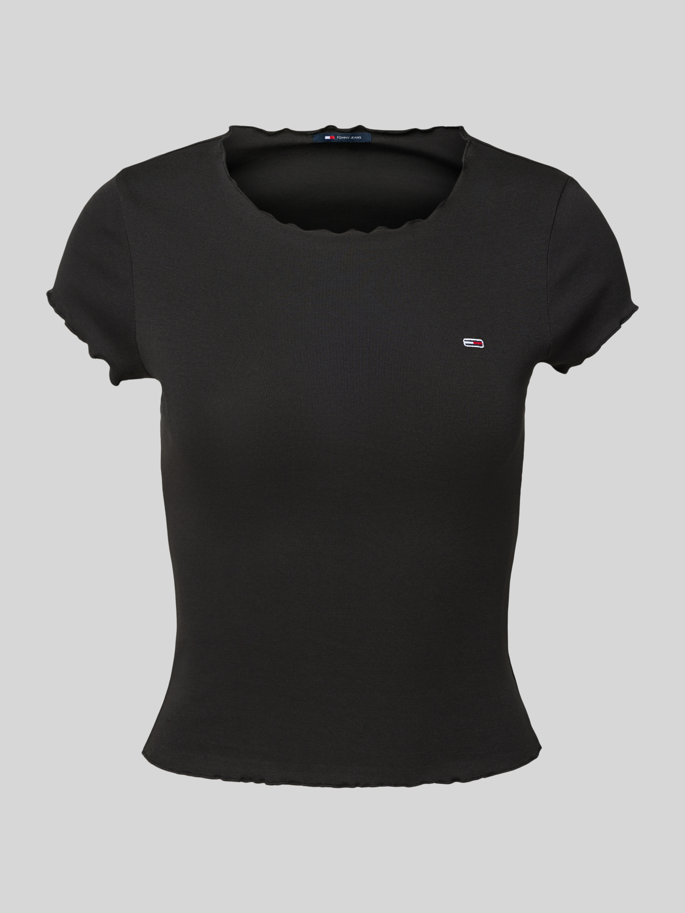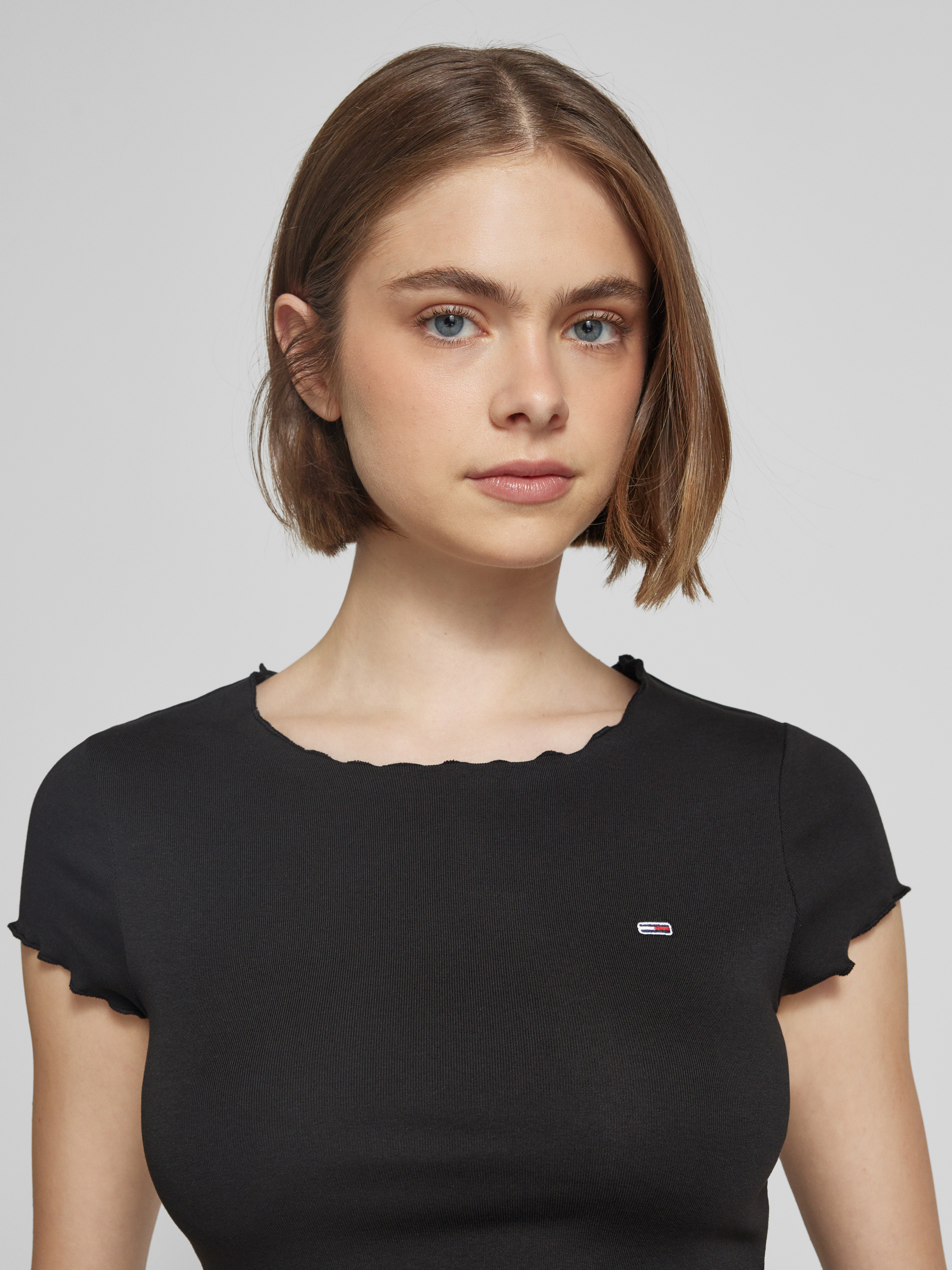 Das Damen T-Shirt von Tommy Jeans vereint mit seinem Slim Fit-Schnitt eine schmeichelhafte Passform, die Bewegungsfreiheit und Komfort bietet. Der weiche Baumwoll-Elasthan-Mix sorgt für ein angenehmes Tragegefühl, während die fröhlichen Frill-Details am Rundhals und den Ärmeln einen verspielten Akzent setzen. Mit seinem schlichten Design eignet es sich hervorragend für vielseitige Kombinationen im Alltag.
