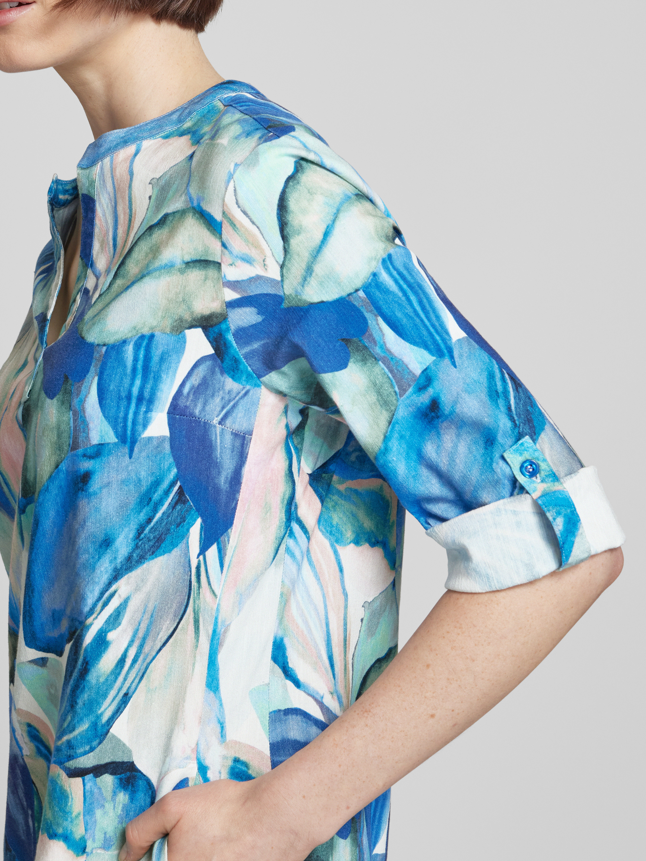 Das knielange Tunikakleid von TONI kombiniert einen Viskose-Mix mit Leinen-Anteil, der für angenehme Leichtigkeit sorgt. Der gerade Schnitt und die regulierbare Ärmellänge bieten Flexibilität und Komfort. Der V-Ausschnitt ergänzt den Allover-Look zu einem vielseitigen Begleiter für jede Gelegenheit.