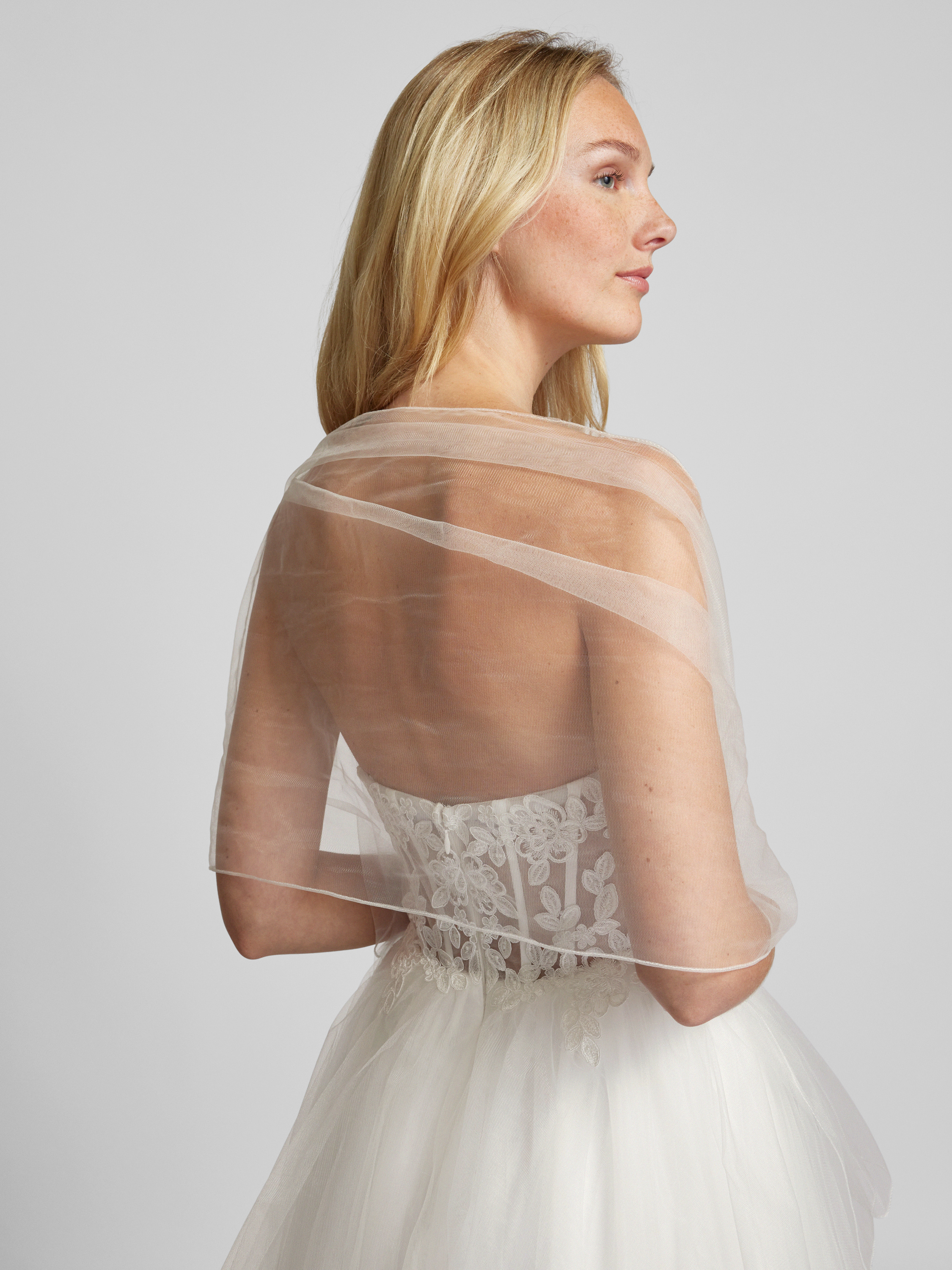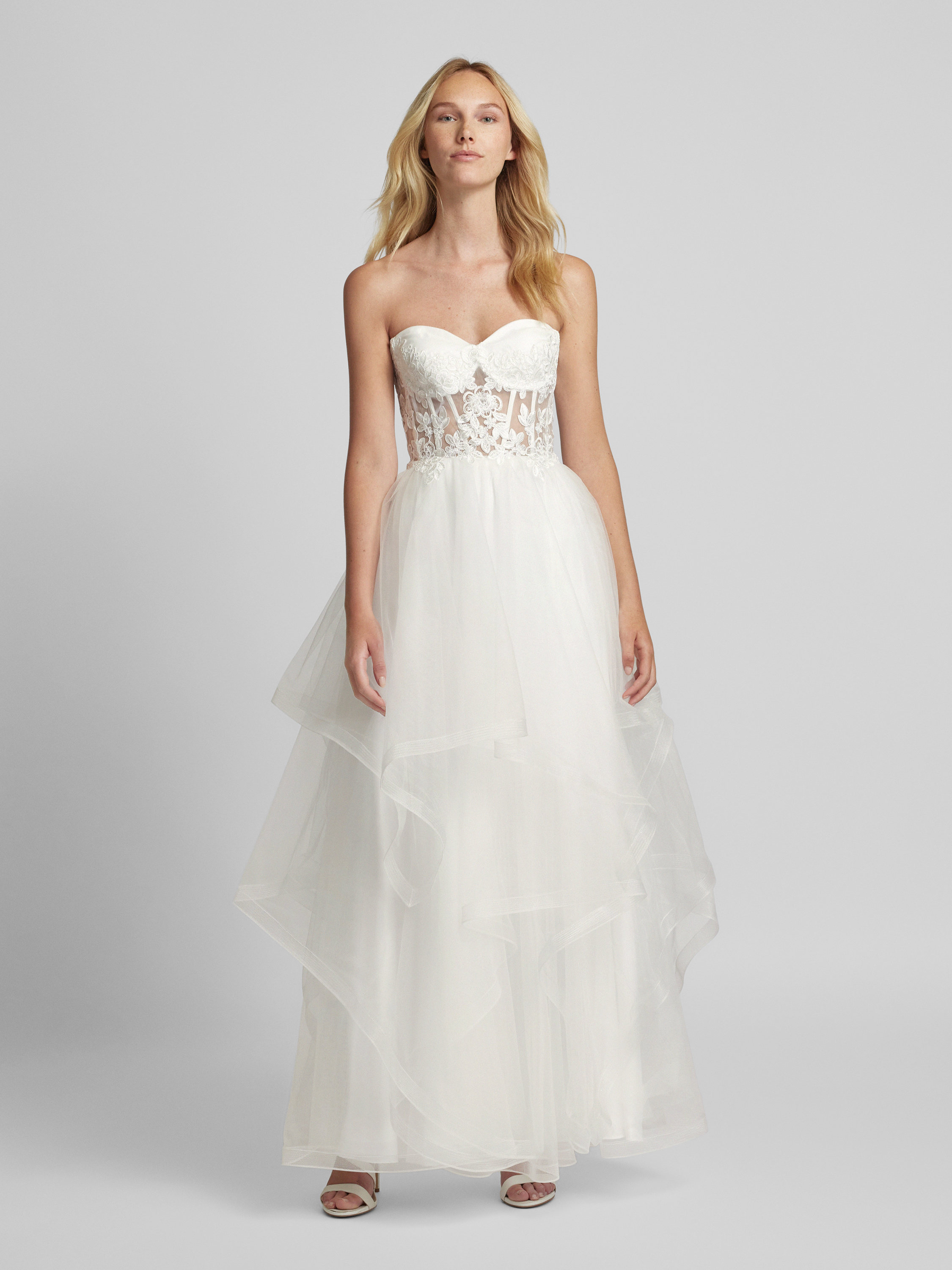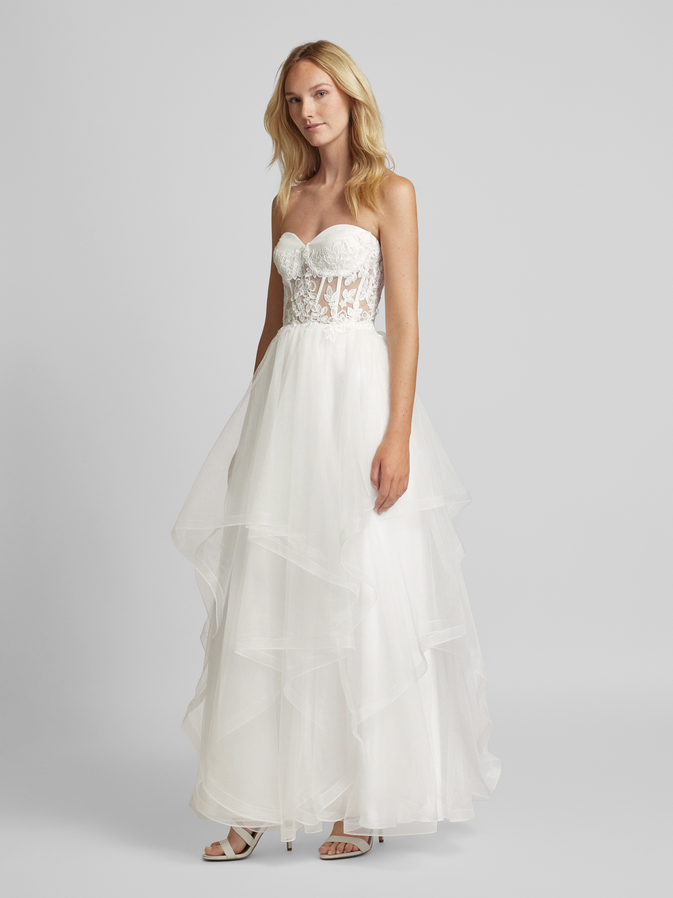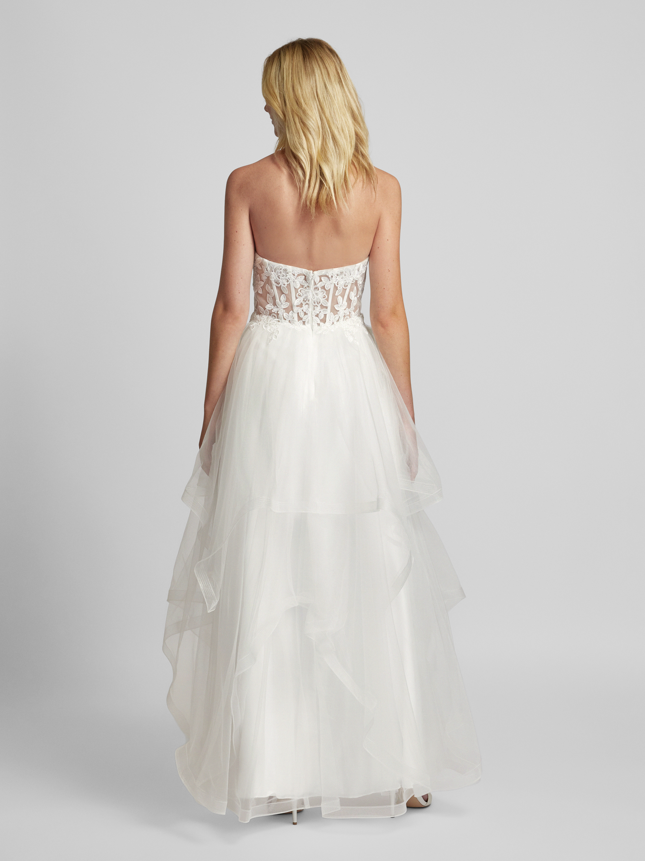 Das Brautkleid von unique vereint eine taillierte Passform mit einem eleganten Bandeau-Design. Der florale Spitzenbesatz auf dem semitransparenten Tüll sorgt für einen romantischen Look, während der Stufen-Look die Maxilänge betont. Ein Kleid, das feminine Eleganz auf besondere Weise verkörpert.