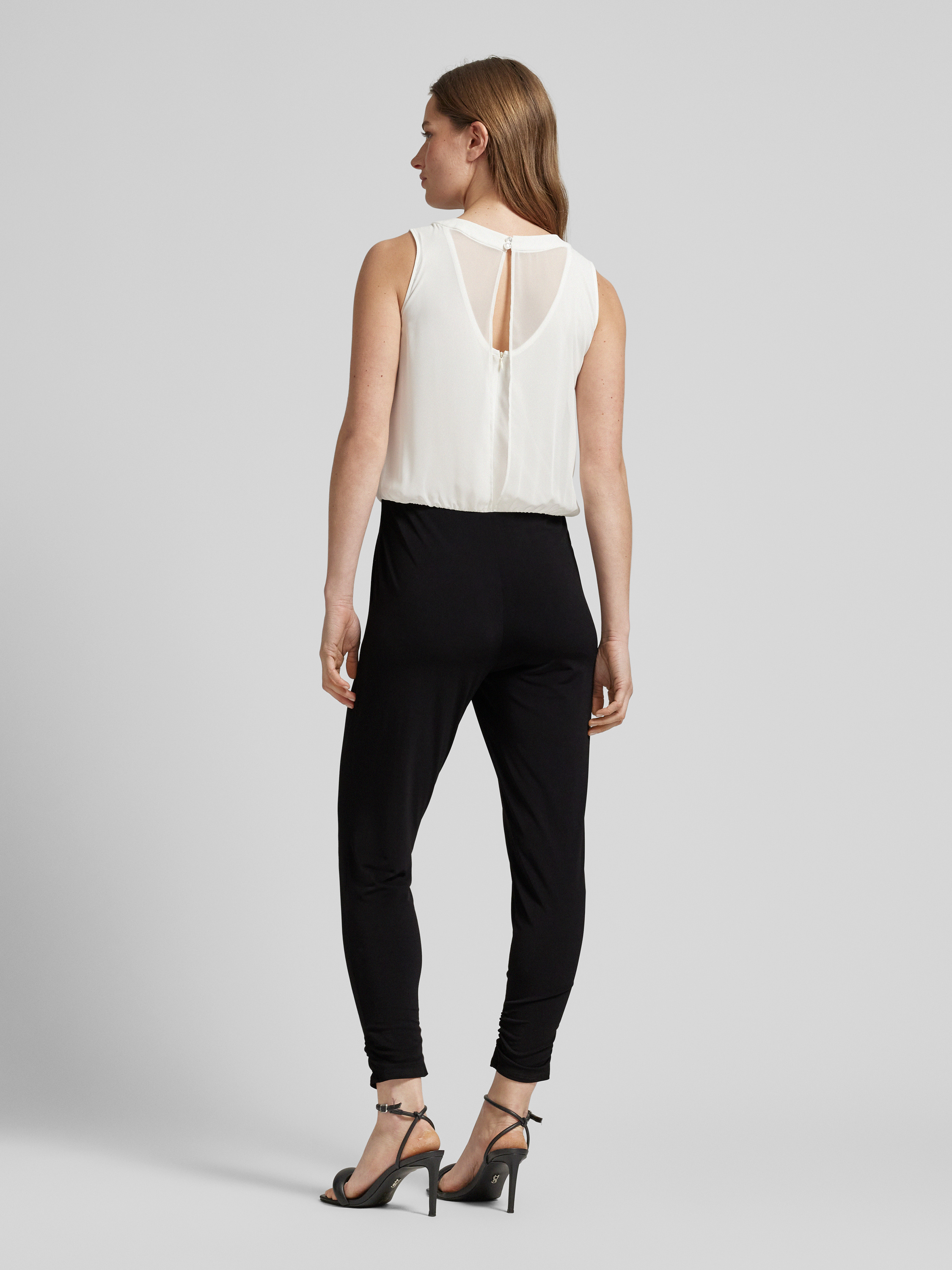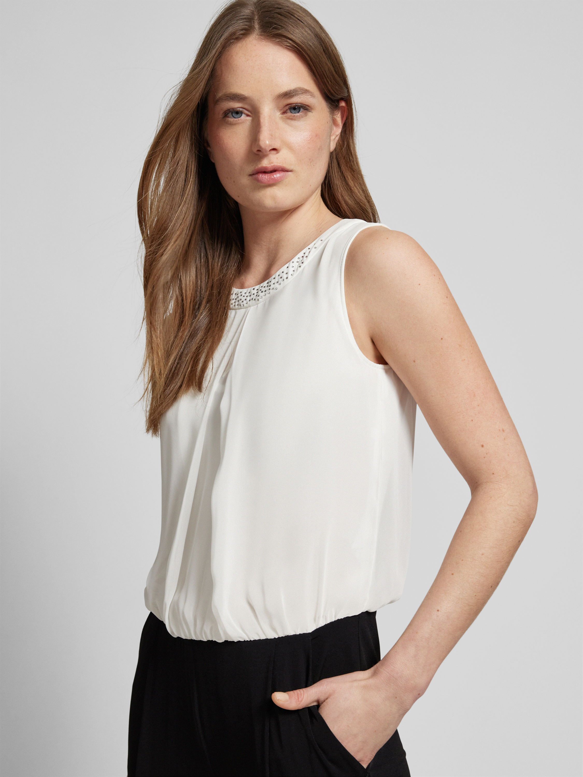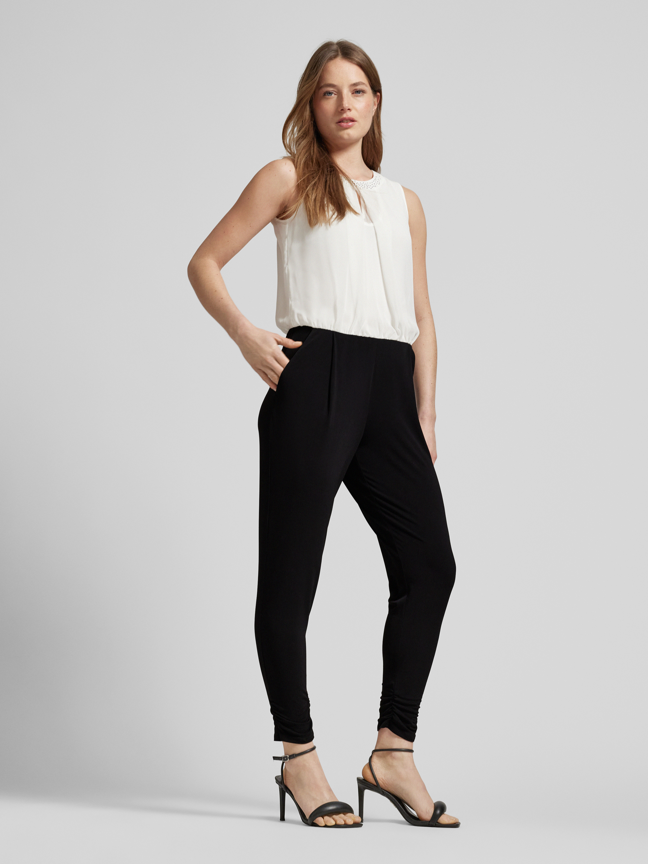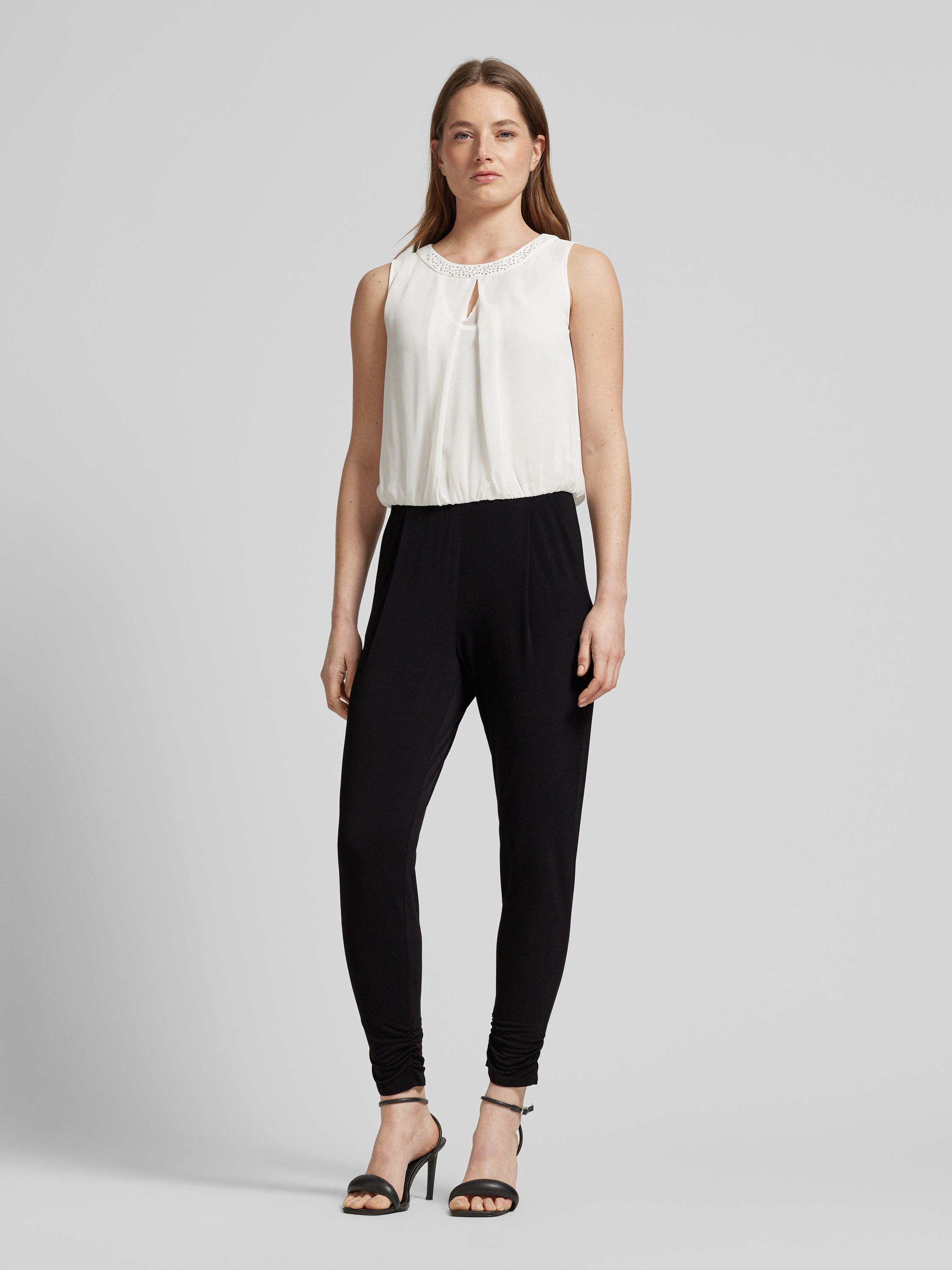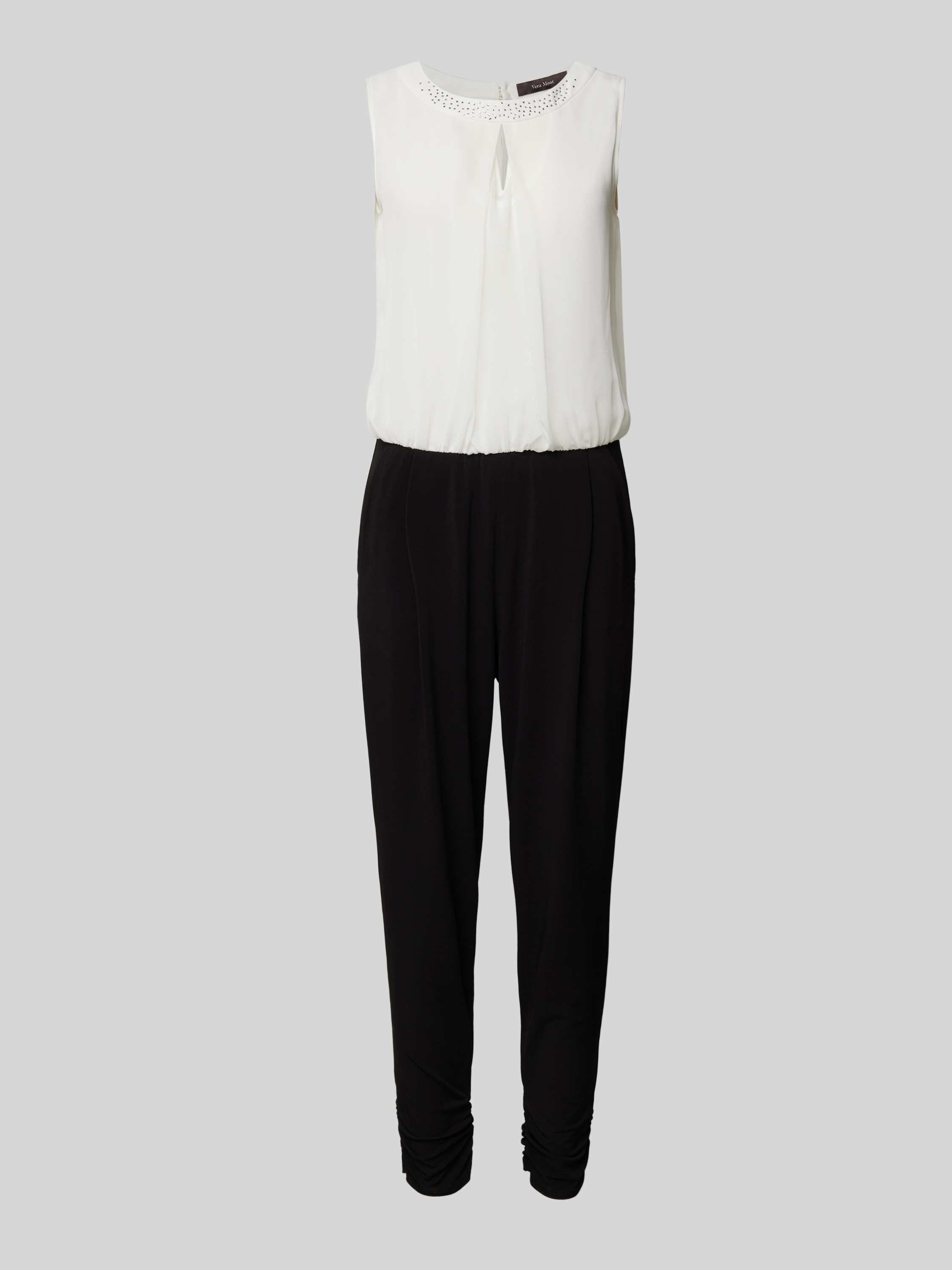 Der Jumpsuit von VM Vera Mont ist aus einem Material-Mix mit Stretch-Anteil gefertigt und gerade geschnitten. Er zeigt sich mit Strasssteinbesatz und Rundhalsausschnitt.