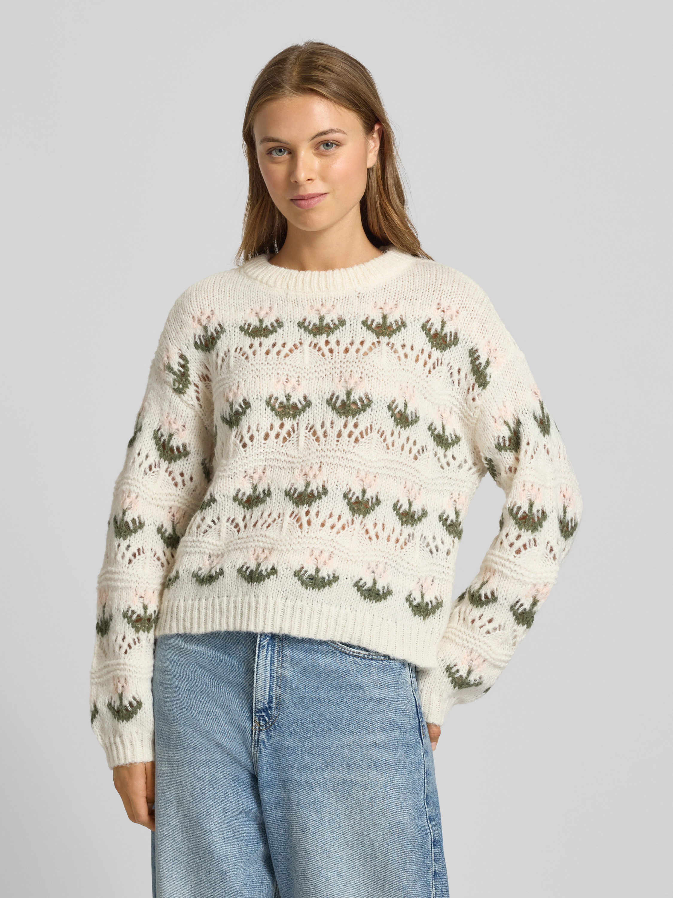 Der Damenpullover von Vero Moda, Modell Idelle, zeigt sich mit floralem Lochstrickmuster und angenehmem Regular Fit. Überschnittene Schultern und ein klassischer Crew Neck sorgen für eine entspannte Silhouette, während das weiche Strickmaterial sich vielseitig im Alltag kombinieren lässt.