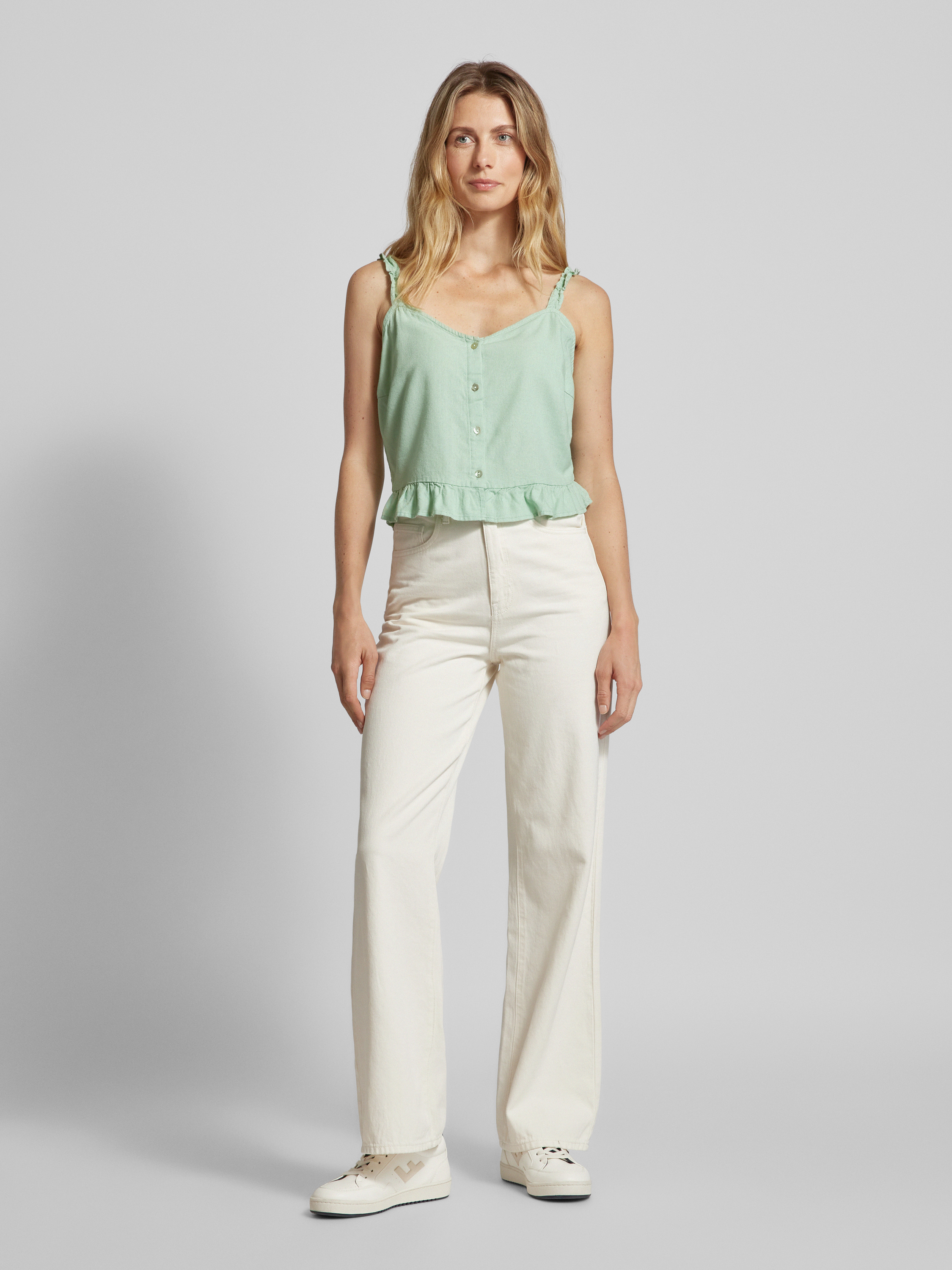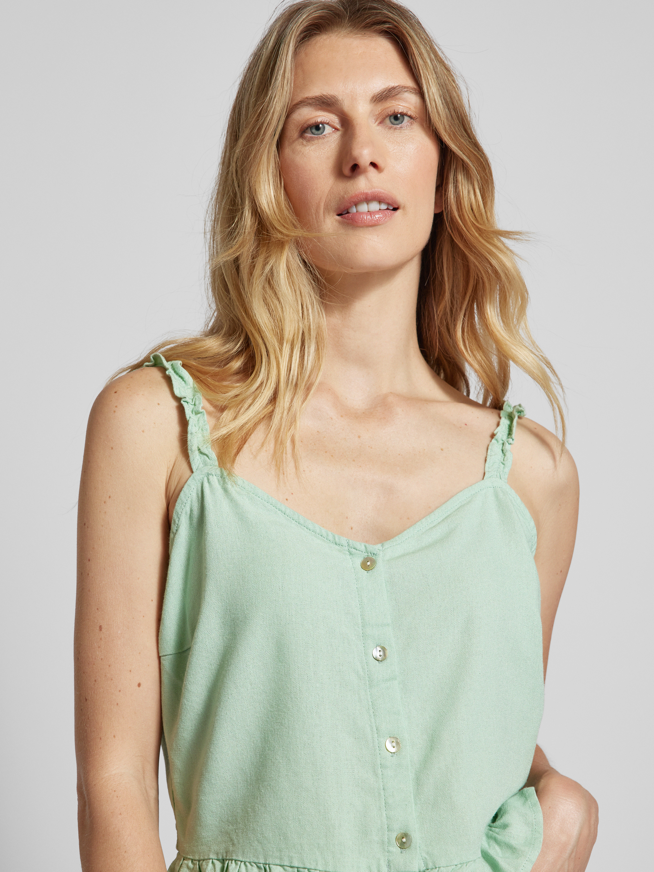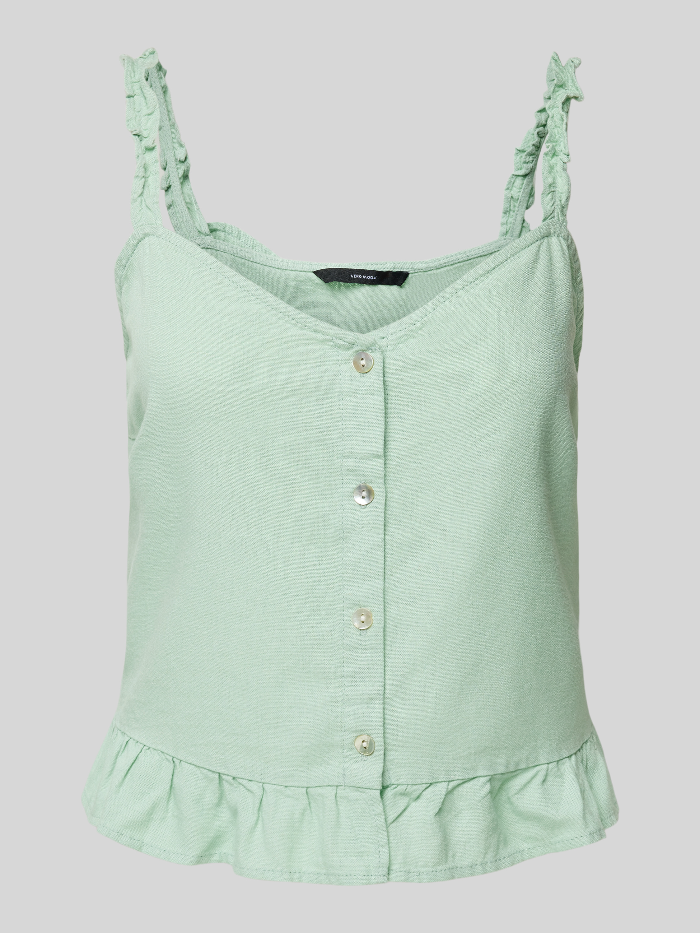 Das Top von VERO MODA, Modell 'MYMILO', vereint einen angenehmen Viskose-Leinen-Mix mit einem lockeren Regular Fit. Das unifarbene Design und die zarten Spaghettiträger verleihen dem Oberteil Leichtigkeit, während Volants für eine spielerische Note sorgen. Ideal für warme Tage geeignet.