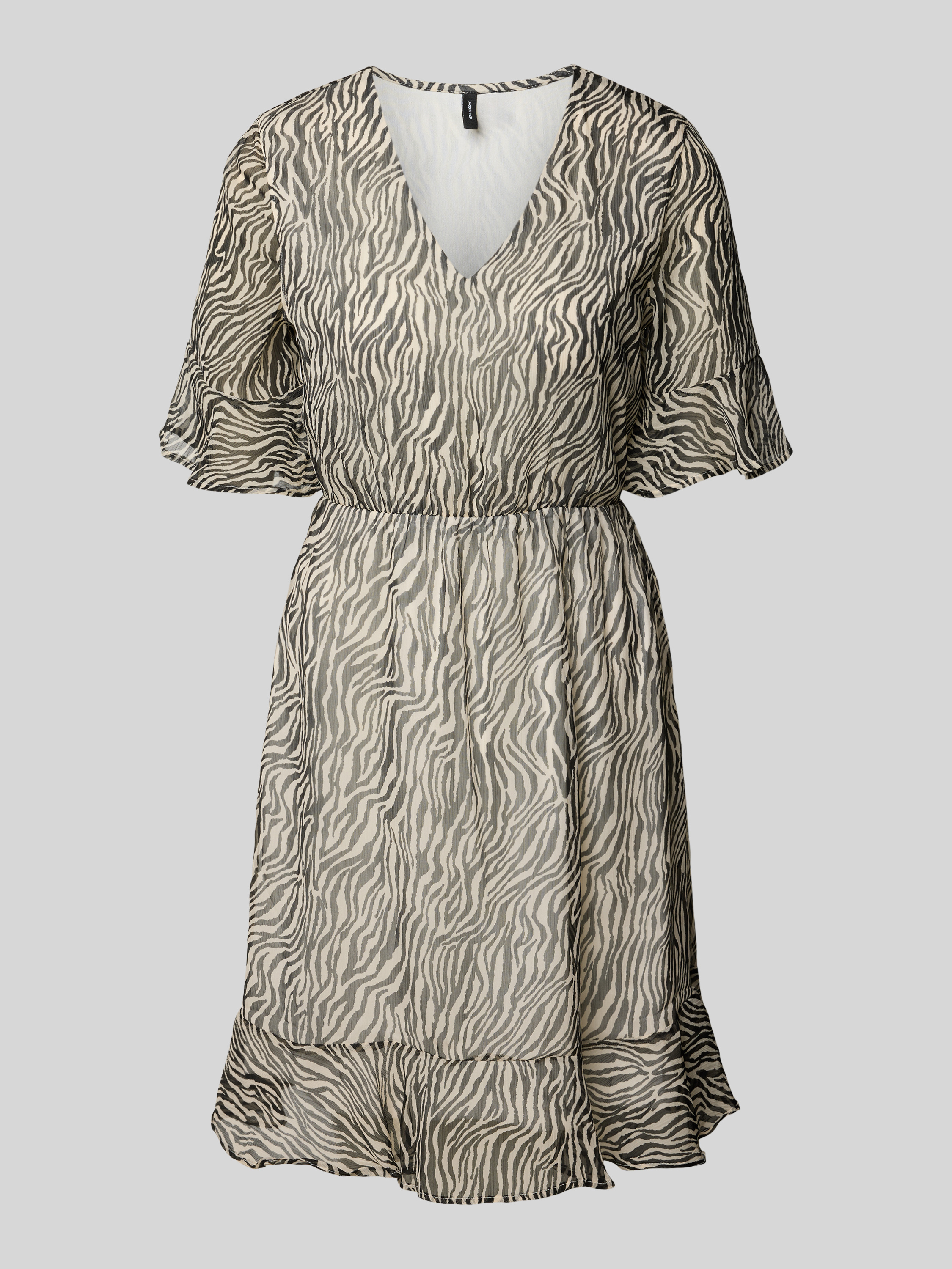 Das taillierte Minikleid mit V-Ausschnitt Modell 'Smilla' von Vero Moda fällt durch sein lebendiges Allover-Muster und fließenden Chiffon angenehm leicht. Volants und zarte Volantärmel verleihen der Silhouette einen verspielten Akzent. Durch die kurze Länge entsteht ein frischer, moderner Gesamteindruck.