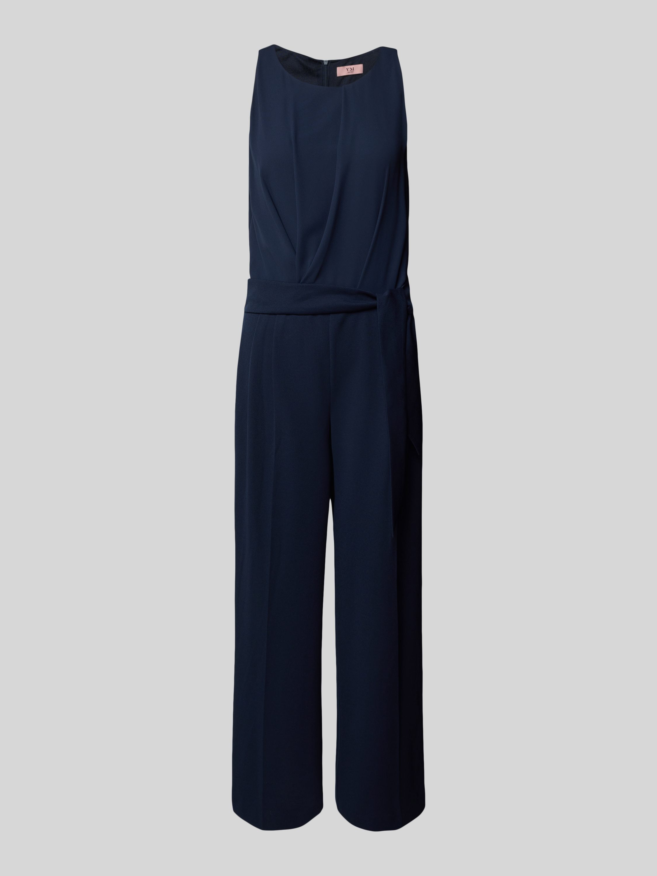 Der Jumpsuit mit Bindegürtel von V.M. zeichnet sich durch seinen eleganten Material-Mix mit Stretch-Anteil aus. Gelegte Falten und ein weites Bein sorgen für eine fließende Silhouette, während der Rundhalsausschnitt dem Look eine schlichte Eleganz verleiht. Ideal für stilvolle Auftritte.