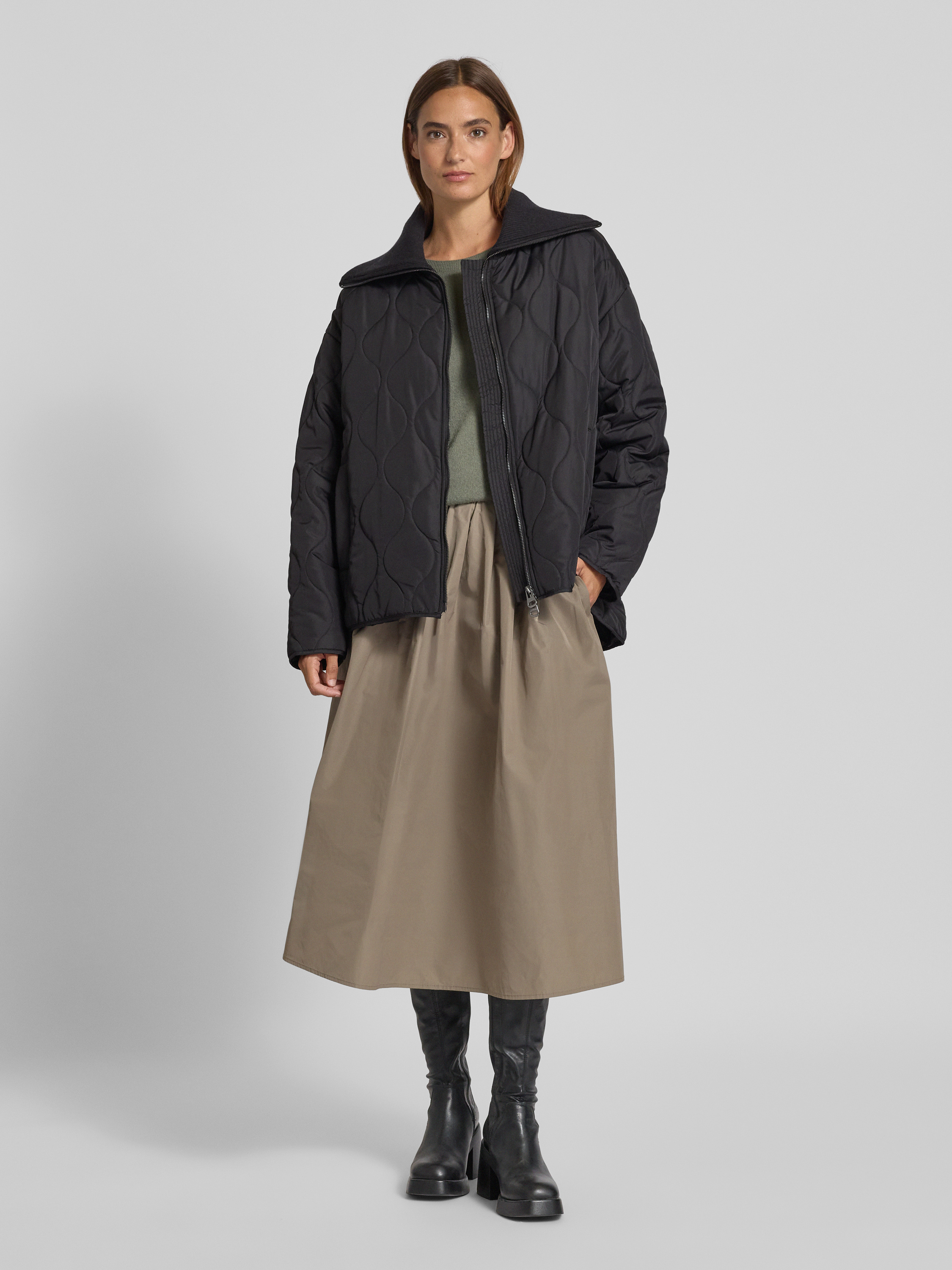 Die Damen Steppjacke von WITHBLACK zeigt sich mit einem geraden Schnitt und einem markanten Strukturmuster, wodurch eine moderne Optik entsteht. Dank des Stehkragens bleibt der Hals angenehm geschützt, während das durchdachte Design vielseitige Kombinationsmöglichkeiten für den Alltag eröffnet. So eignet sich die Jacke für unterschiedliche Anlässe und Jahreszeiten.