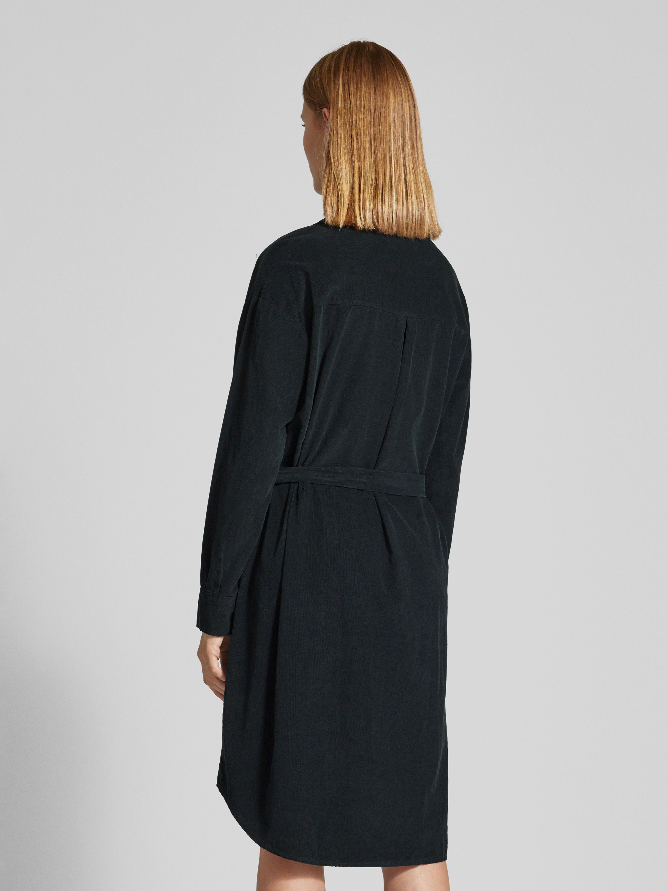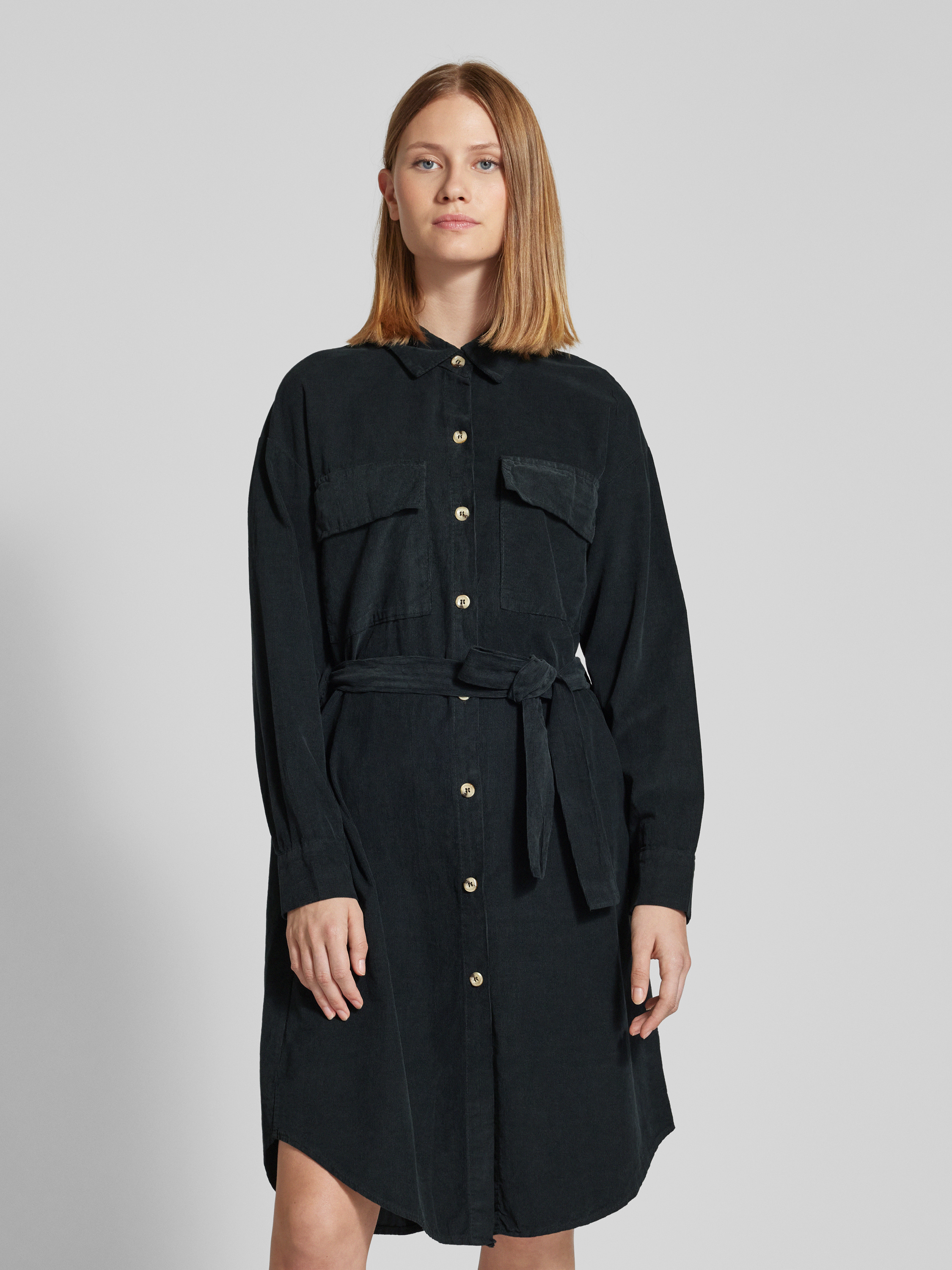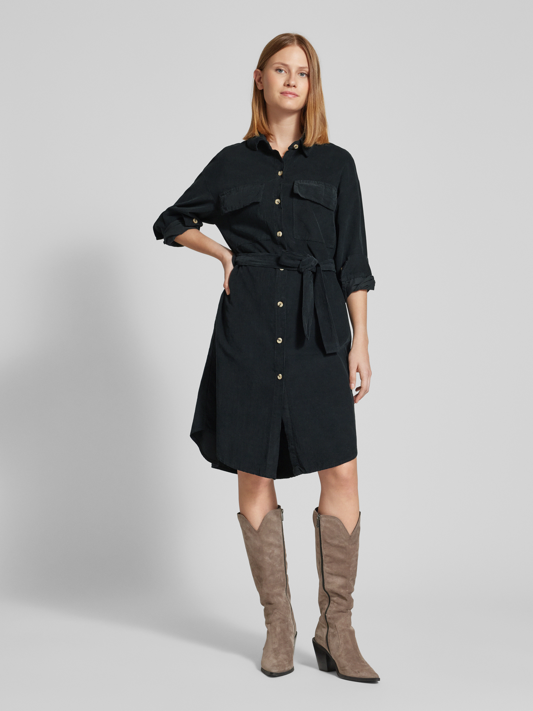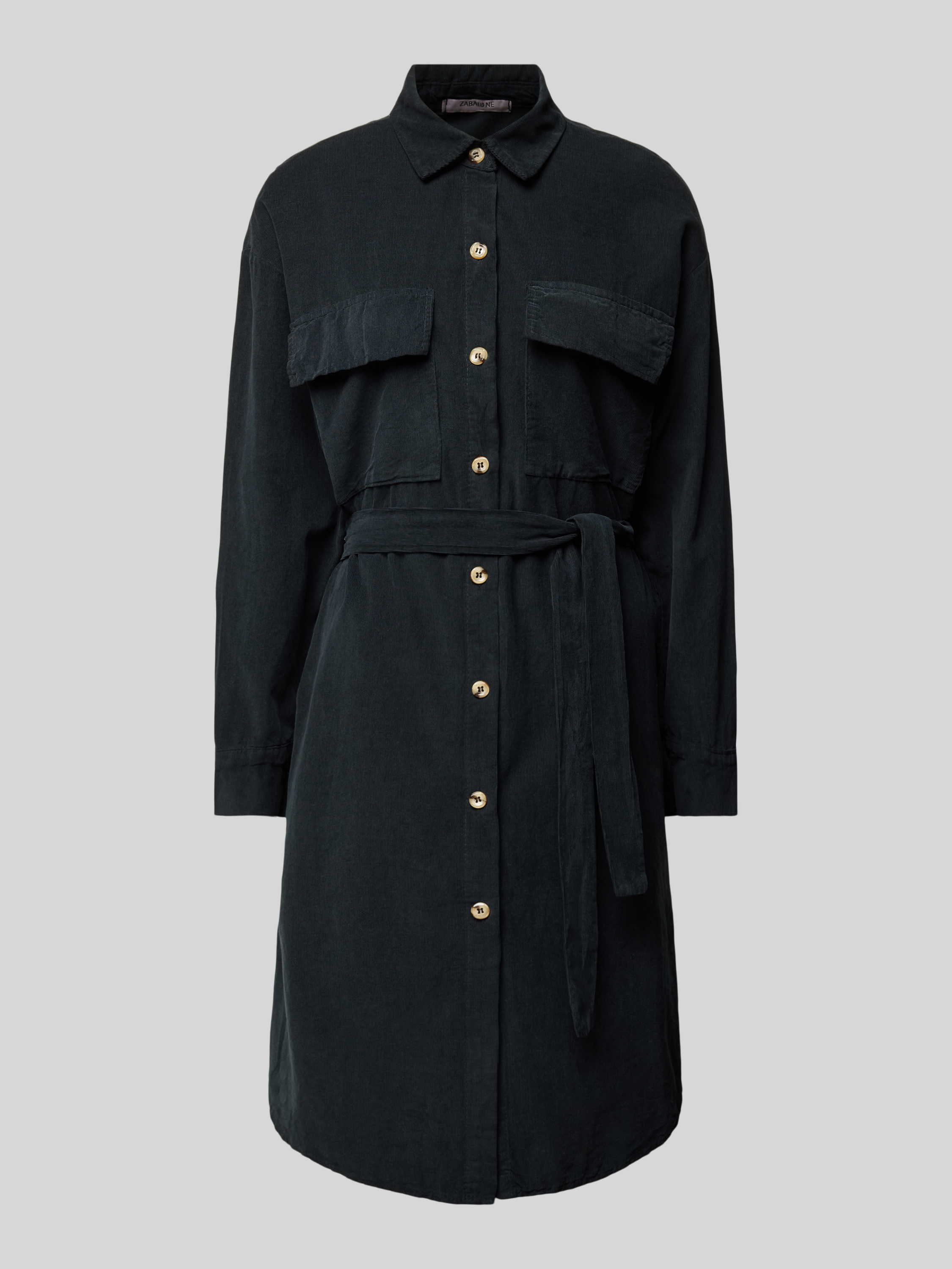Das ZABAIONE Hemdblusenkleid mit Bindegürtel verbindet lässigen Chic mit klassischem Design. Der gerade Schnitt und der Hemdblusenkragen sorgen für eine angenehme Passform, während der Bindegürtel die Silhouette dezent betont. Praktische Brusttaschen bieten zusätzlichen Stauraum und runden das Midikleid ab.