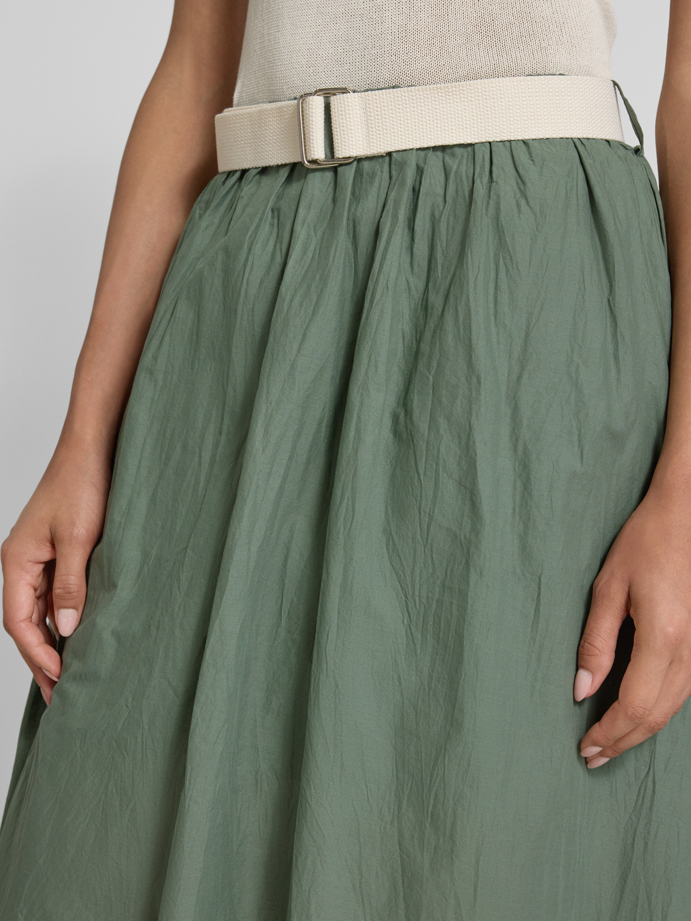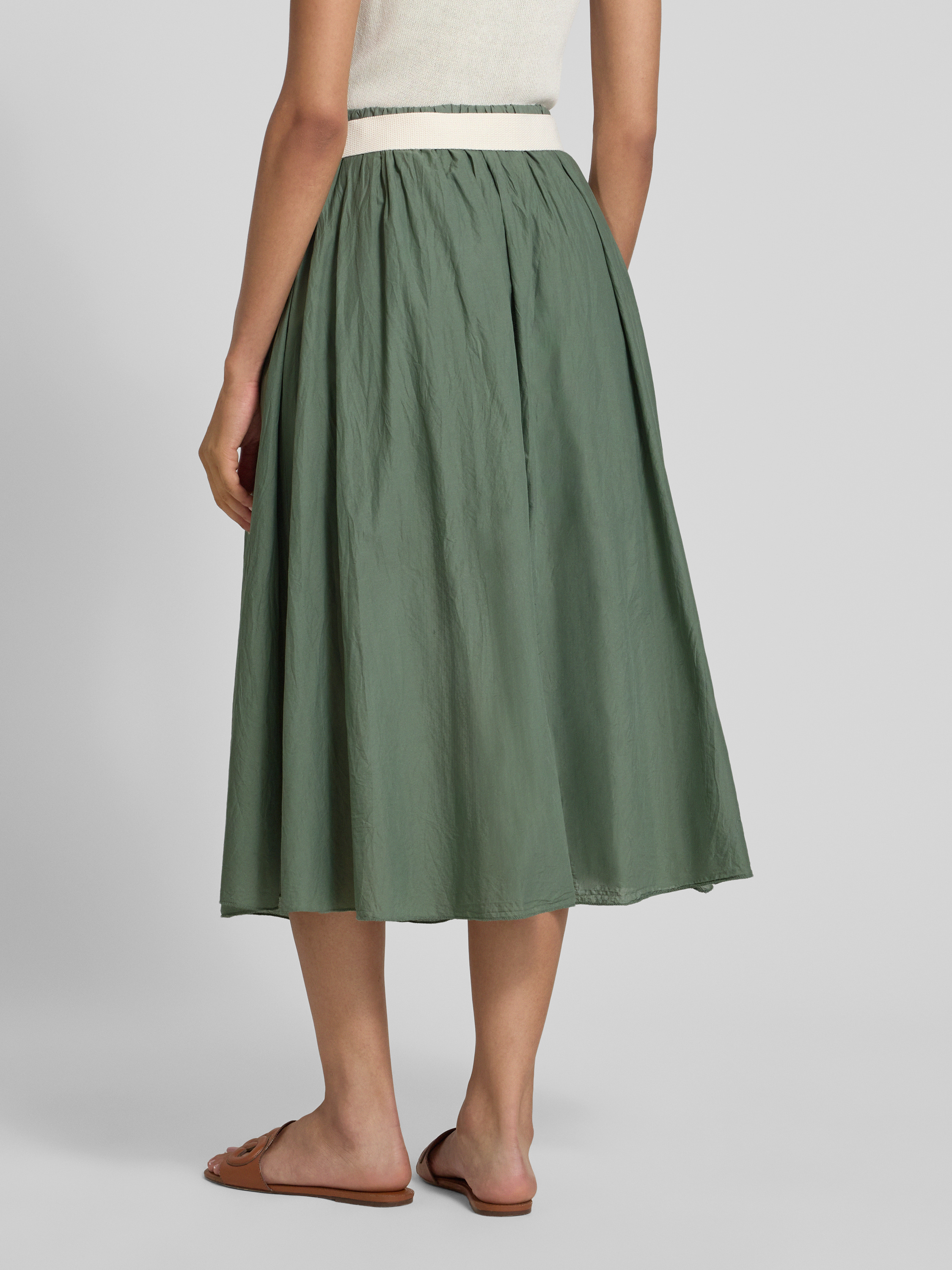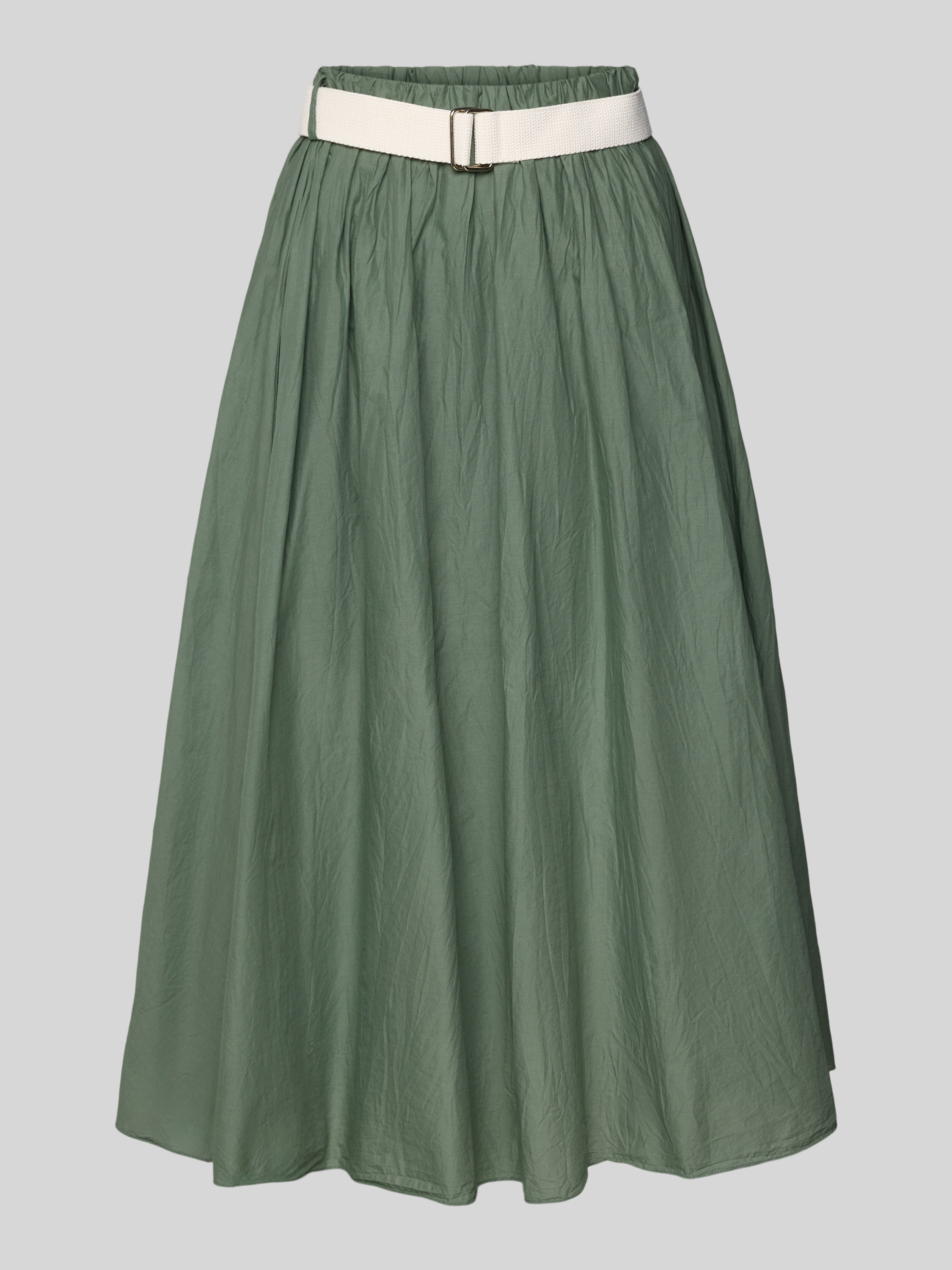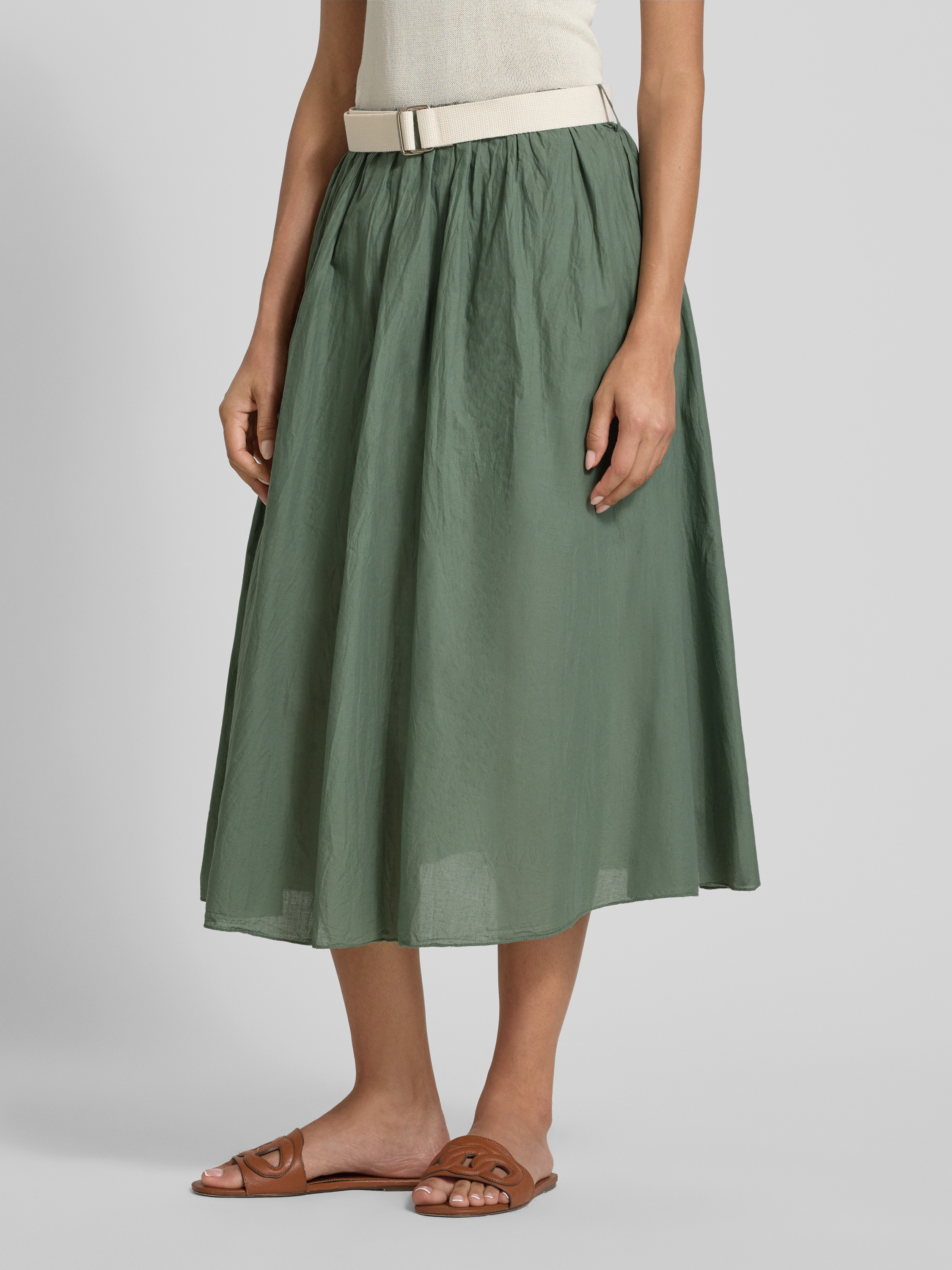 Der Midirock von ZABAIONE, aus reiner Baumwolle gefertigt, bietet mit seinem lockeren Schnitt und den raffinierten Raffungen einen angenehmen Tragekomfort. Ein blickdichter Unterrock und ein Stoffgürtel sorgen für zusätzliche Funktionalität und Stil. Ideal für entspannte oder formelle Anlässe.