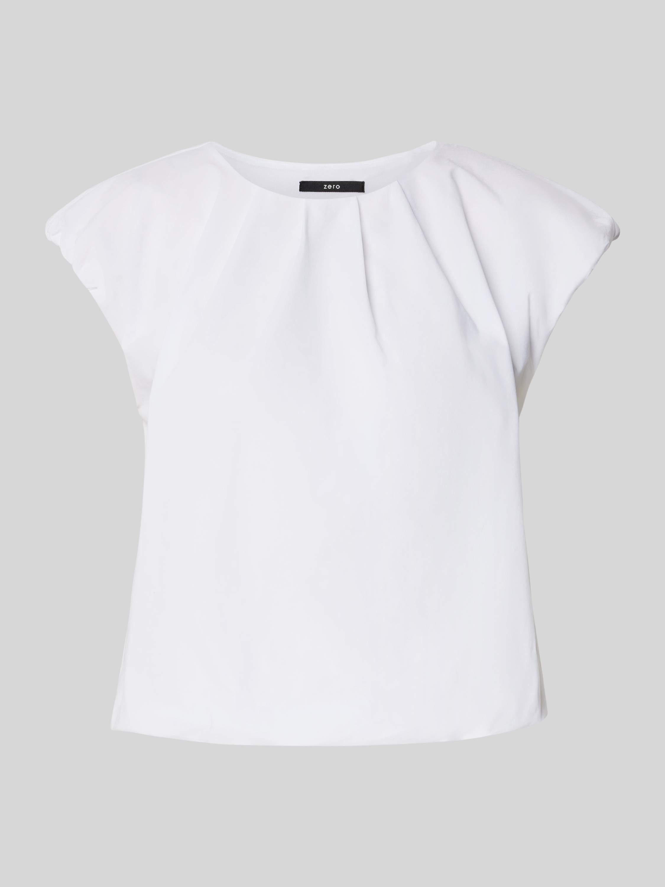 Die Regular Fit Kurzarmbluse von Zero kombiniert stilvoll gelegte Falten und Kappärmel für eine raffinierte Silhouette. Der Rundhalsausschnitt sorgt für eine klassische Note, während die angenehme Passform vielseitig einsetzbar ist. Ideal, um mühelos einen eleganten Look zu kreieren.