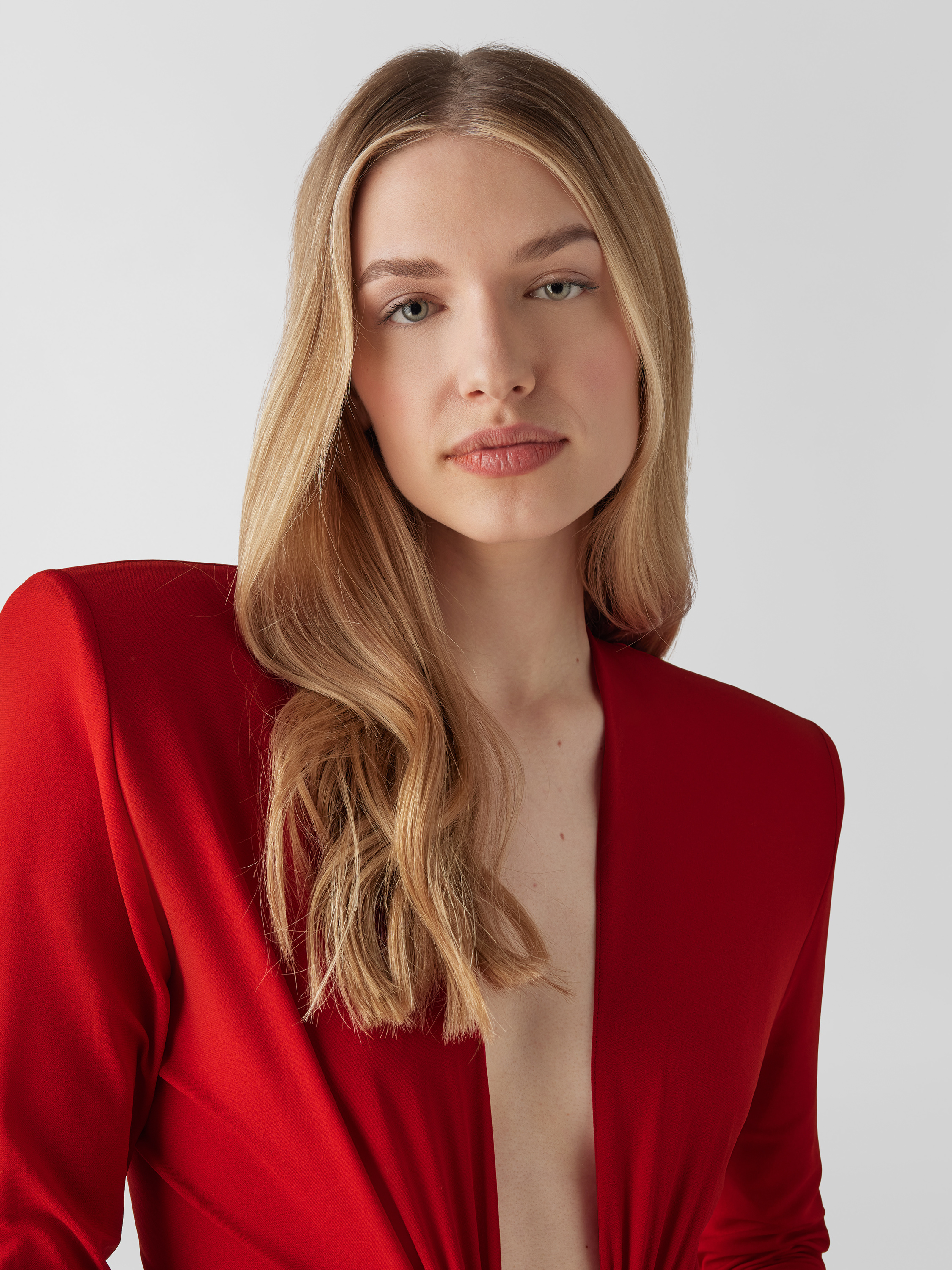Das elegante Abendkleid mit Schulterpolstern von Alexandre Vauthier schmiegt sich durch den Viskose-Elasthan-Mix angenehm an die Silhouette und betont eine körpernahe Linie. Ein funkelnder Zierbesatz mit Strasssteinen sorgt für dezente Akzente. Das langärmelige Design ergänzt festliche Anlässe stilvoll.