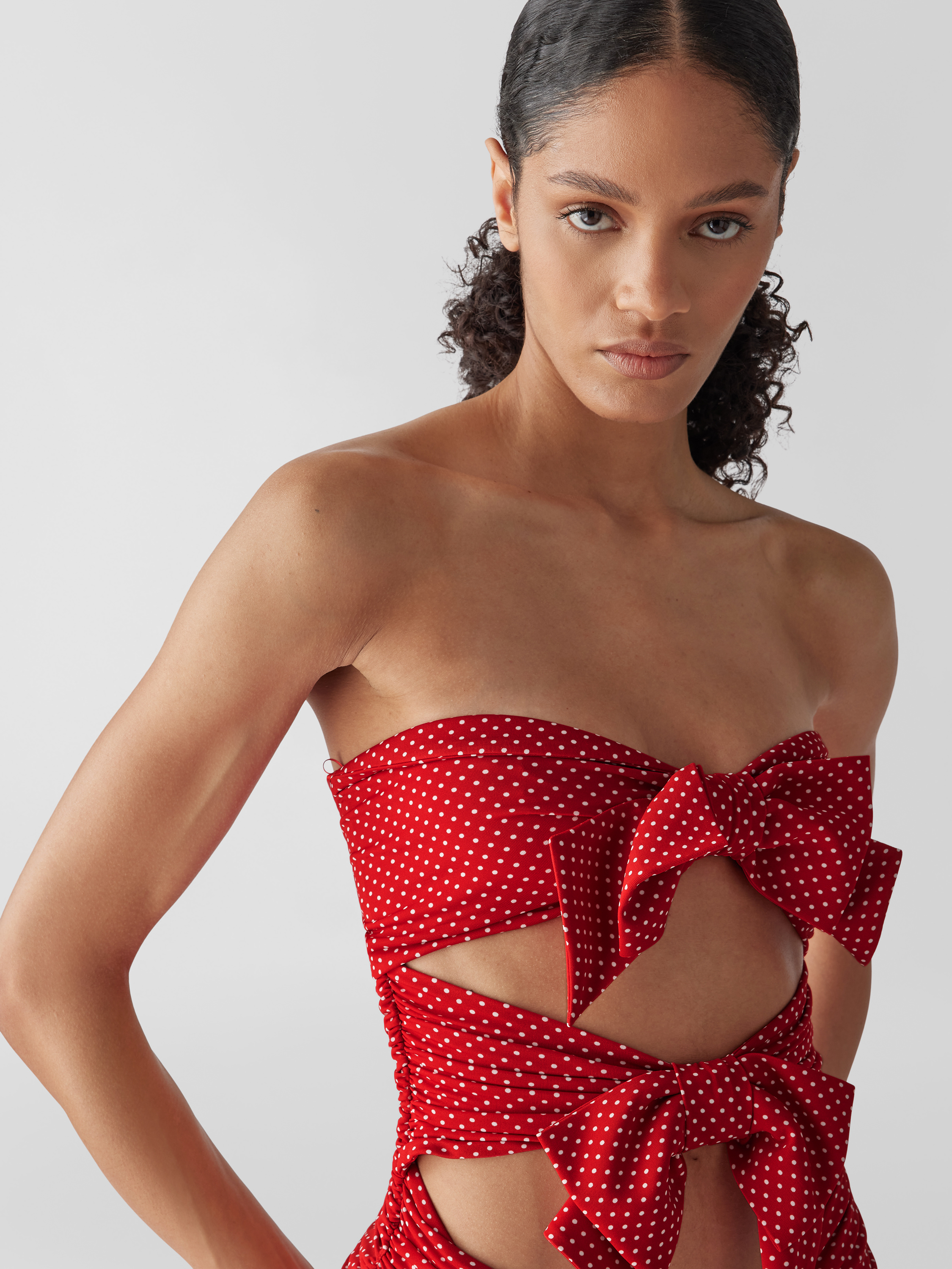 Das Cocktailkleid mit Cut Outs von Alexandre Vauthier zeigt sich mit figurnaher Silhouette und einem eleganten Herz-Ausschnitt, wodurch Bewegungsfreiheit und ein angenehmes Tragegefühl entstehen. Das trägerlose Design und das grafische Allover-Muster setzen modische Akzente. Der Viskose-Elasthan-Mix sorgt für eine geschmeidige Passform.