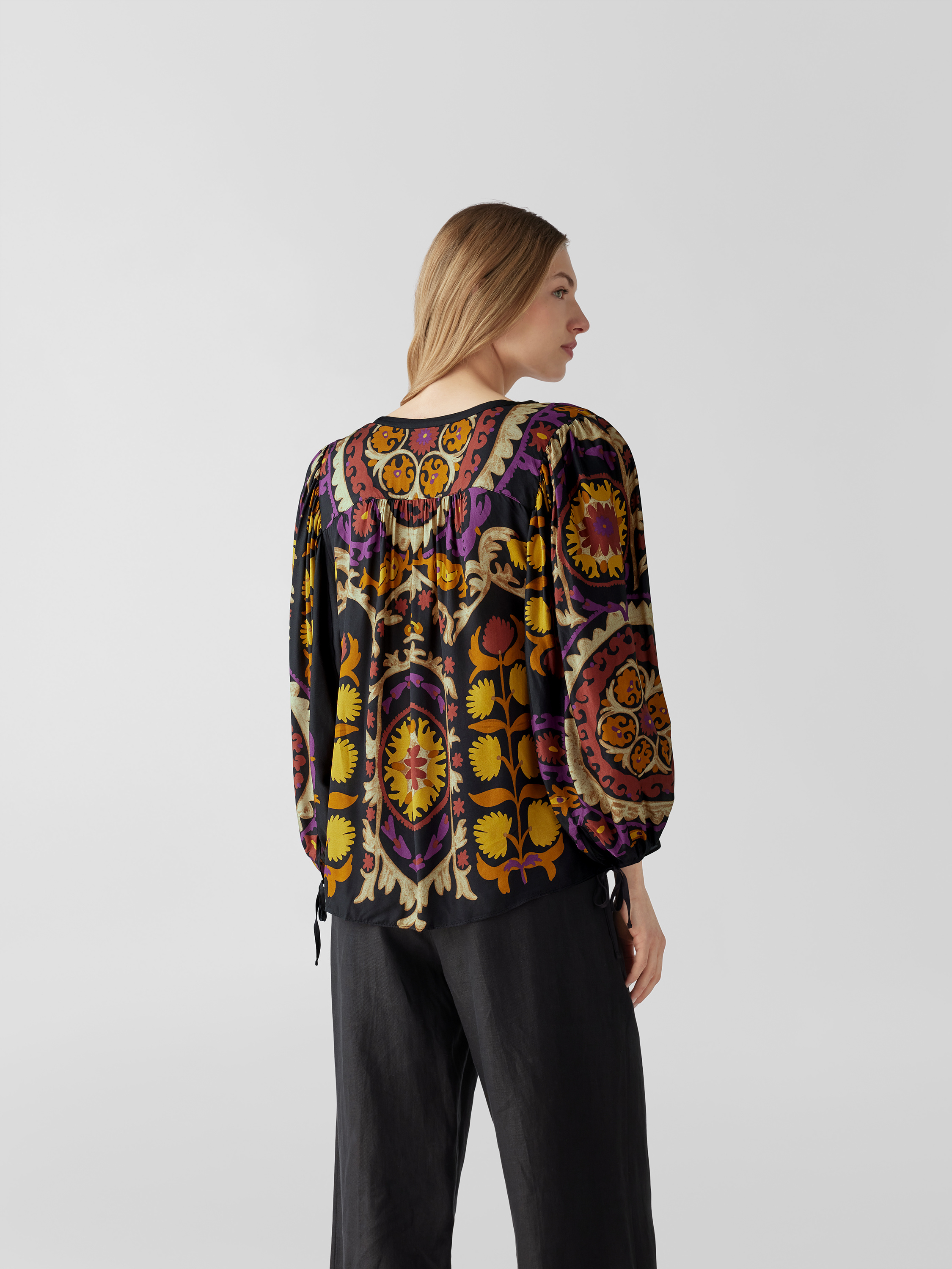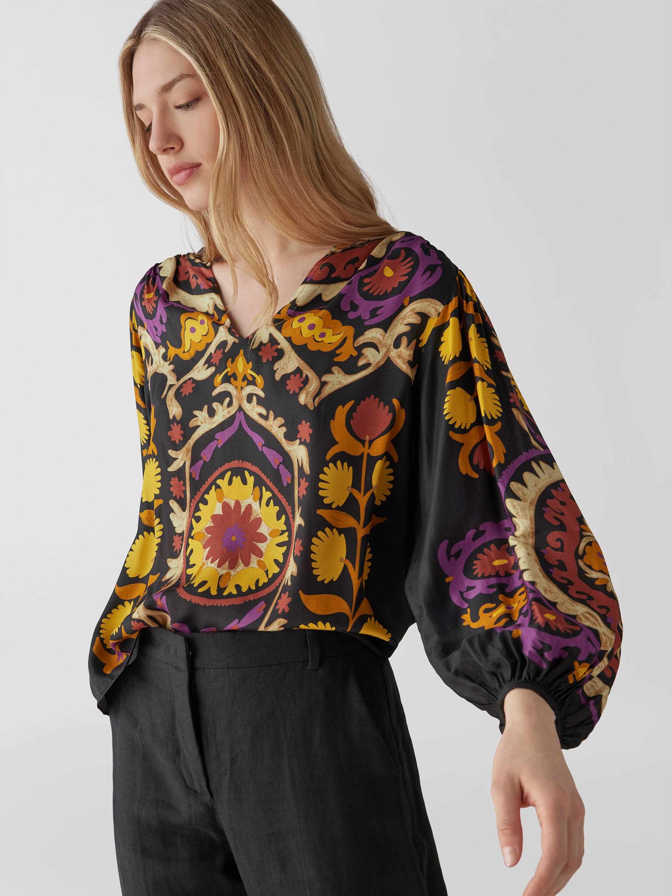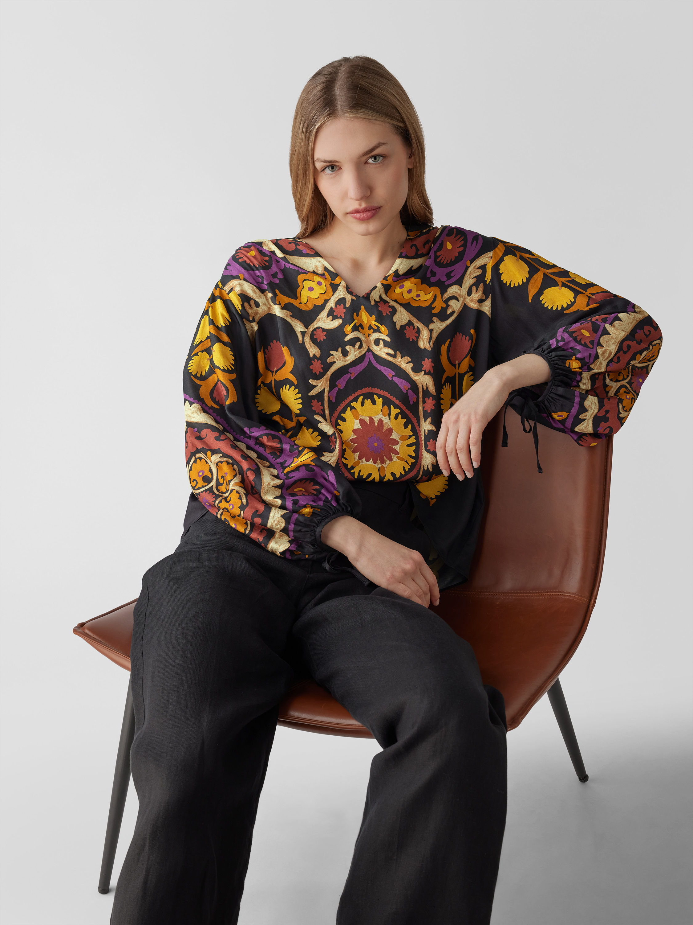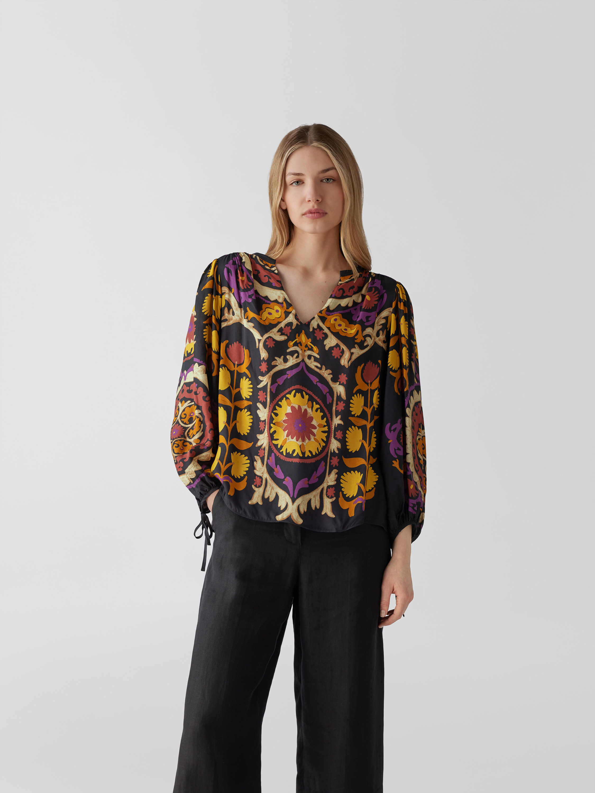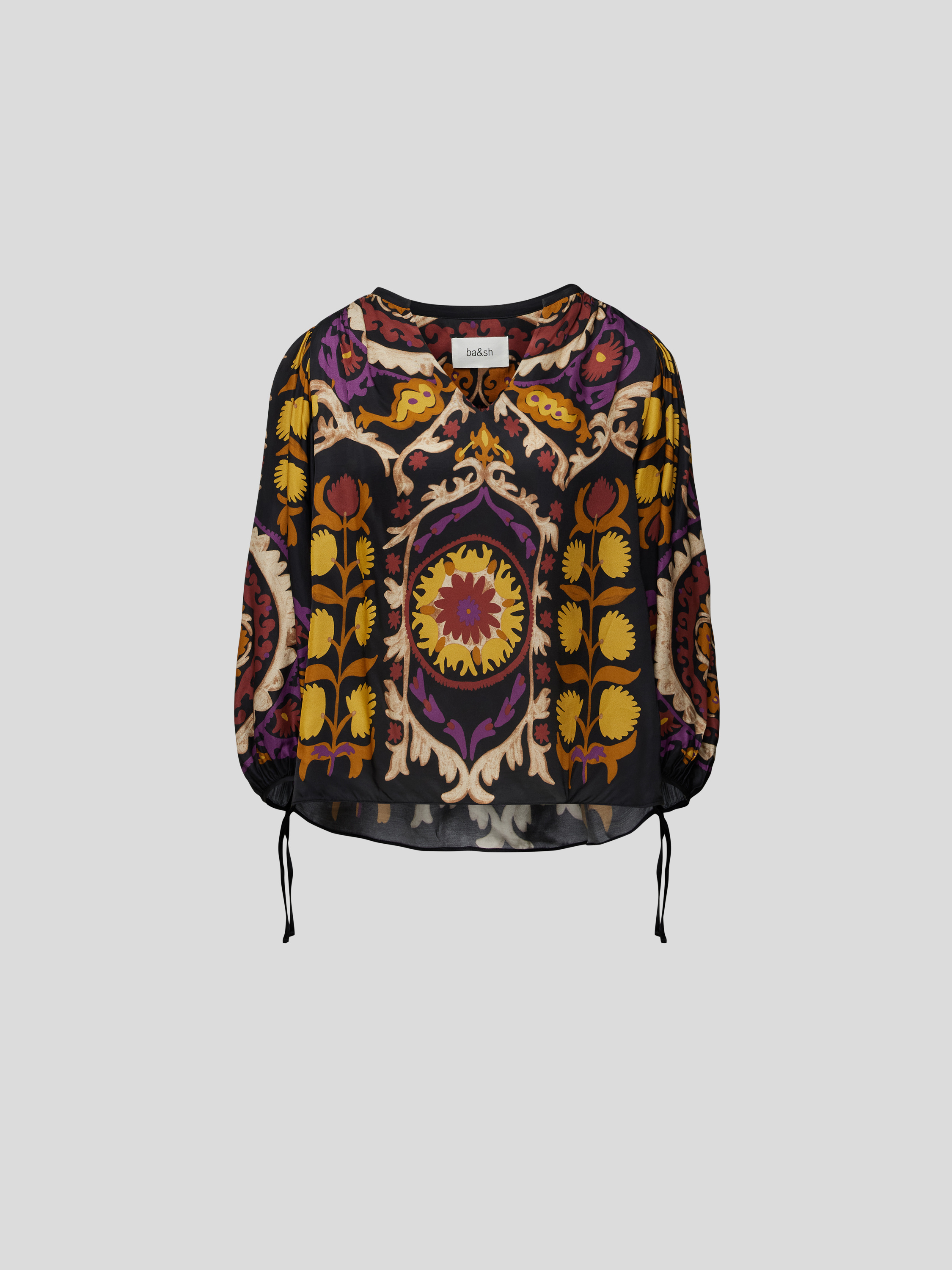 Das Damen Blusenshirt von ba&sh fällt durch seine lockere Passform angenehm leicht und sorgt gemeinsam mit dem Tunikakragen für ein entspanntes Tragegefühl. Reine Viskose unterstützt den fließenden Sitz, während das grafische Allover-Muster dem langärmeligen Design einen frischen Akzent verleiht.
