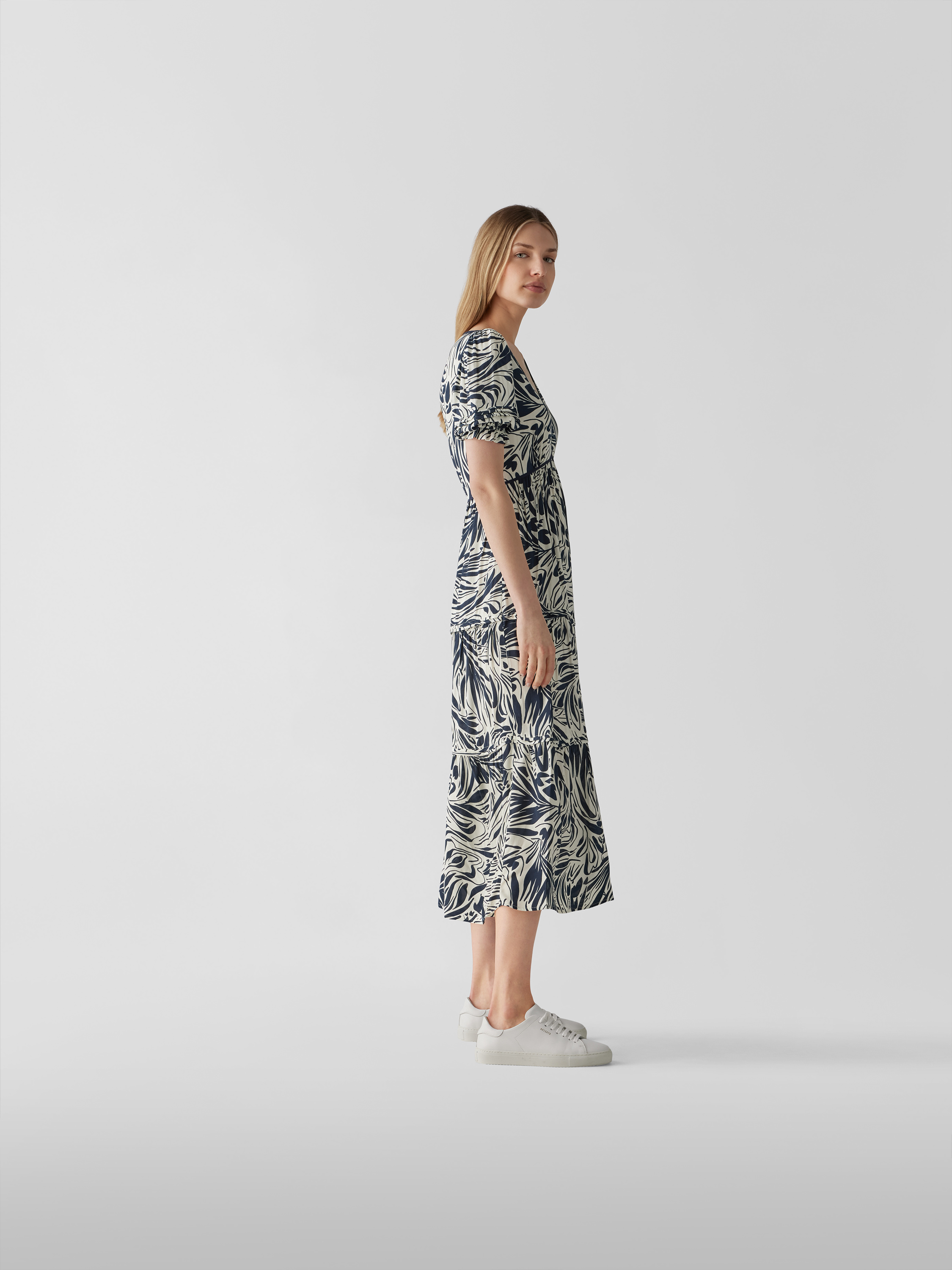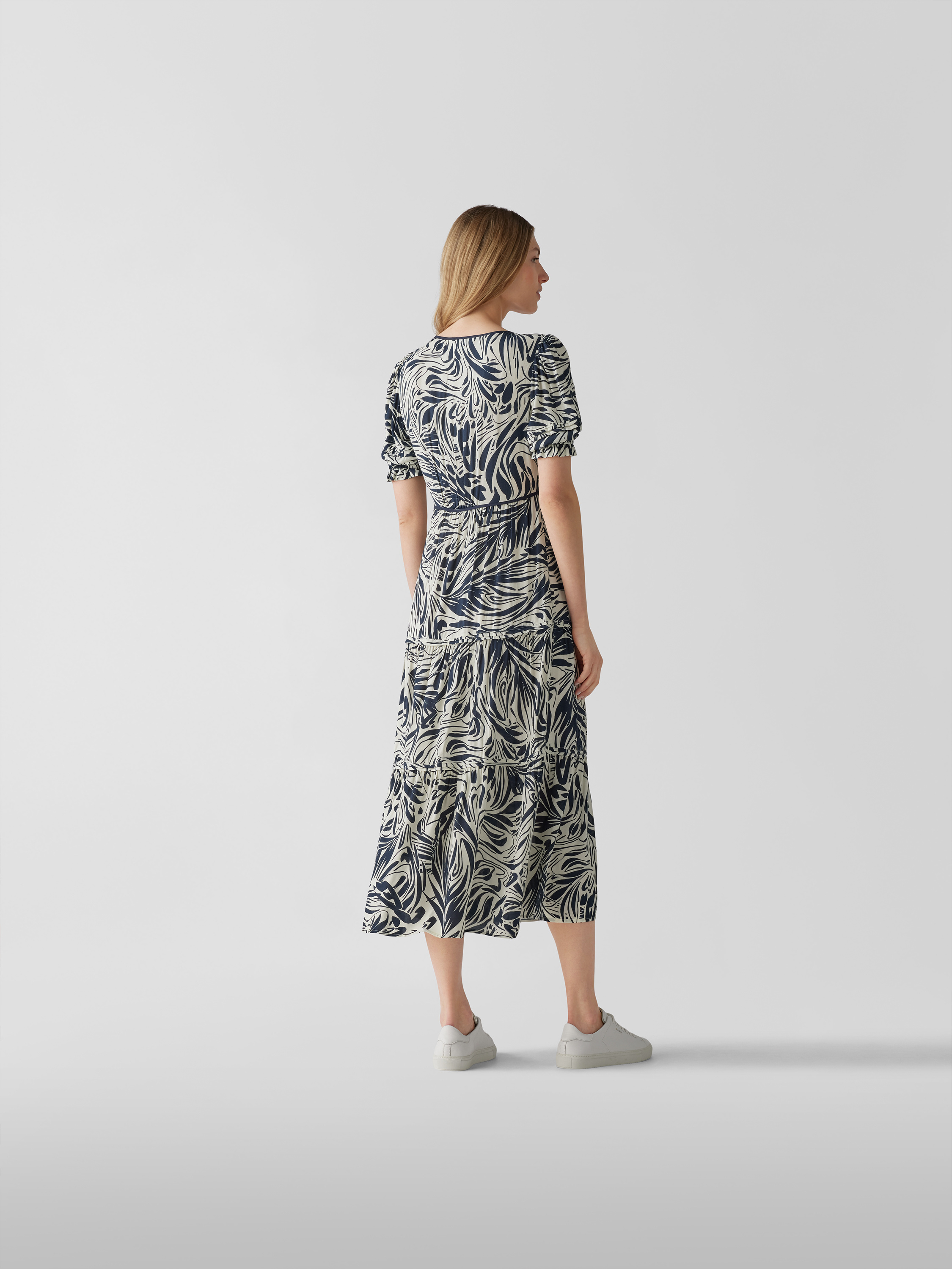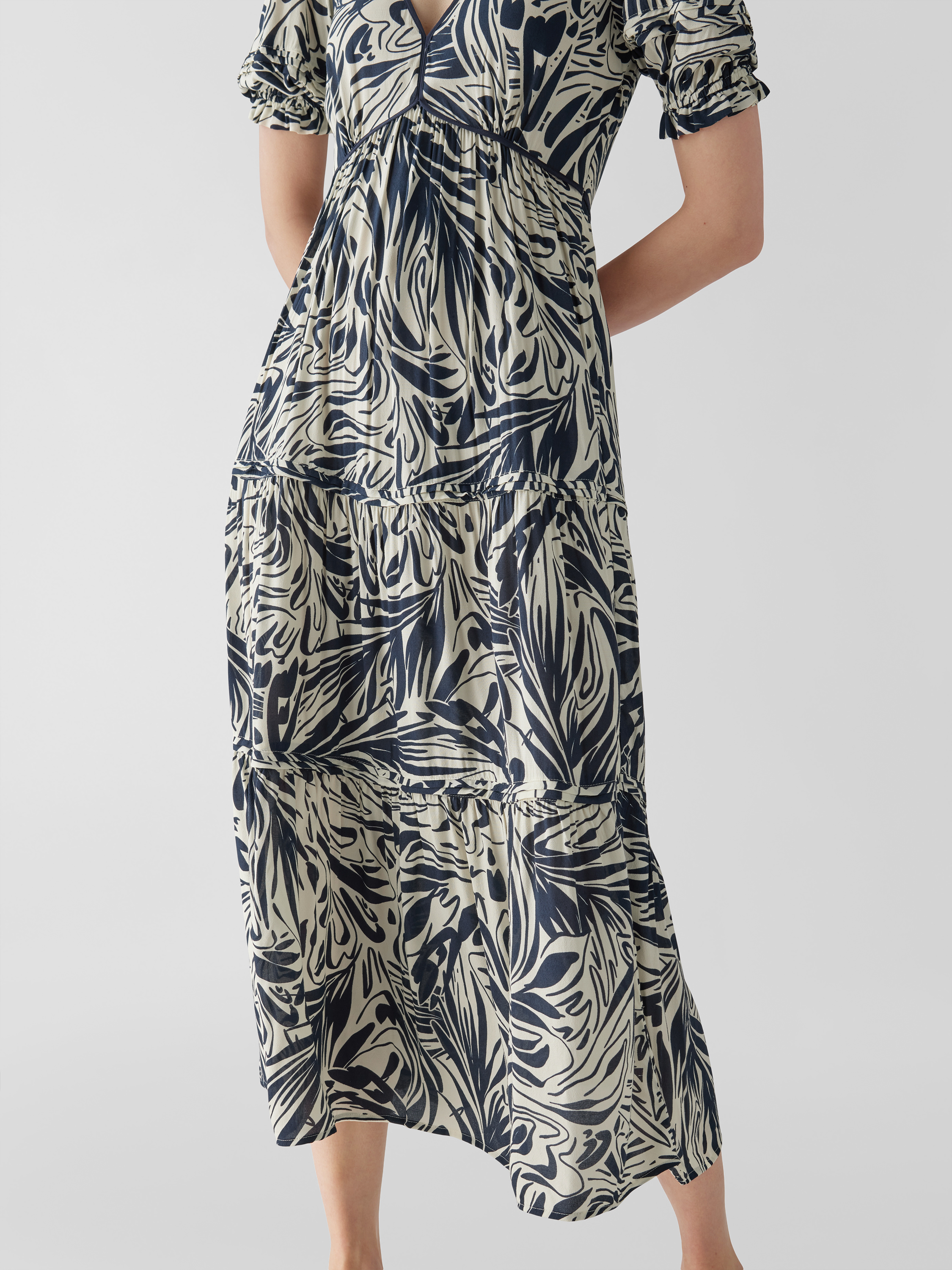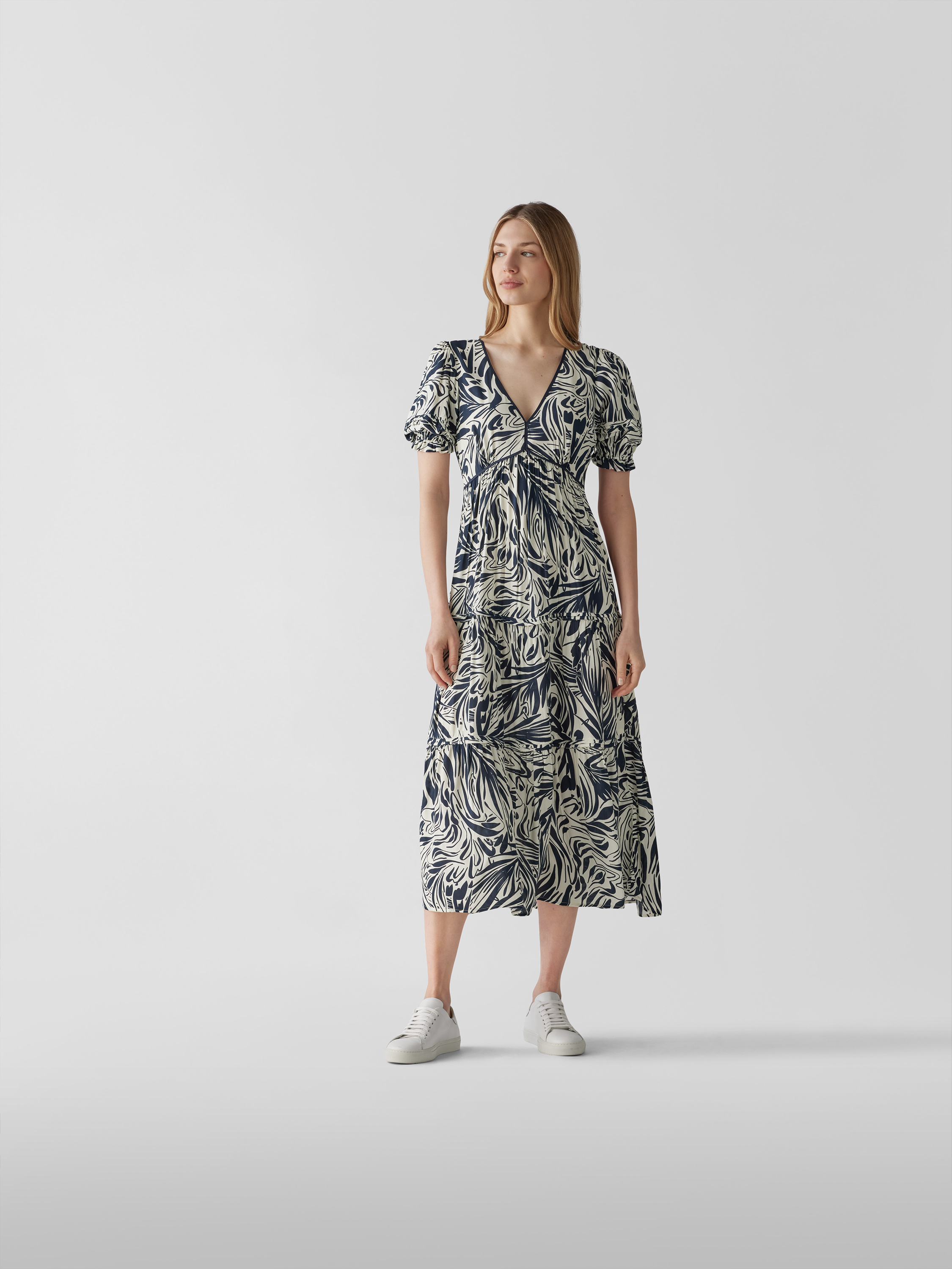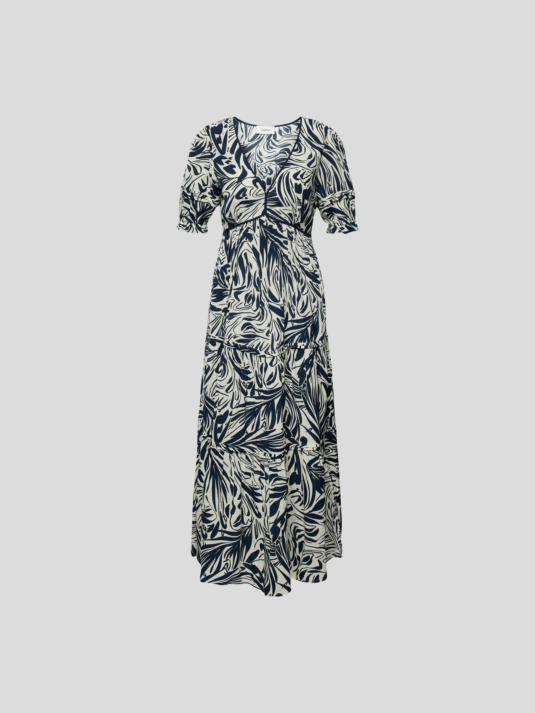 Das Damen Maxikleid von ba&sh zeichnet sich durch eine taillierte Passform aus, wodurch die Silhouette angenehm betont wird. Durch das grafische Allover-Muster und den abgerundeten V-Ausschnitt entsteht ein moderner Look, der vielseitig kombiniert werden kann. Die reine Viskose sorgt dabei für ein leichtes Tragegefühl.