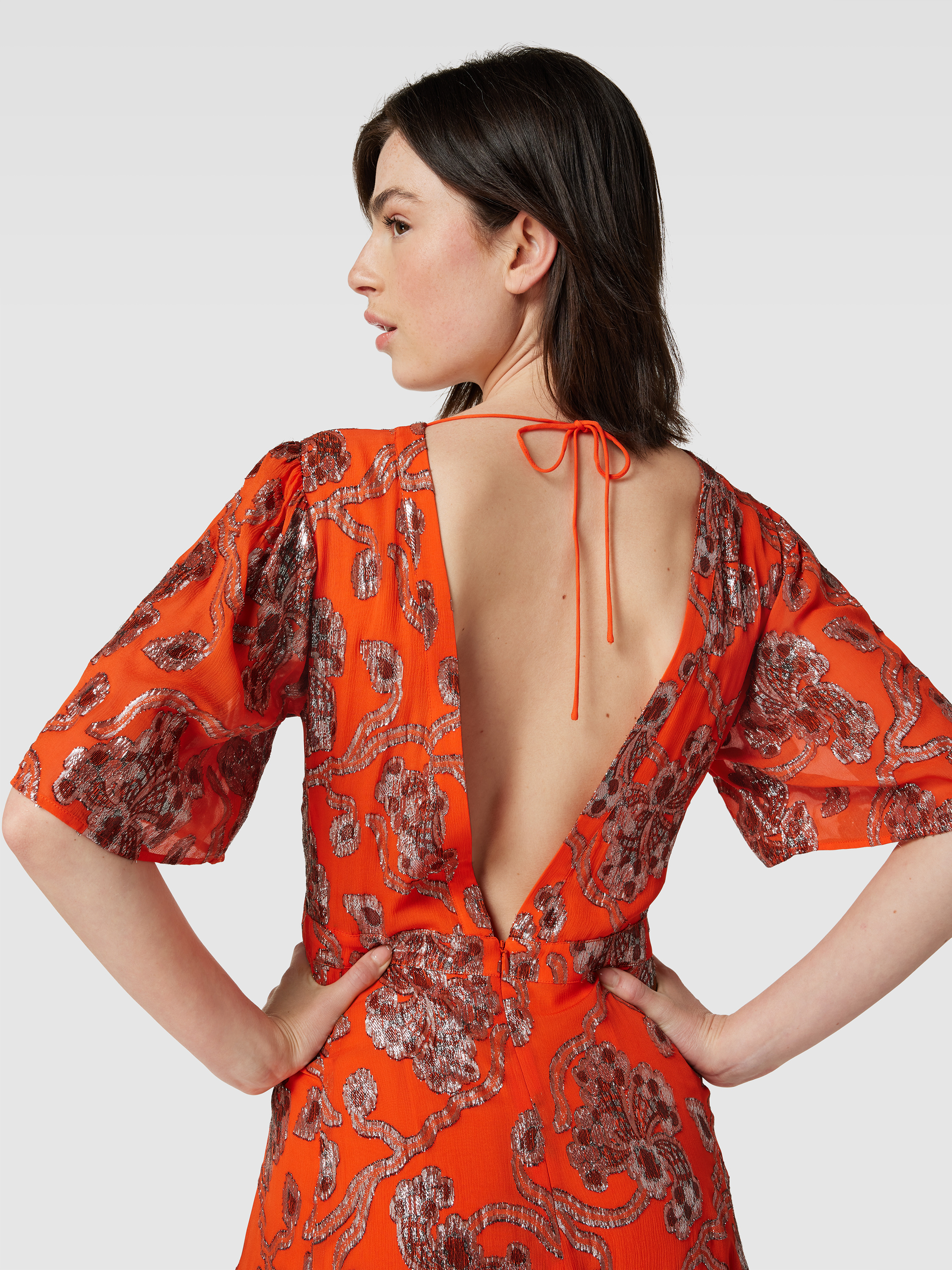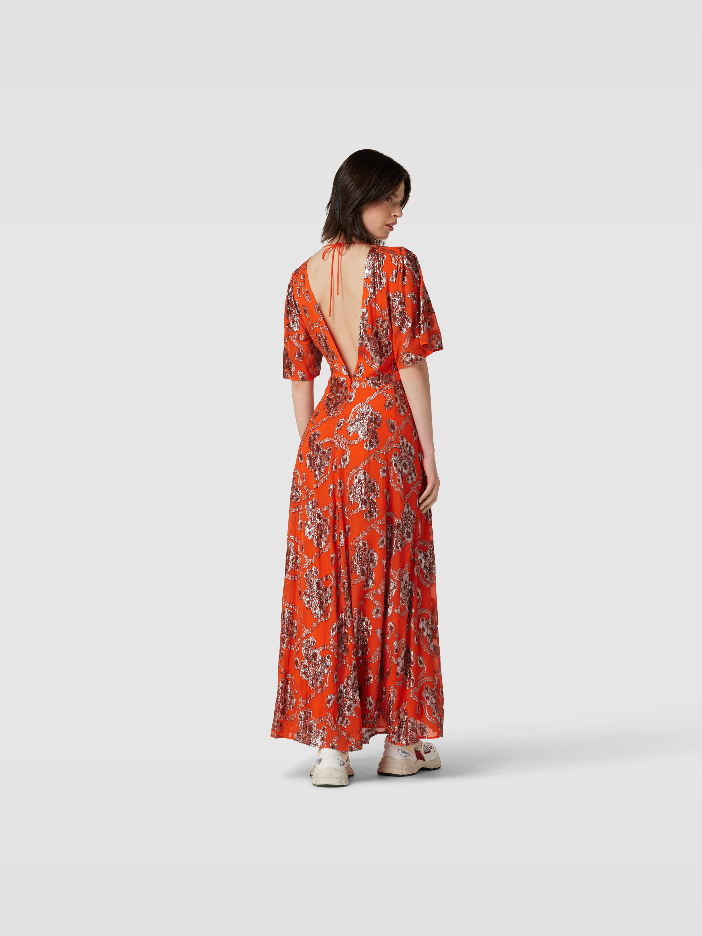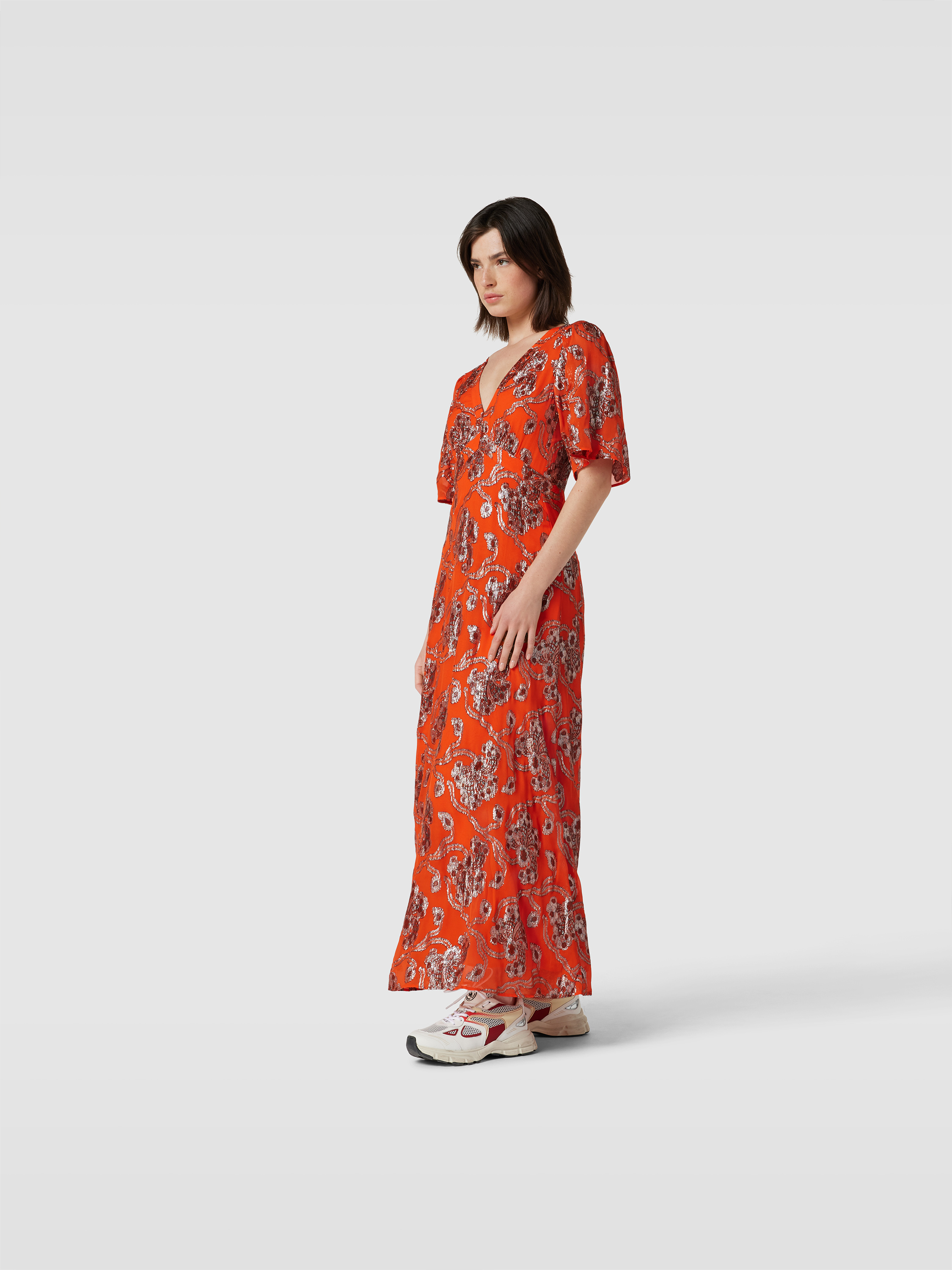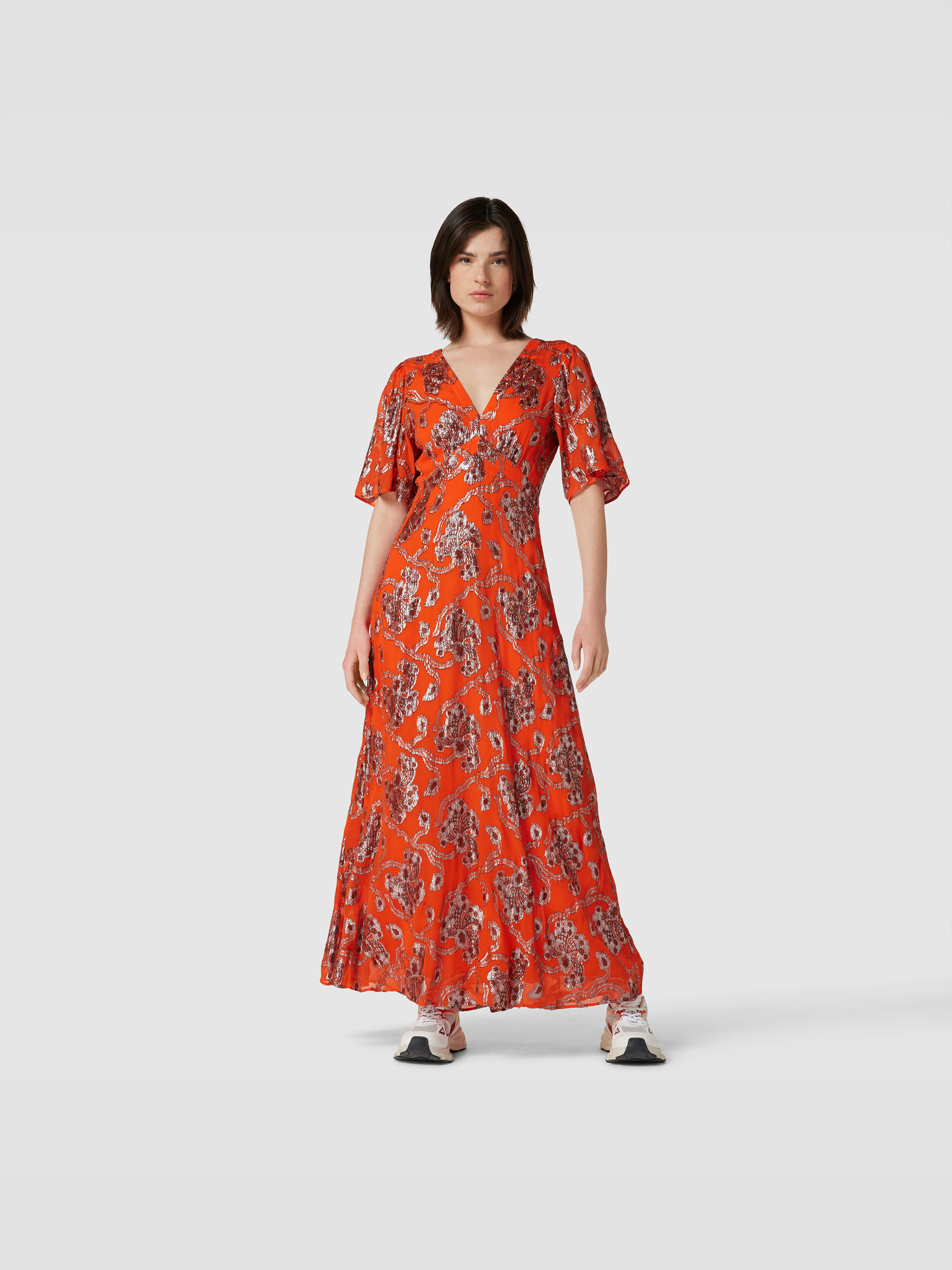 Das Maxikleid mit Allover-Muster von ba&sh fällt durch seinen taillierten Schnitt und das kurzärmelige Design angenehm leicht. Der Viskose-Mix sorgt für ein geschmeidiges Tragegefühl, während das Muster einen lebendigen Akzent im Alltag setzt. So eignet es sich für entspannte wie festliche Anlässe.