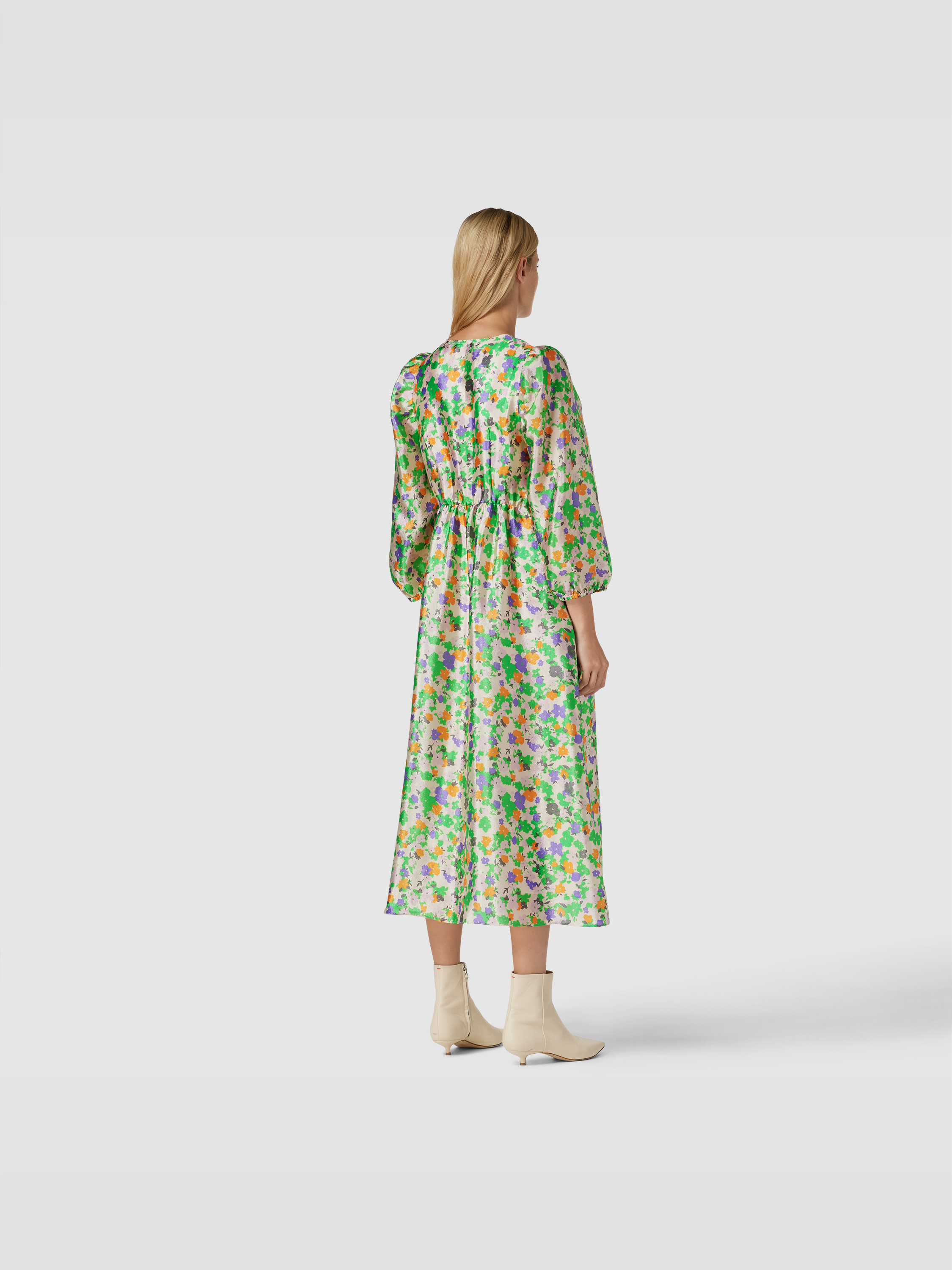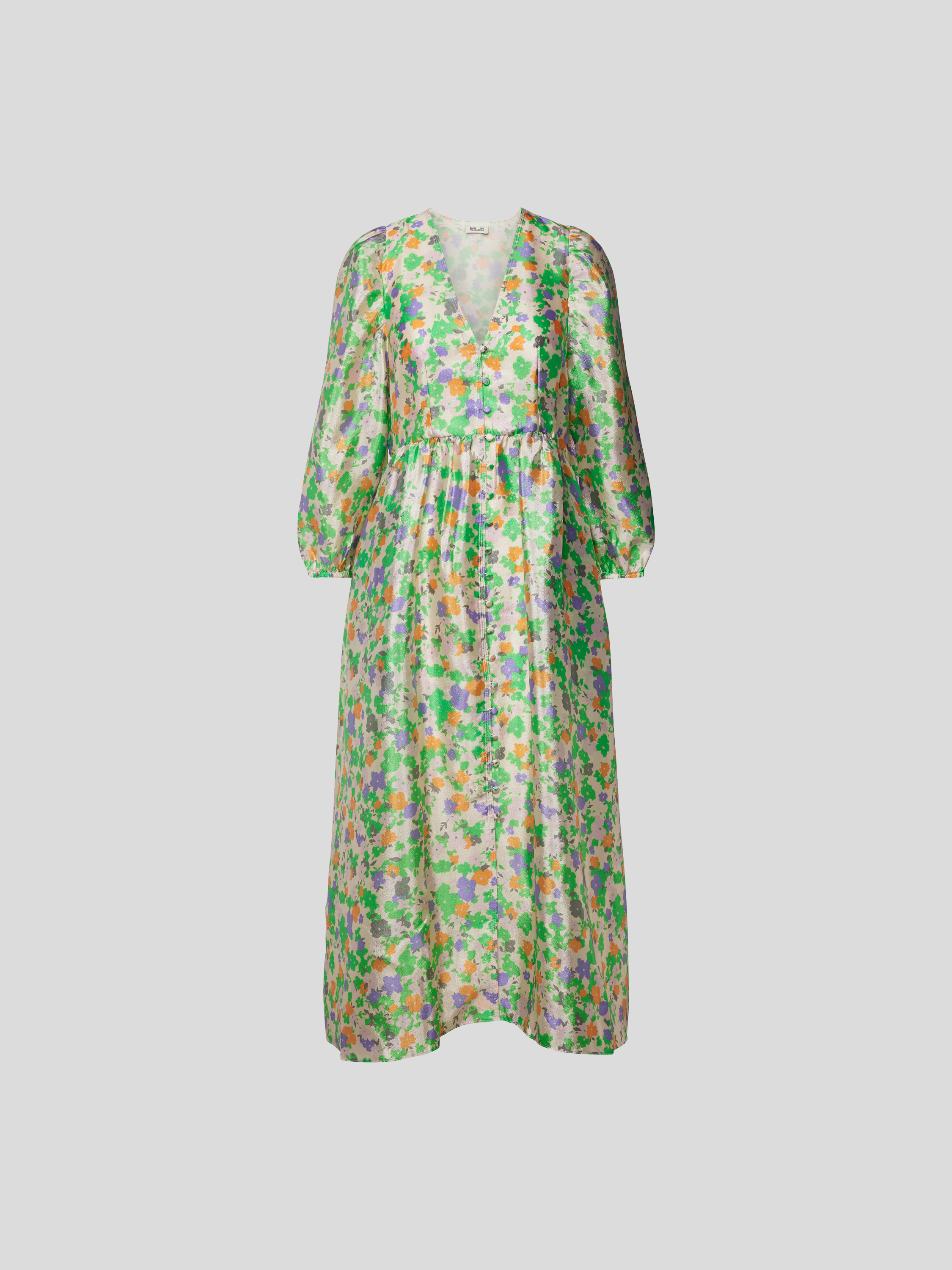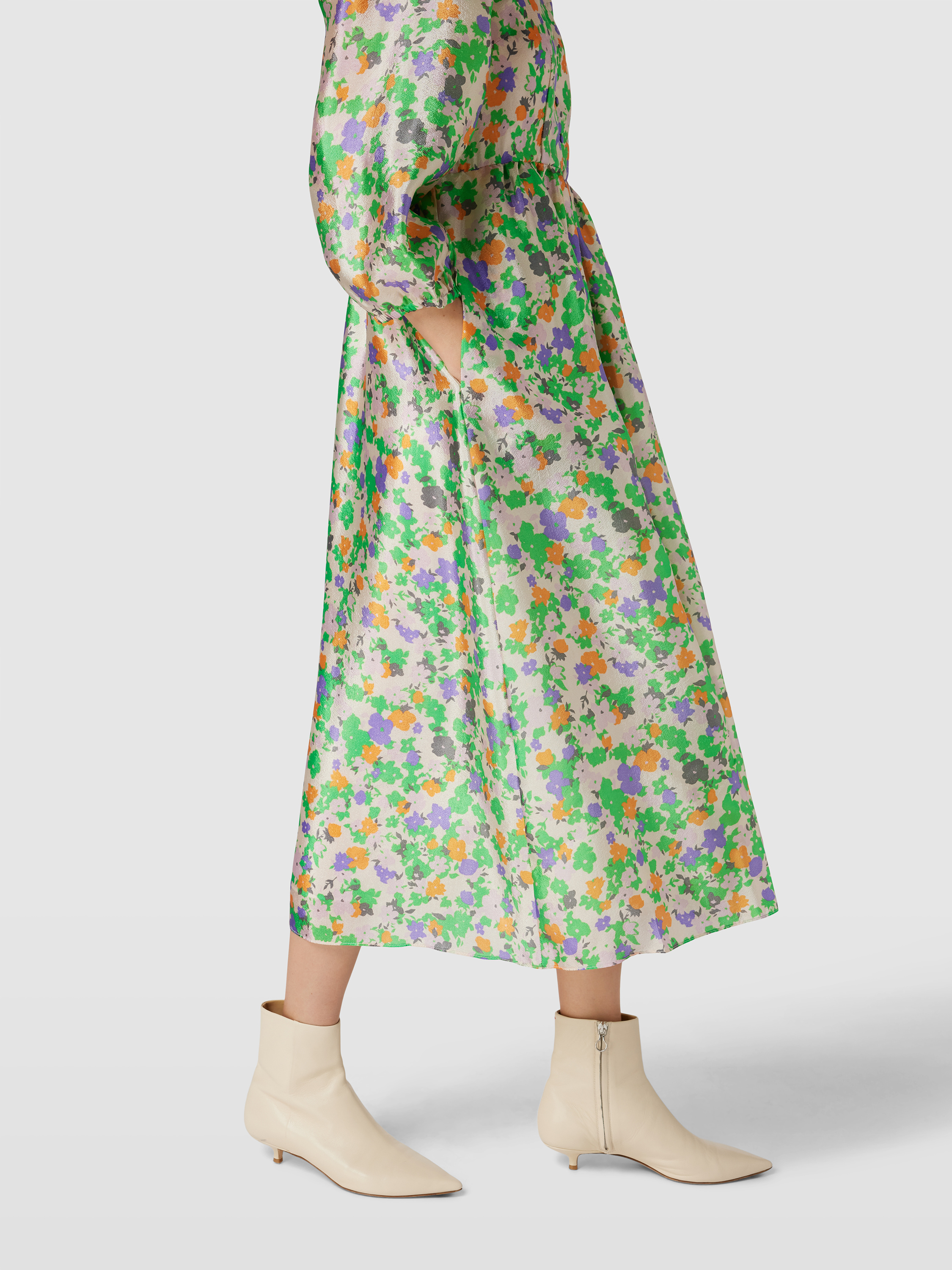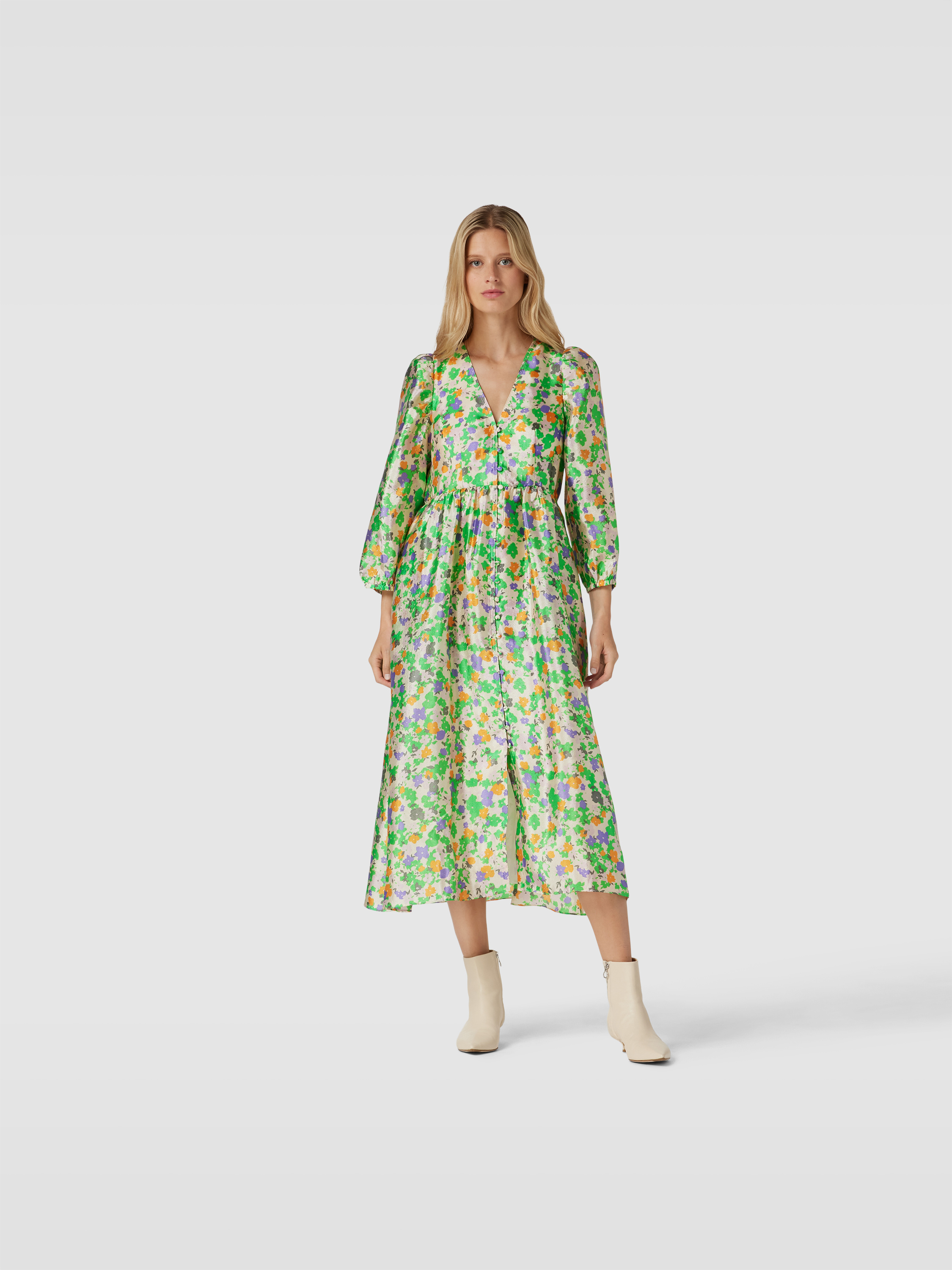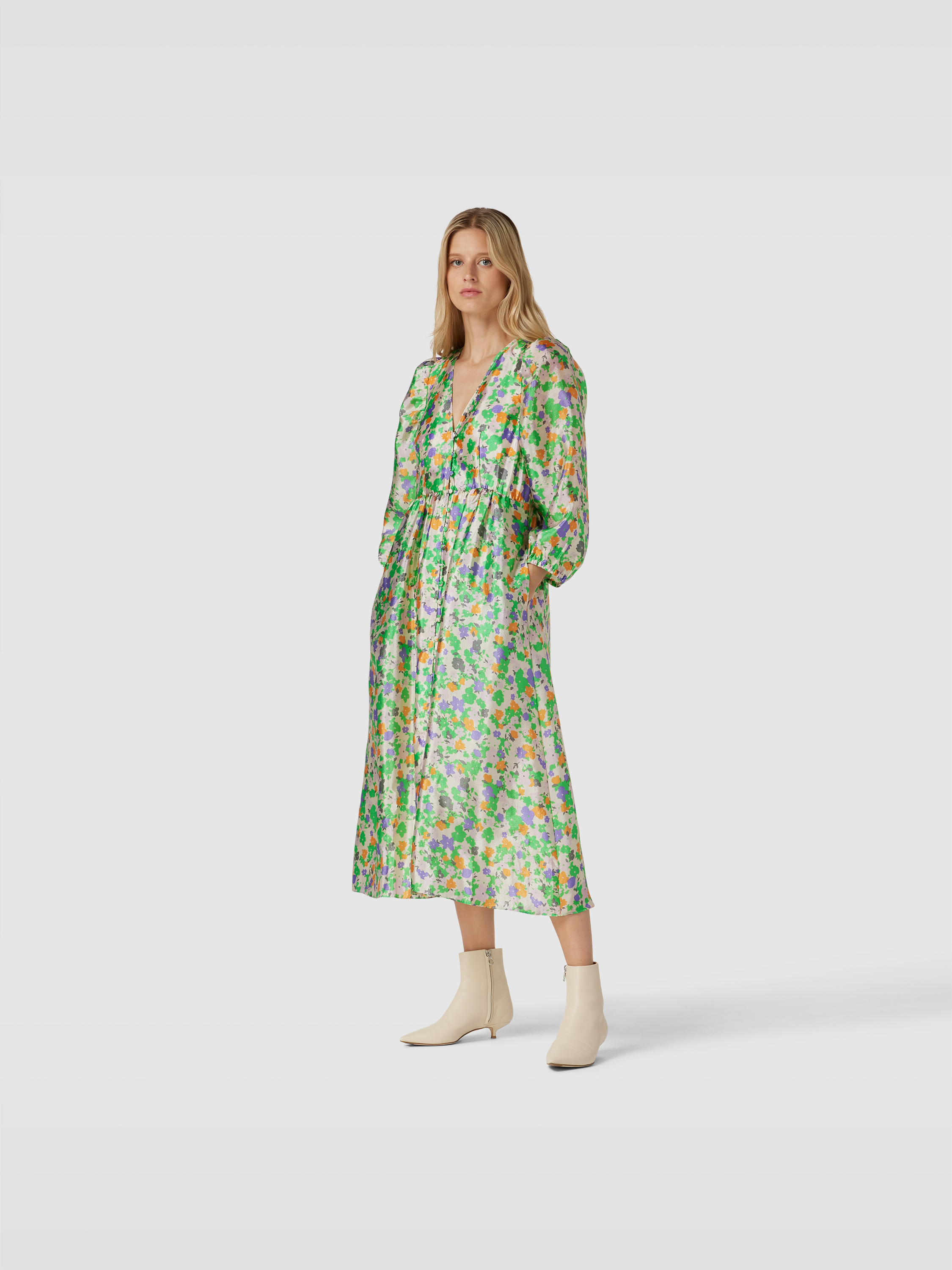 Das Damen Midikleid von Baum und Pferdgarten fällt durch seine lockere Passform angenehm weich und luftig. Ballonärmel und florales Muster setzen einen lebendigen Akzent, während der V-Ausschnitt für eine dezente, feminine Note sorgt. So eignet sich das Midikleid mit Ballonärmeln vielseitig für unterschiedliche Gelegenheiten.
