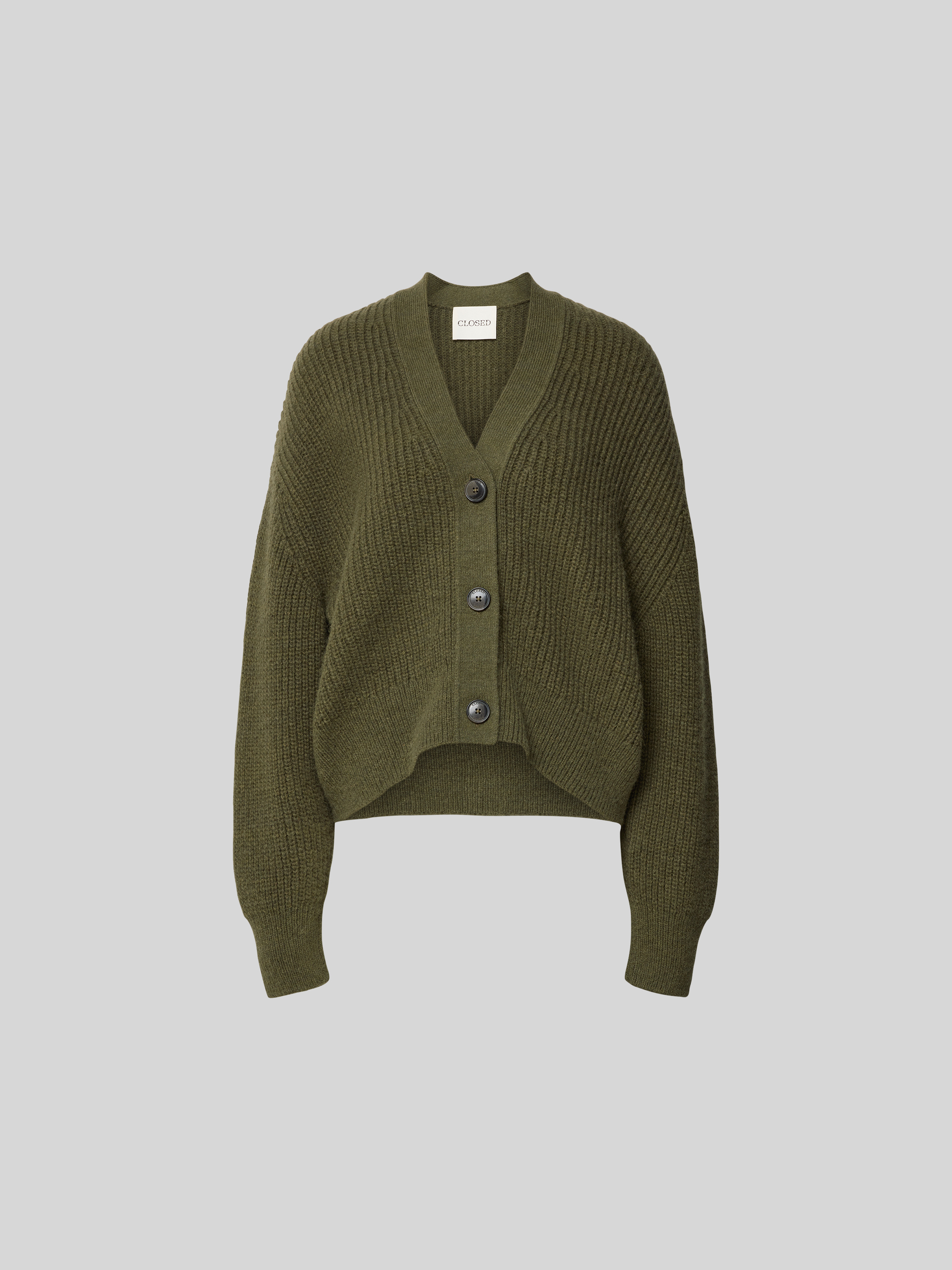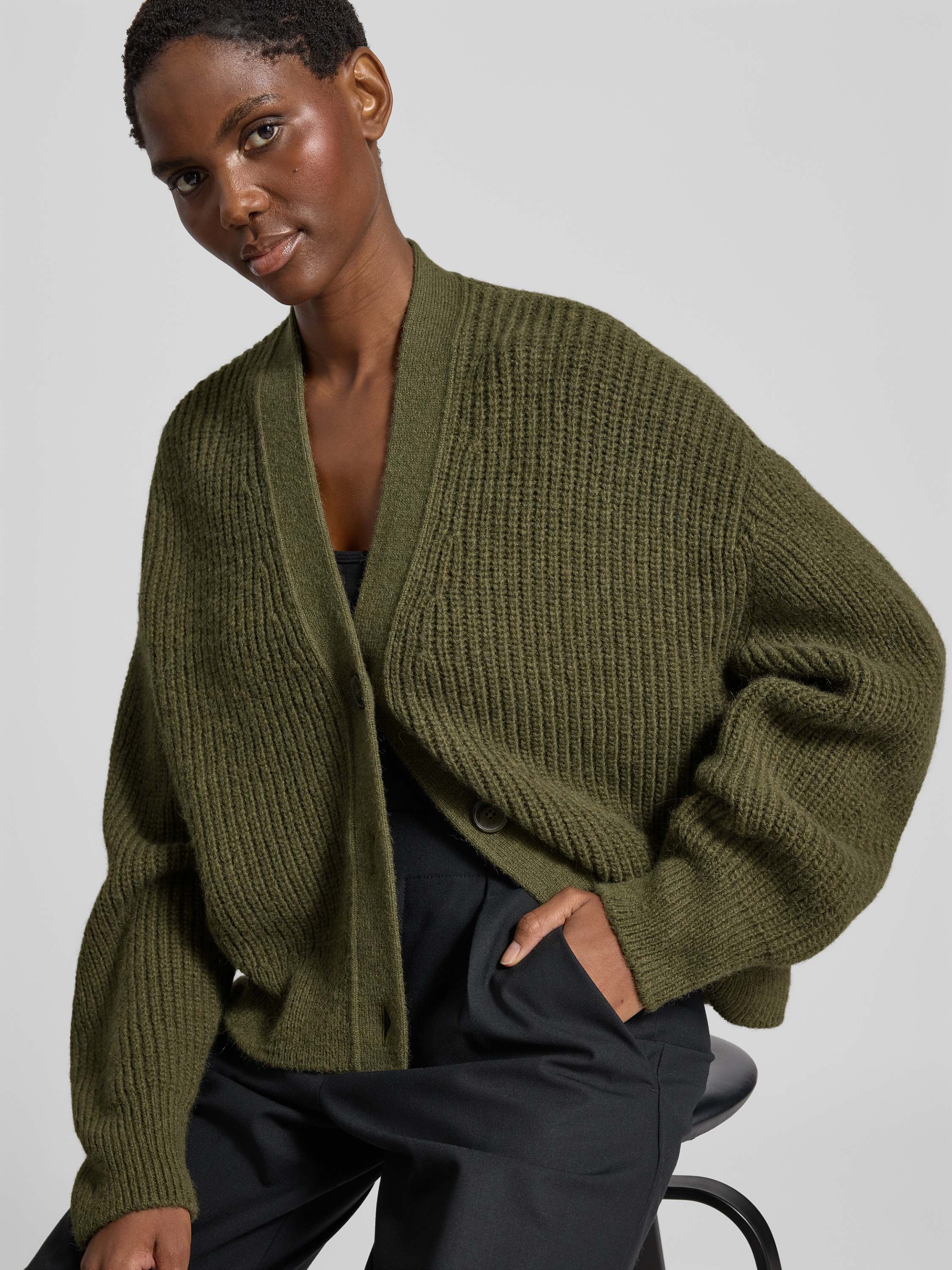 Der Closed Cardigan aus einem luxuriösen Alpaka-Woll-Mix umhüllt einen in einem gemütlichen Oversized-Schnitt. Mit seinem charmanten V-Ausschnitt und den überschnittenen Schultern entsteht ein legerer Look, der sich angenehm anfühlt. Die dezente Rückenlänge betont zudem sanft die Silhouette.