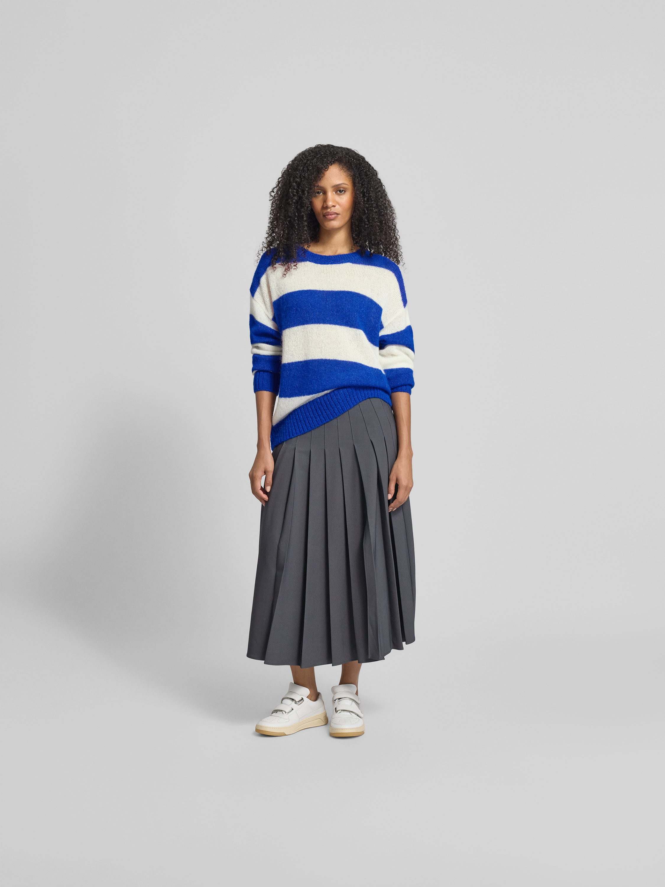 Der Pullover von Closed fällt durch seinen Oversized-Schnitt angenehm locker und schafft damit Bewegungsfreiheit im Alltag. Ein Woll-Alpaka-Mix sorgt für ein weiches Tragegefühl, das auch an kühleren Tagen angenehm wärmt. Die gerippten Abschlüsse und der Rundhalsausschnitt runden das Design unaufdringlich ab.