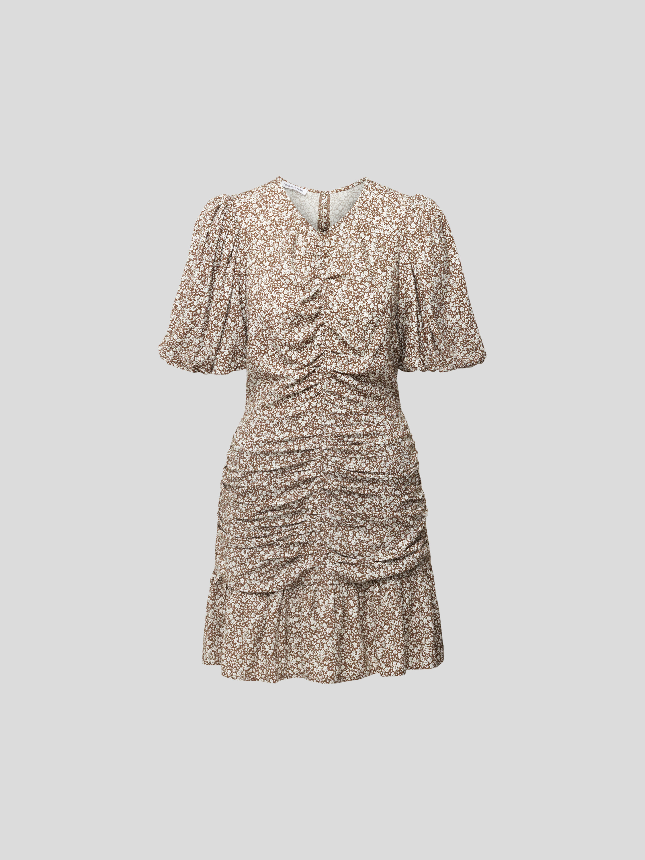 Das Damen Minikleid von Designers Remix aus reiner Viskose legt sich durch den taillierten Schnitt angenehm an die Silhouette und bringt das Allover-Muster wirkungsvoll zur Geltung. Kurze Ärmel sorgen für Leichtigkeit, während der Hakenverschluss das Anziehen unkompliziert gestaltet. So lässt sich das Minikleid vielseitig in den Alltag integrieren.