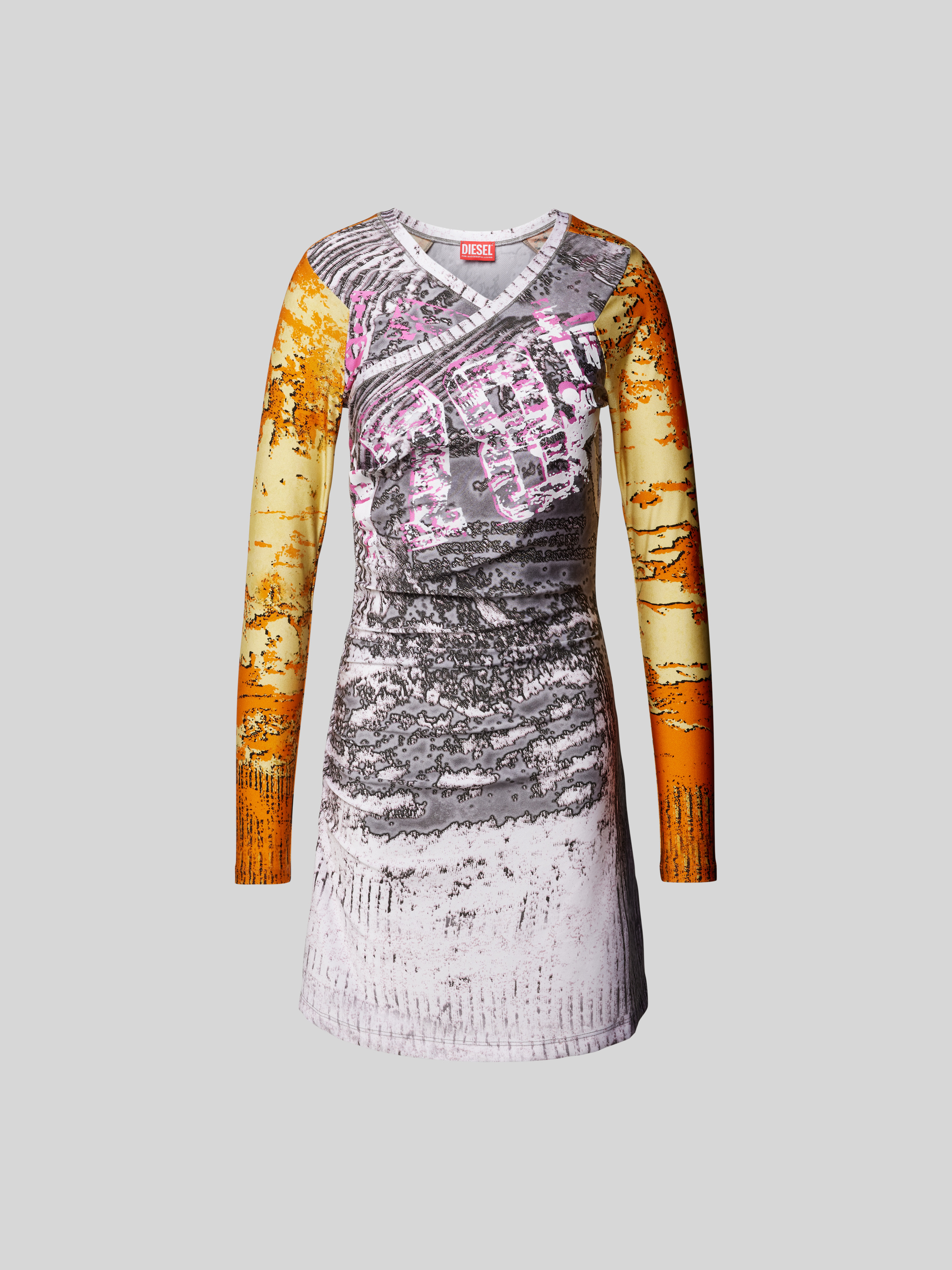 Das Diesel Minikleid mit V-Ausschnitt liegt durch den taillierten Schnitt angenehm an und ermöglicht vielseitige Kombinationen für unterschiedliche Anlässe. Dank des Stretch-Anteils im Material-Mix bleibt Bewegungsfreiheit erhalten, während das langärmelige Design auch an kühleren Tagen Komfort schenkt. So lässt sich unkompliziert ein moderner Look gestalten.