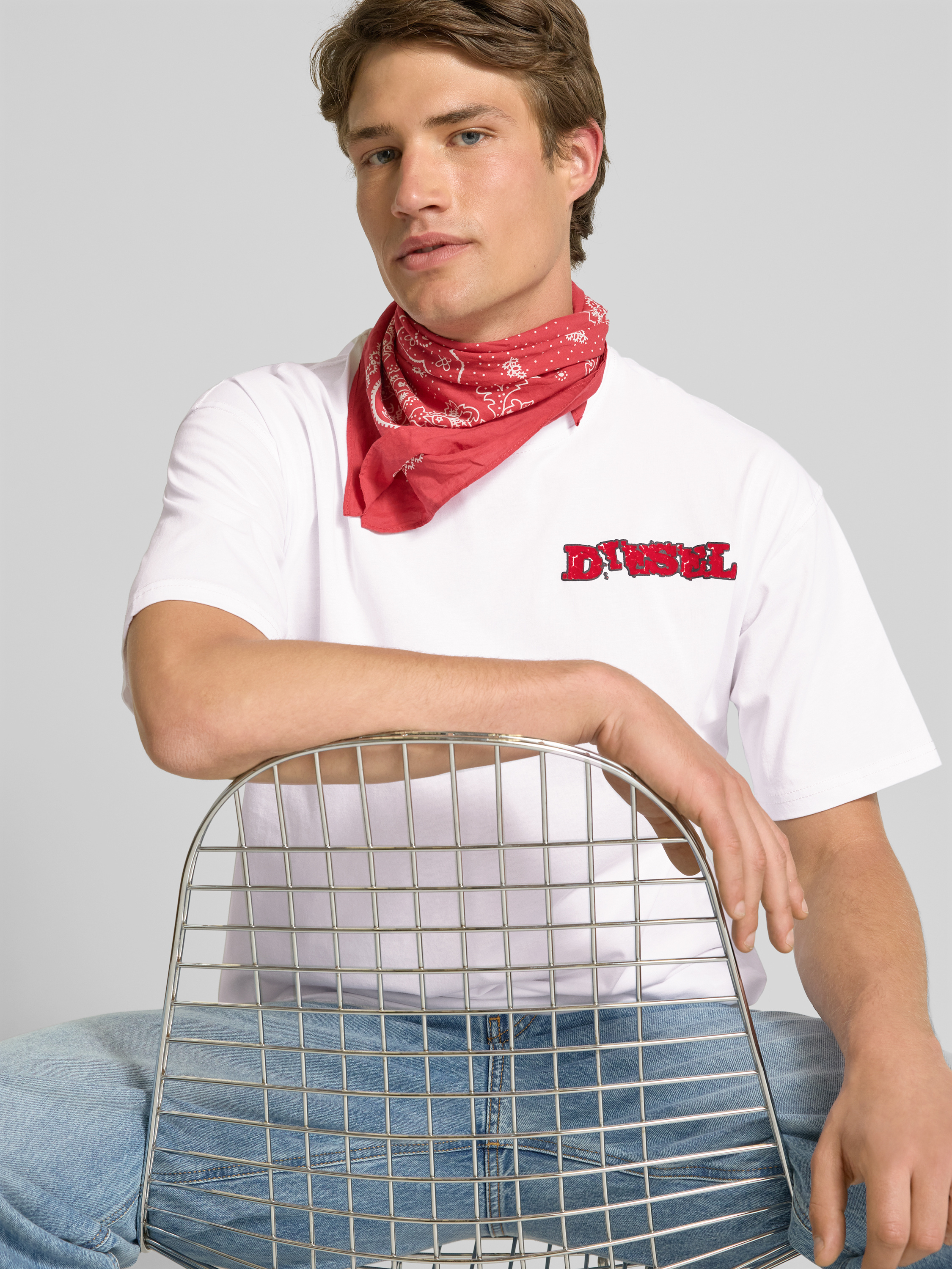 Das Herren T-Shirt von Diesel, aus reiner Baumwolle gefertigt, bietet eine angenehme Passform im Regular Fit. Der markante Label-Print verleiht dem Oberteil eine unverwechselbare Note, während der gerippte Rundhalsausschnitt für zusätzlichen Komfort sorgt. Ein vielseitiger Begleiter für viele Gelegenheiten.