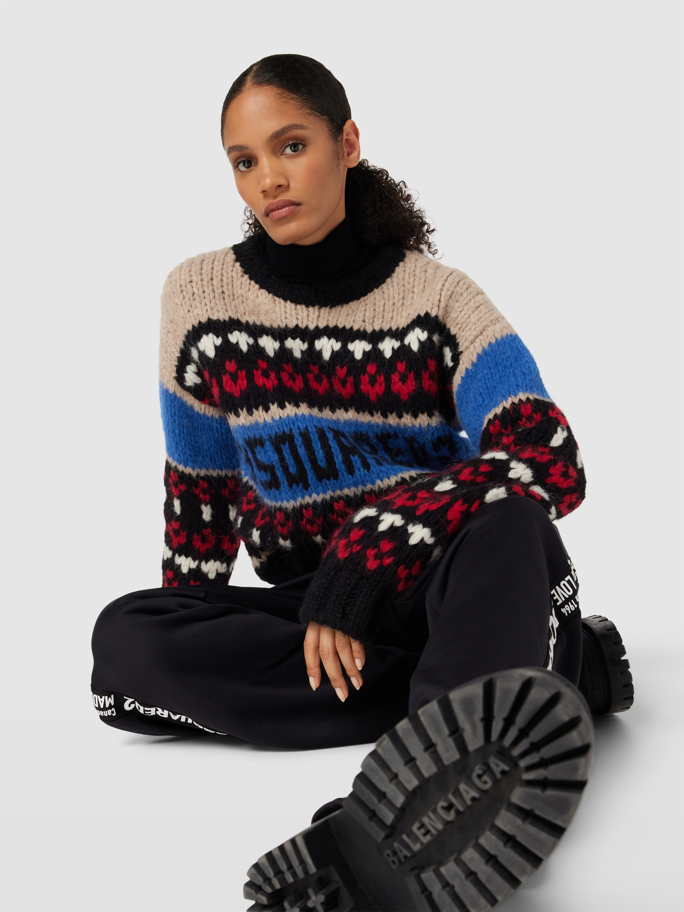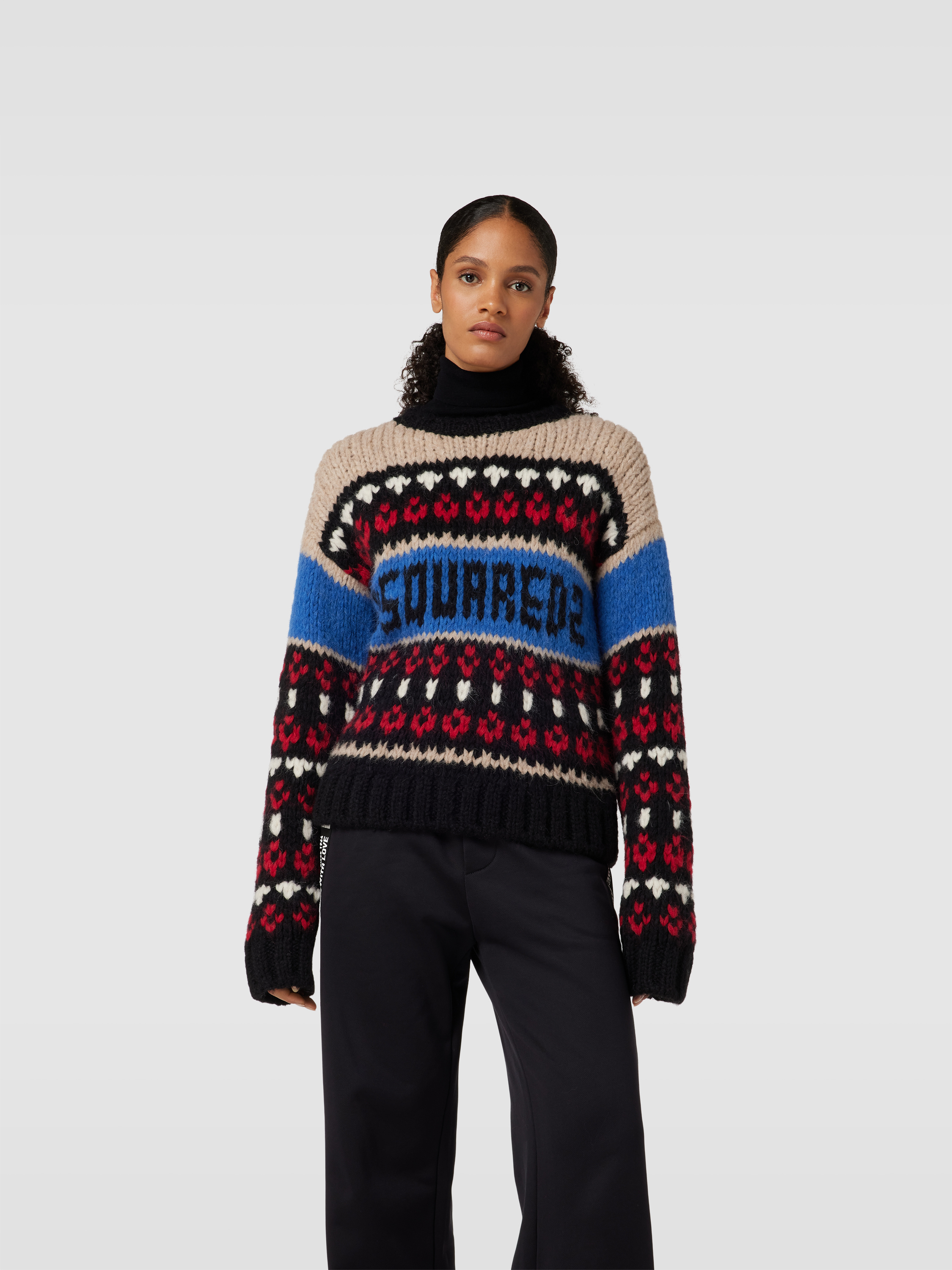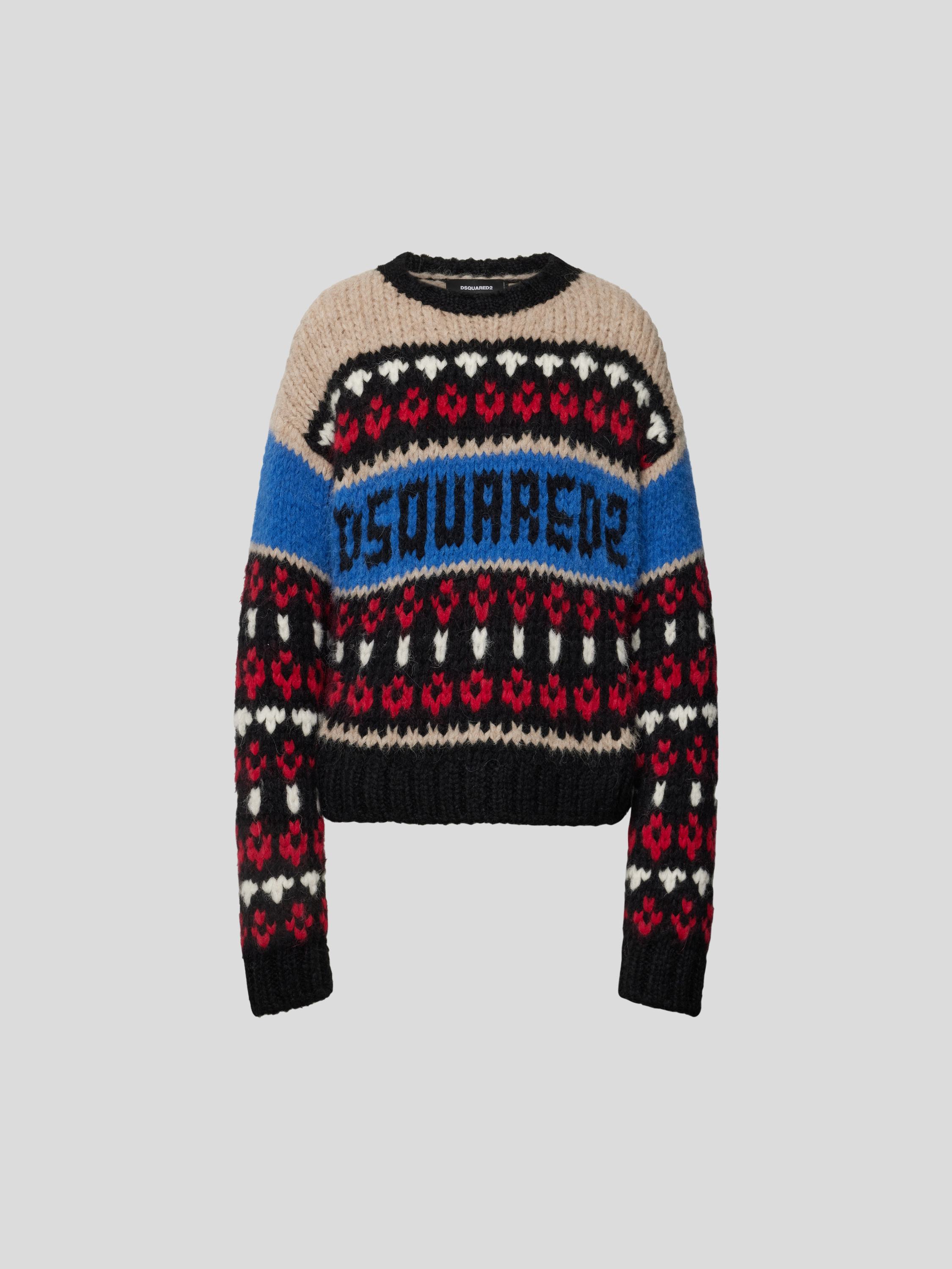 Der Damen Pullover von Dsquared2 aus Alpaka-Mix präsentiert sich mit lockerer Passform und einem markanten Allover-Muster. Durch die Strick-Optik erhält das Modell eine angenehm strukturierte Oberfläche, während das dezente Label-Detail einen modernen Akzent setzt. So eignet sich der Pullover in Strick-Optik für vielseitige Kombinationen.