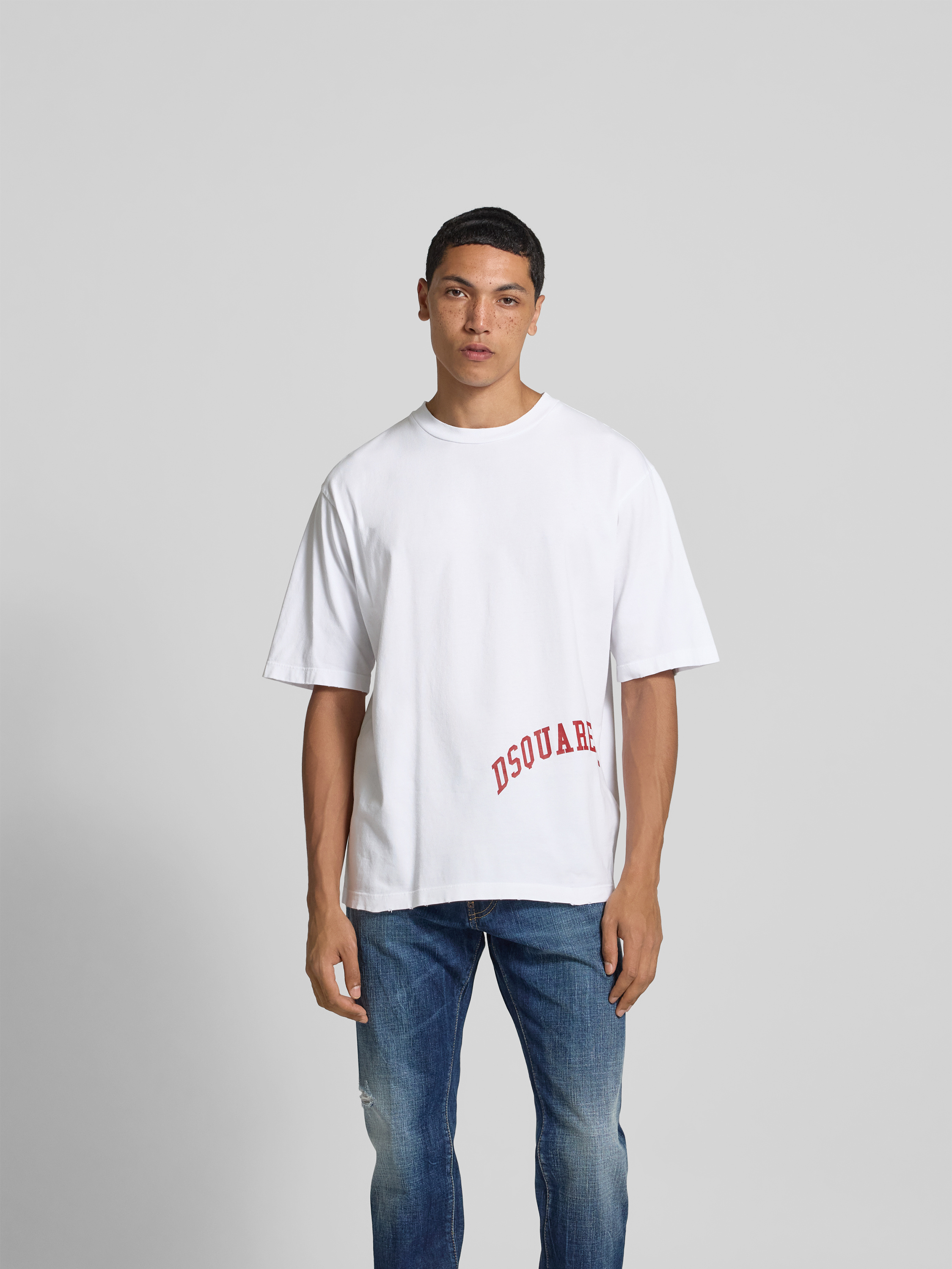 Das Herren T-Shirt von Dsquared2 zeigt sich mit einem lockeren Schnitt, der viel Bewegungsfreiheit zulässt und im Alltag angenehm sitzt. Durch die reine Baumwolle fühlt sich das Material weich auf der Haut an und sorgt für ein angenehmes Tragegefühl. Der markante Label-Print bringt einen modernen Akzent ins Outfit, während der gerippte Rundhalsausschnitt den sportlichen Charakter unterstreicht.