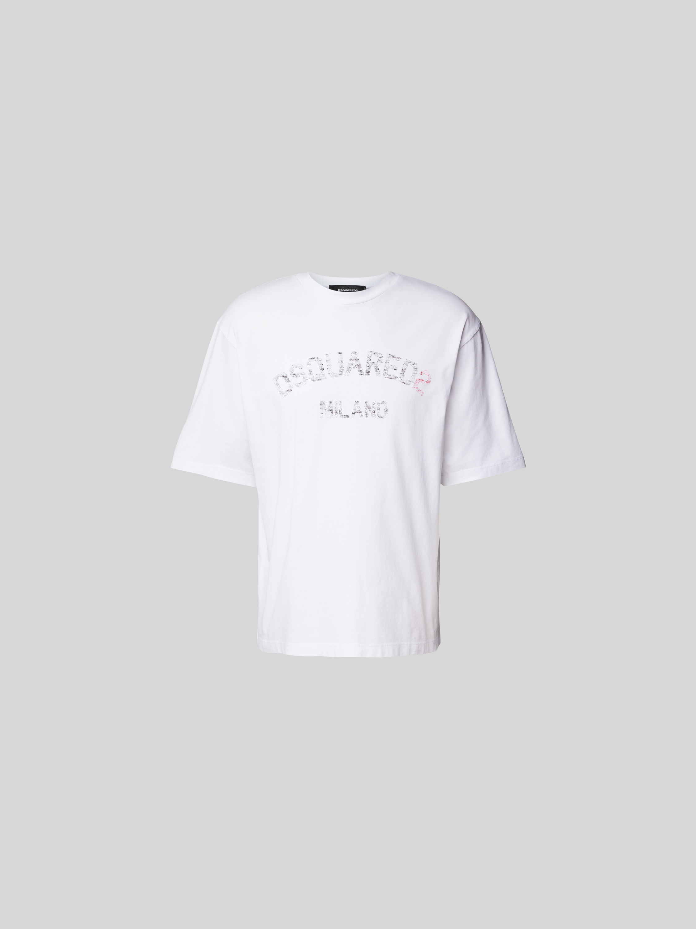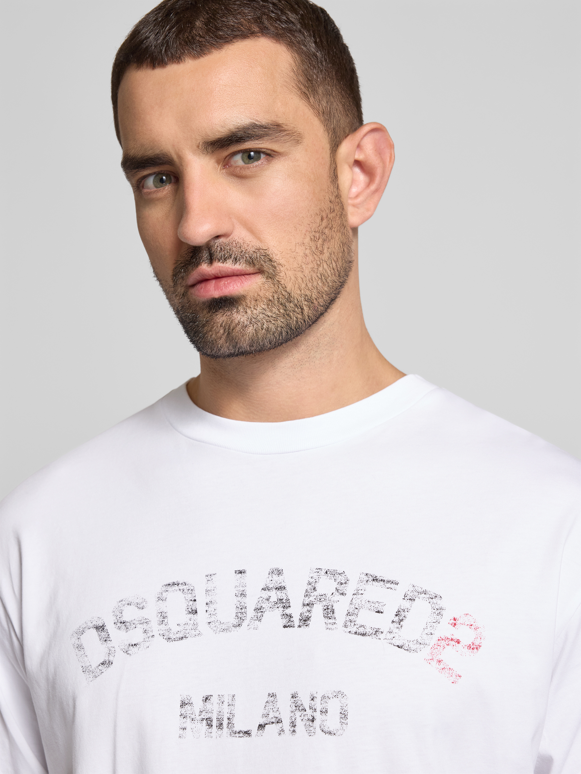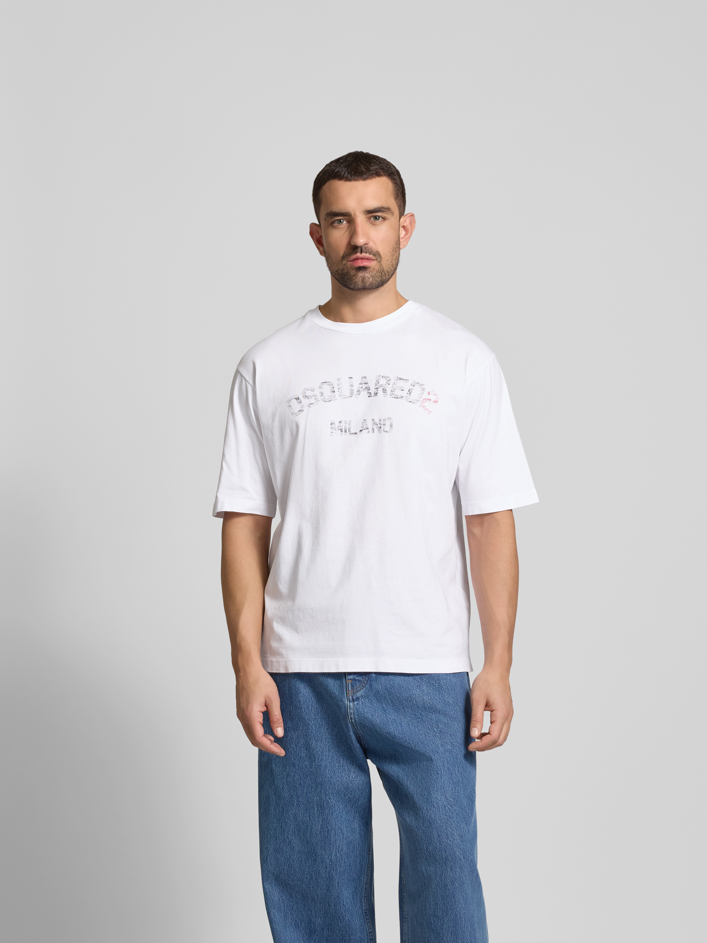 Das Herren T-Shirt von Dsquared2, gefertigt aus reiner Baumwolle, überzeugt durch seinen lockeren Schnitt, der eine bequeme Passform bietet. Der gerippte Rundhalsausschnitt ergänzt das Design, während der markante Label-Print auf der Vorderseite einen modernen Akzent setzt. Ideal für lässige Freizeitoutfits.