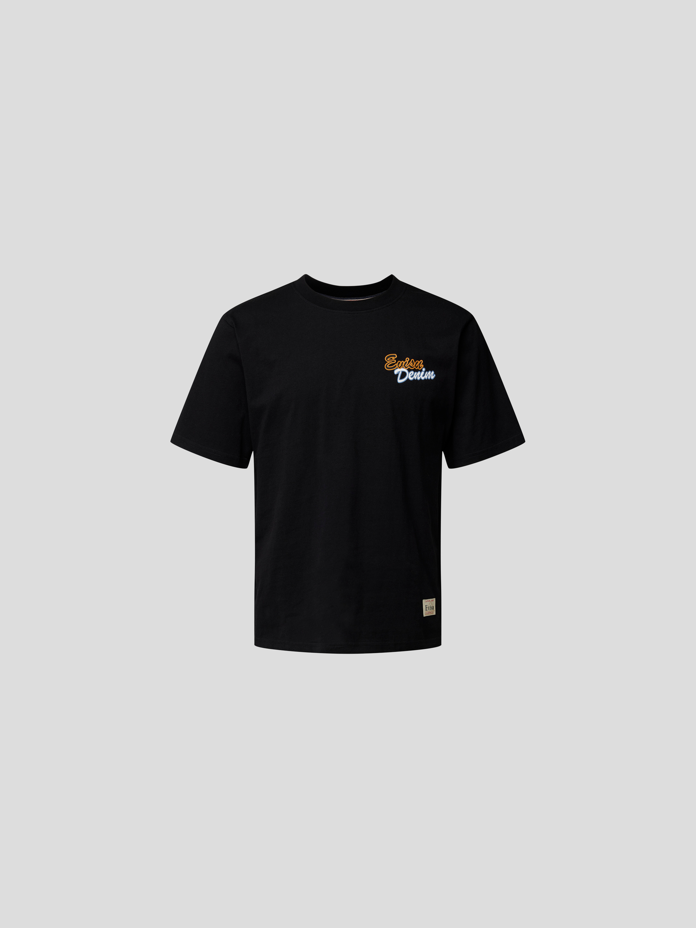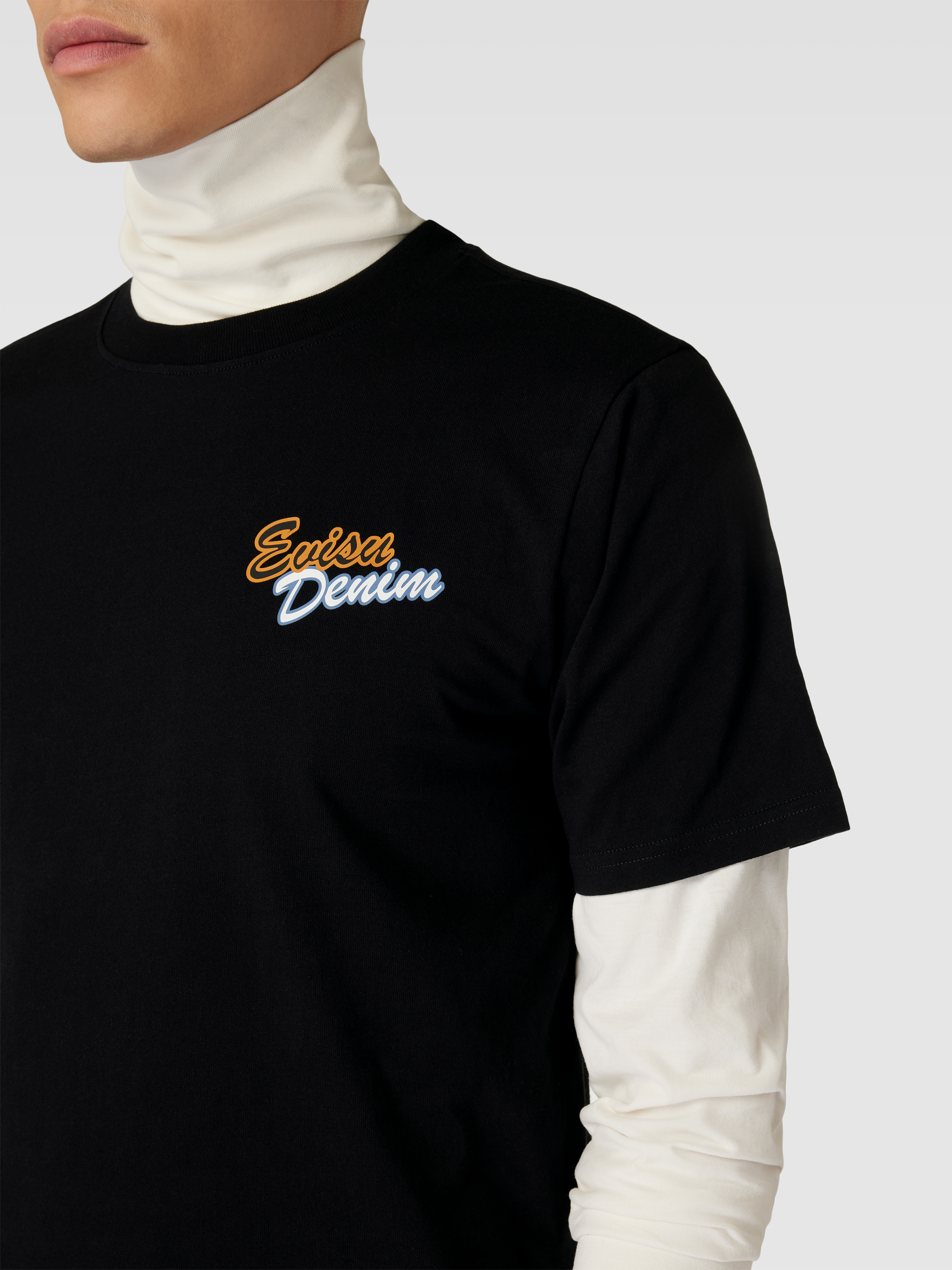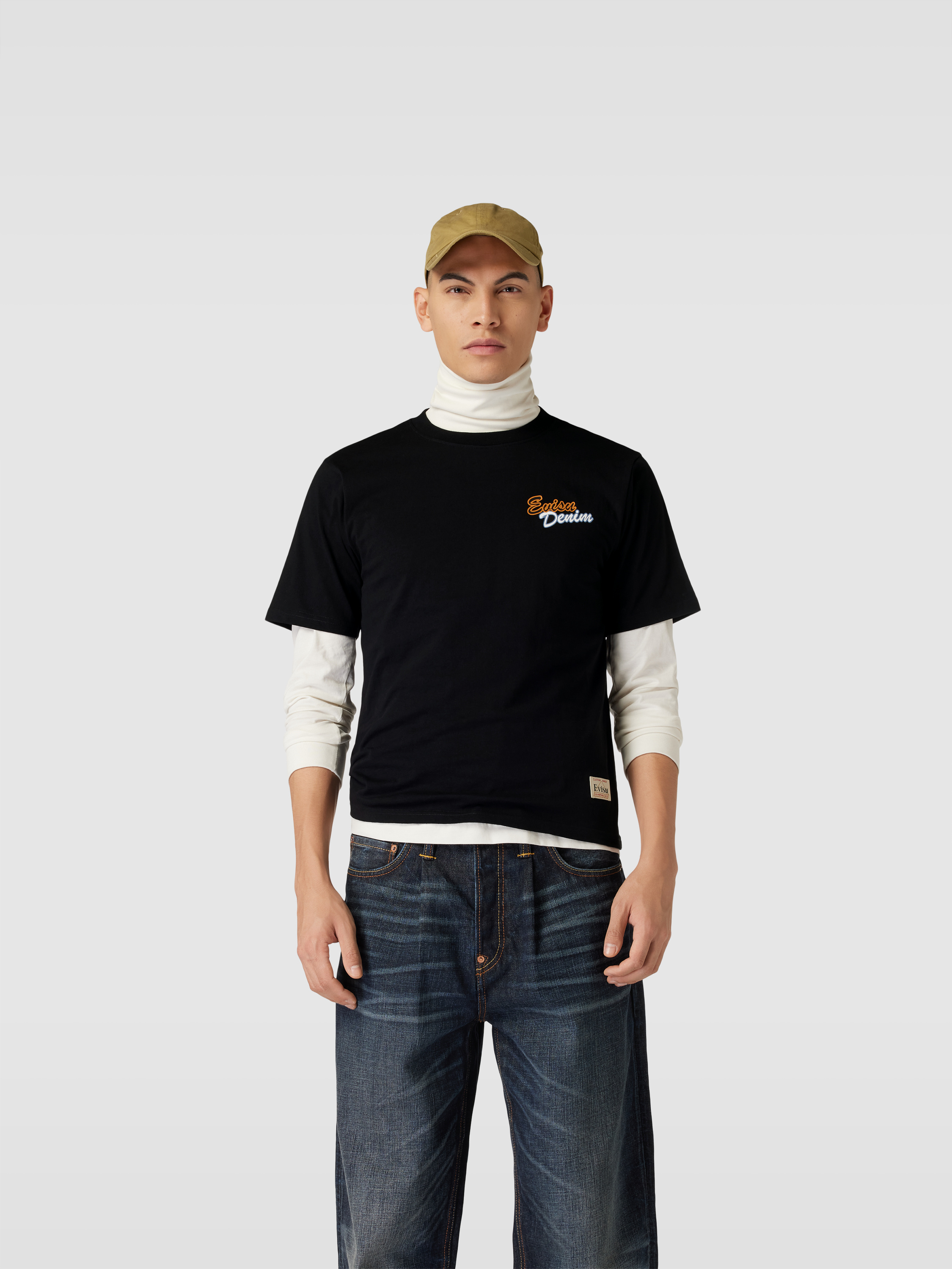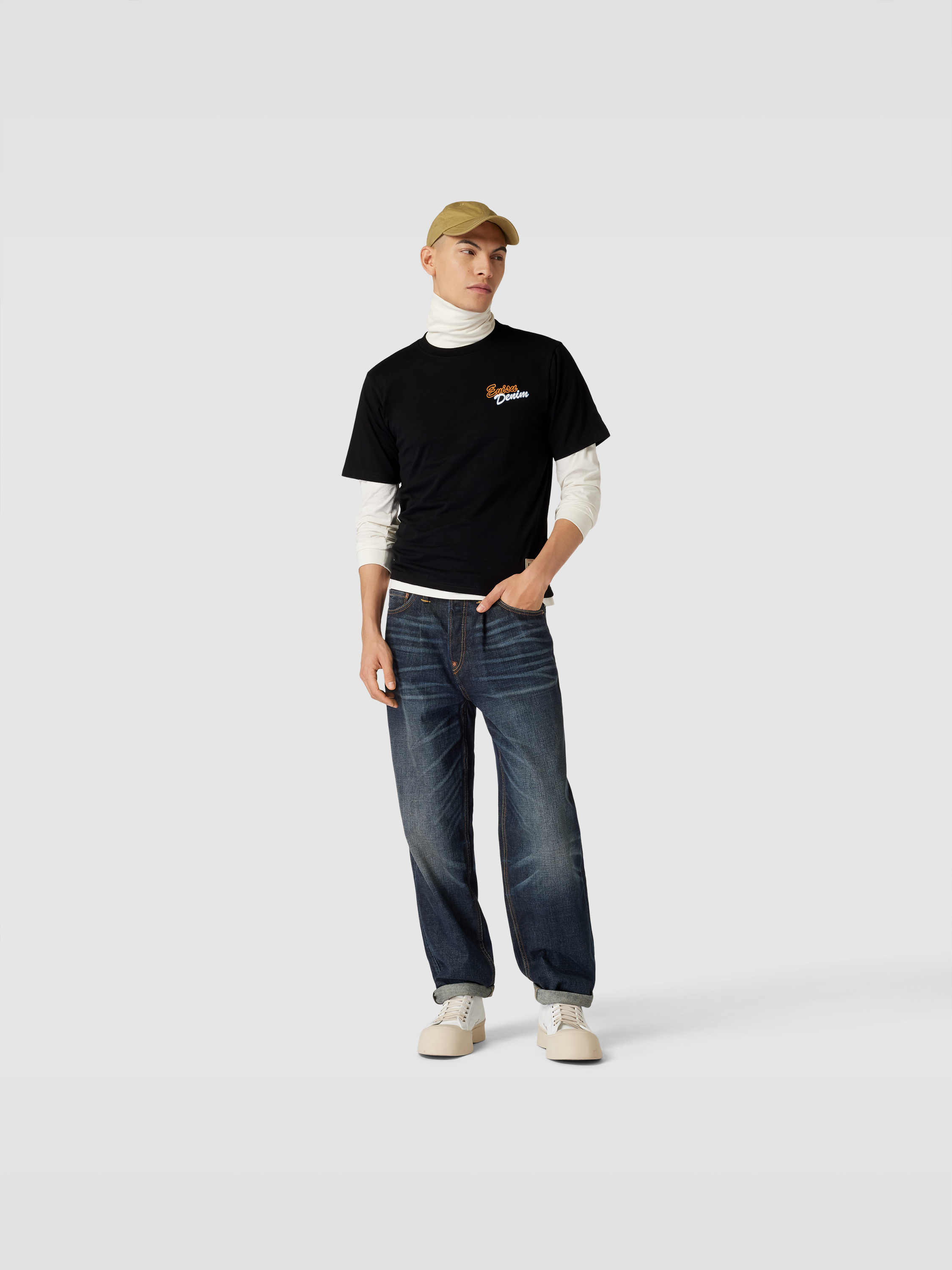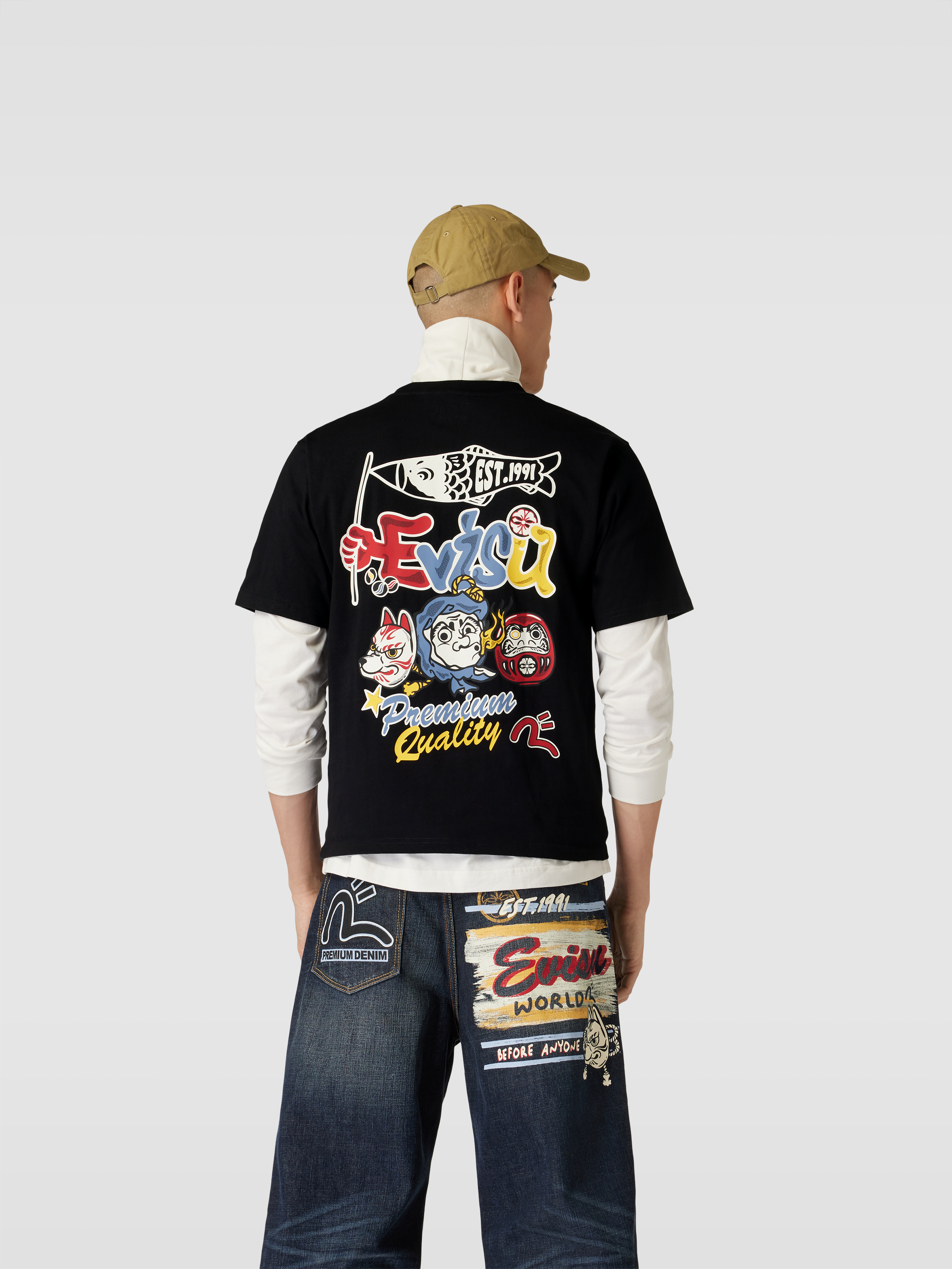 Das Herren T-Shirt von Evisu zeichnet sich durch reine Baumwolle und einen angenehm geraden Schnitt aus, wodurch es sich besonders für entspannte Alltagsmomente eignet. Ein klarer Label-Print auf unifarbenem Grund verleiht dem Oberteil einen markanten Akzent. Dank des klassischen Rundhalsausschnitts sitzt das Shirt bequem und unkompliziert.