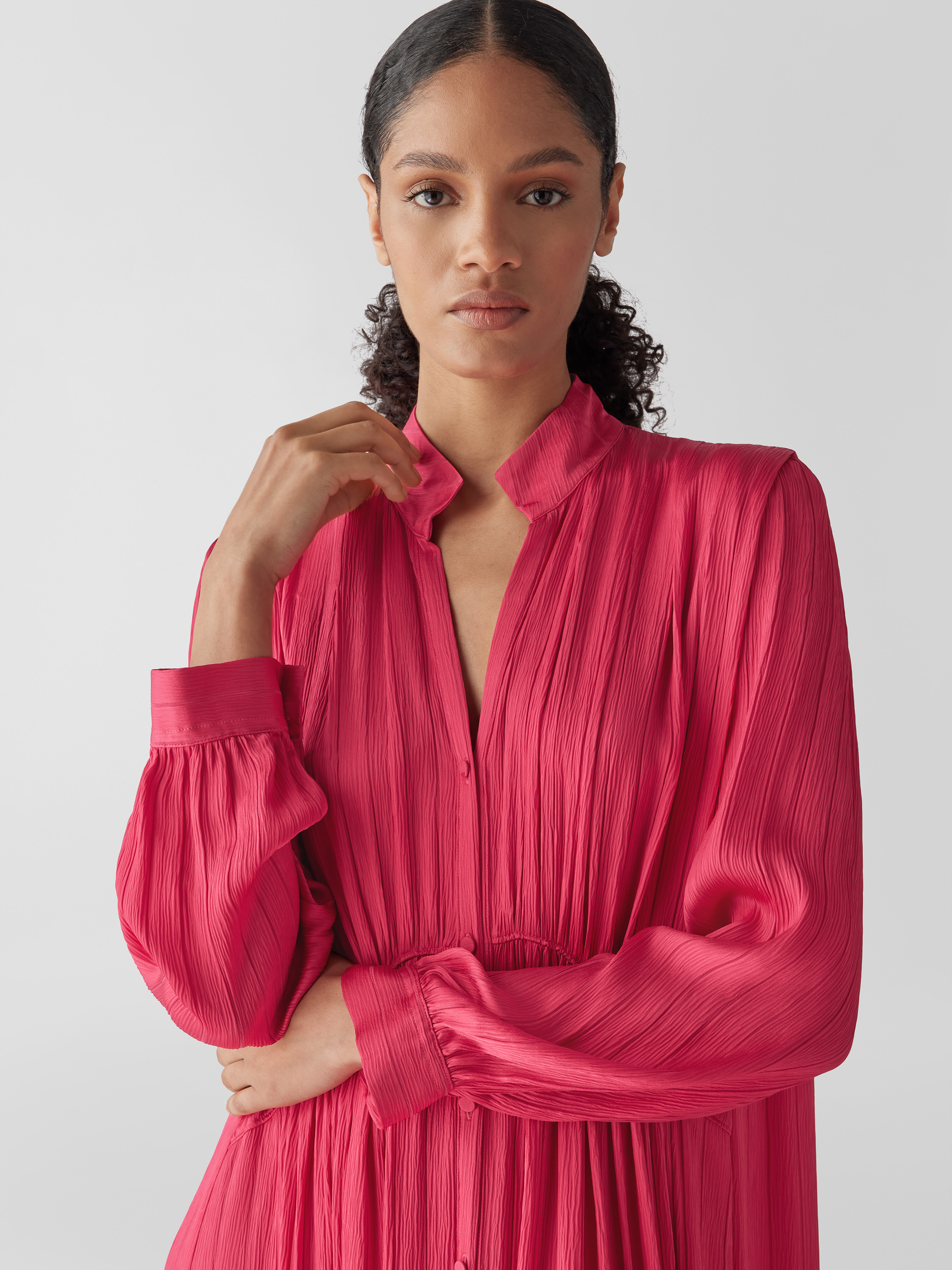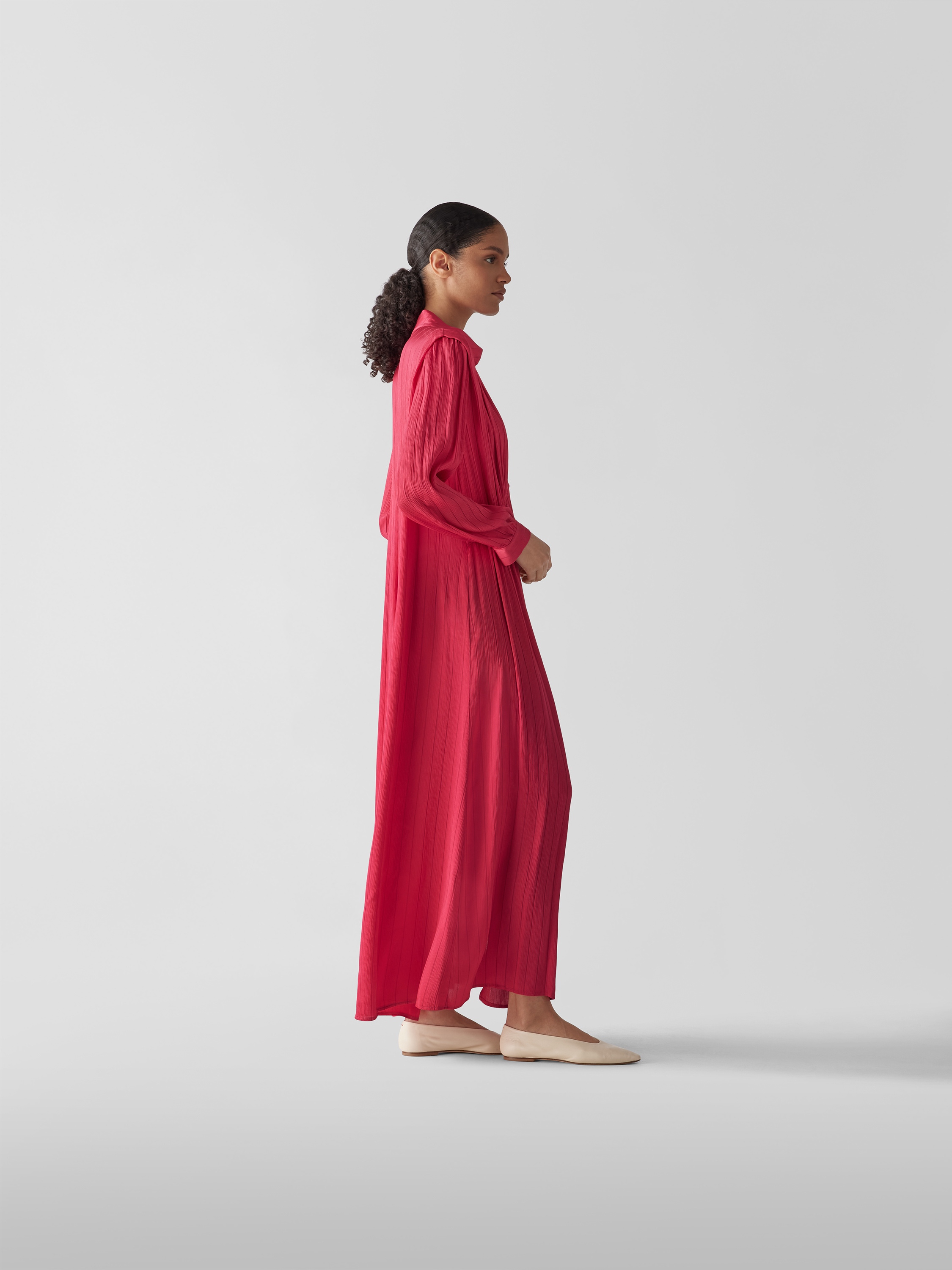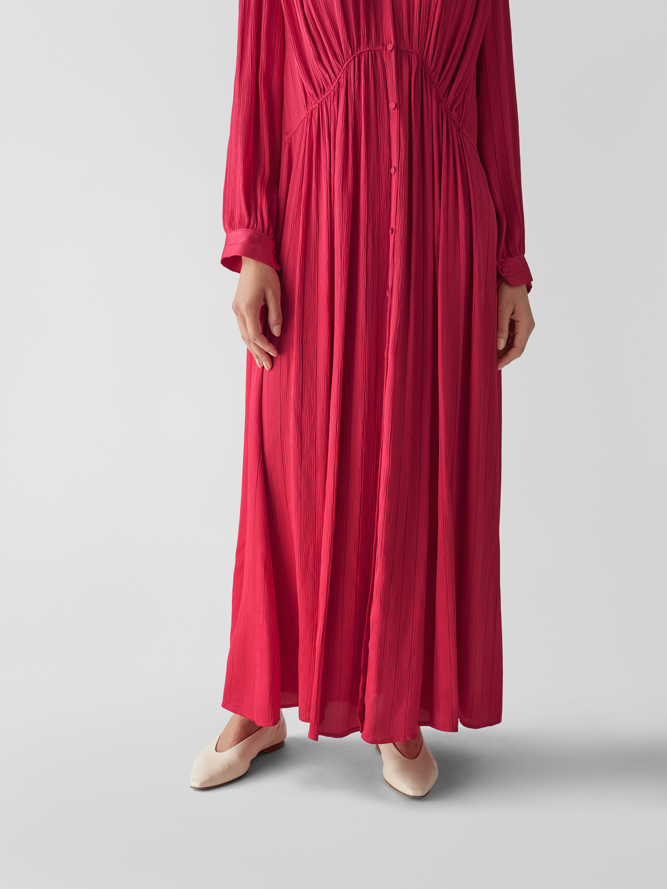 Das Maxikleid von Forte Forte fällt durch seine lockere Passform und die angenehm fließende Crinkle-Optik auf. Der Anteil an Seide verleiht dem Material eine sanfte Haptik, wodurch es sich auch an warmen Tagen angenehm tragen lässt. Mit Tunikakragen und langen Ärmeln entsteht ein lässiger, vielseitig kombinierbarer Look.